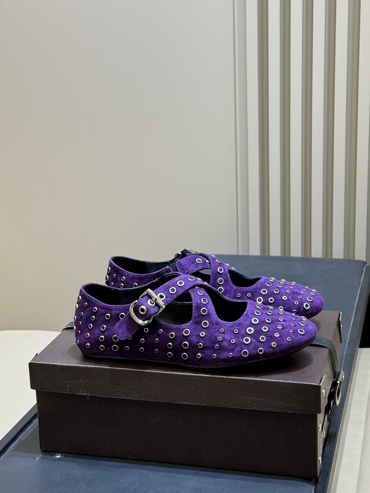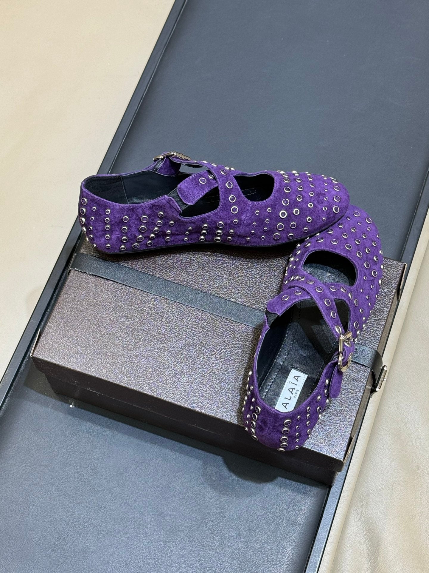 ALAIA 26S CROSS-STRAP FLATS IN PURPLE SUEDE WITH SILVER HARDWARE