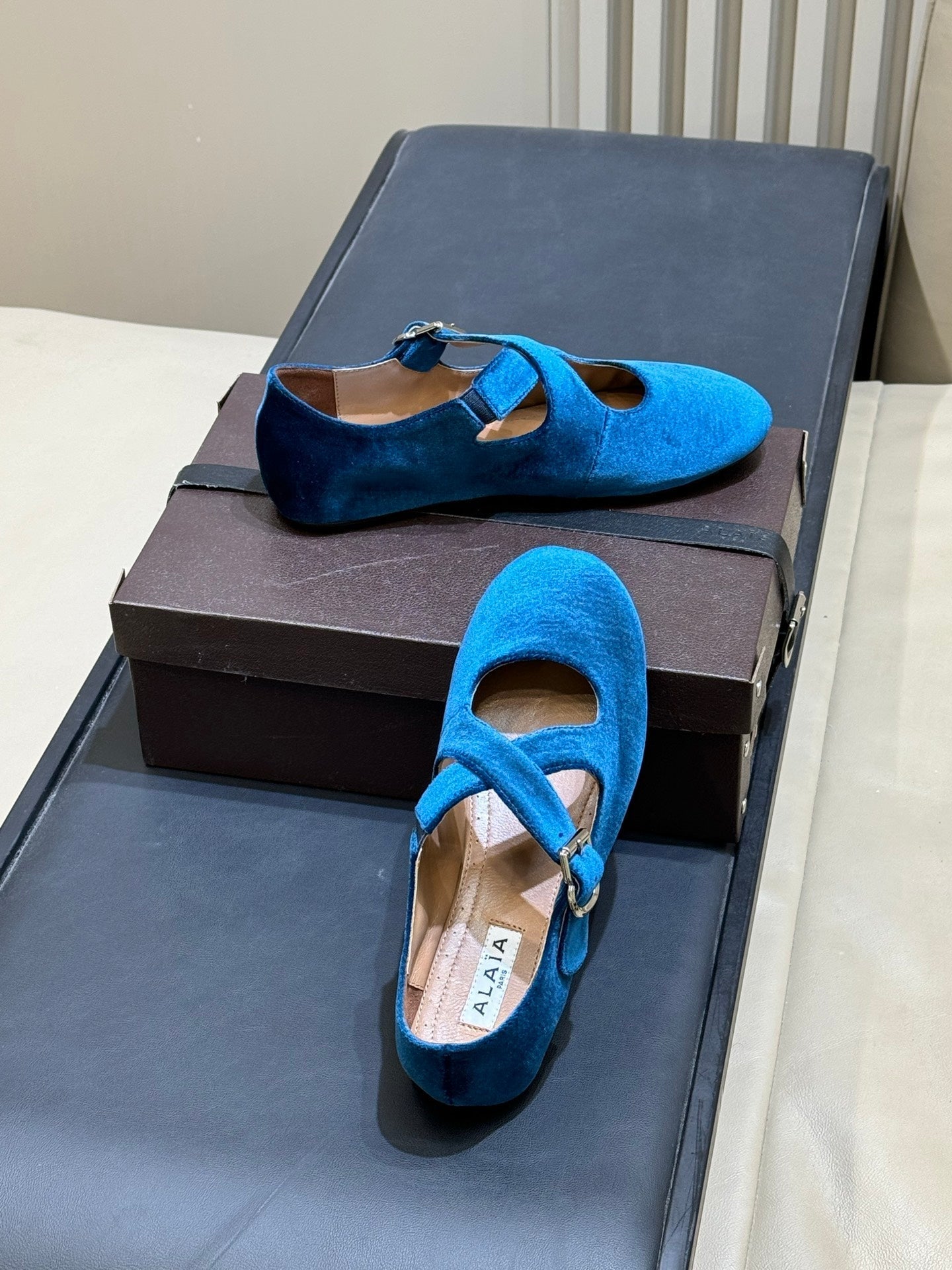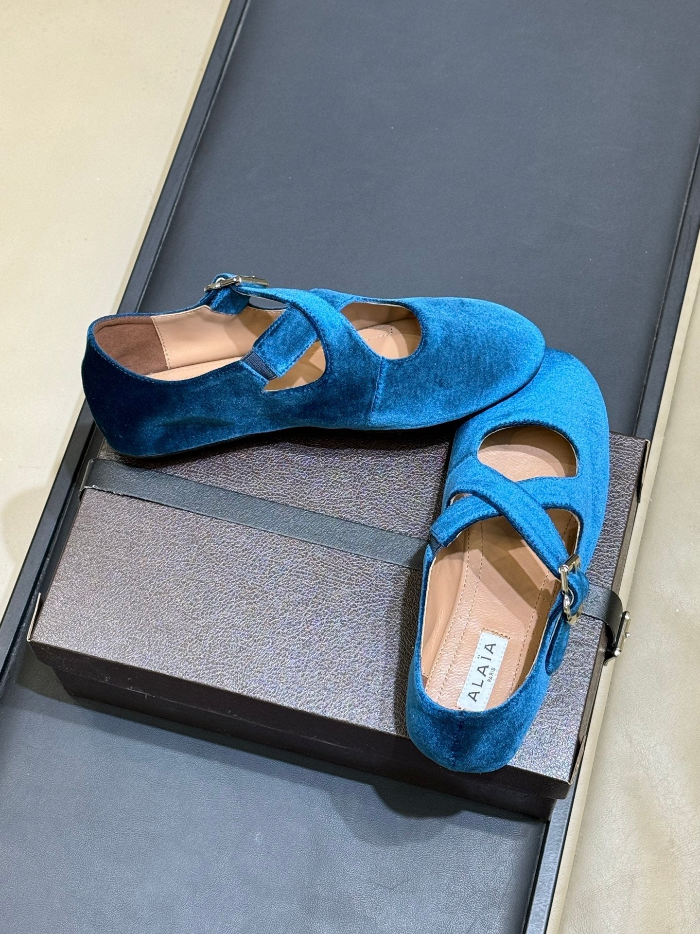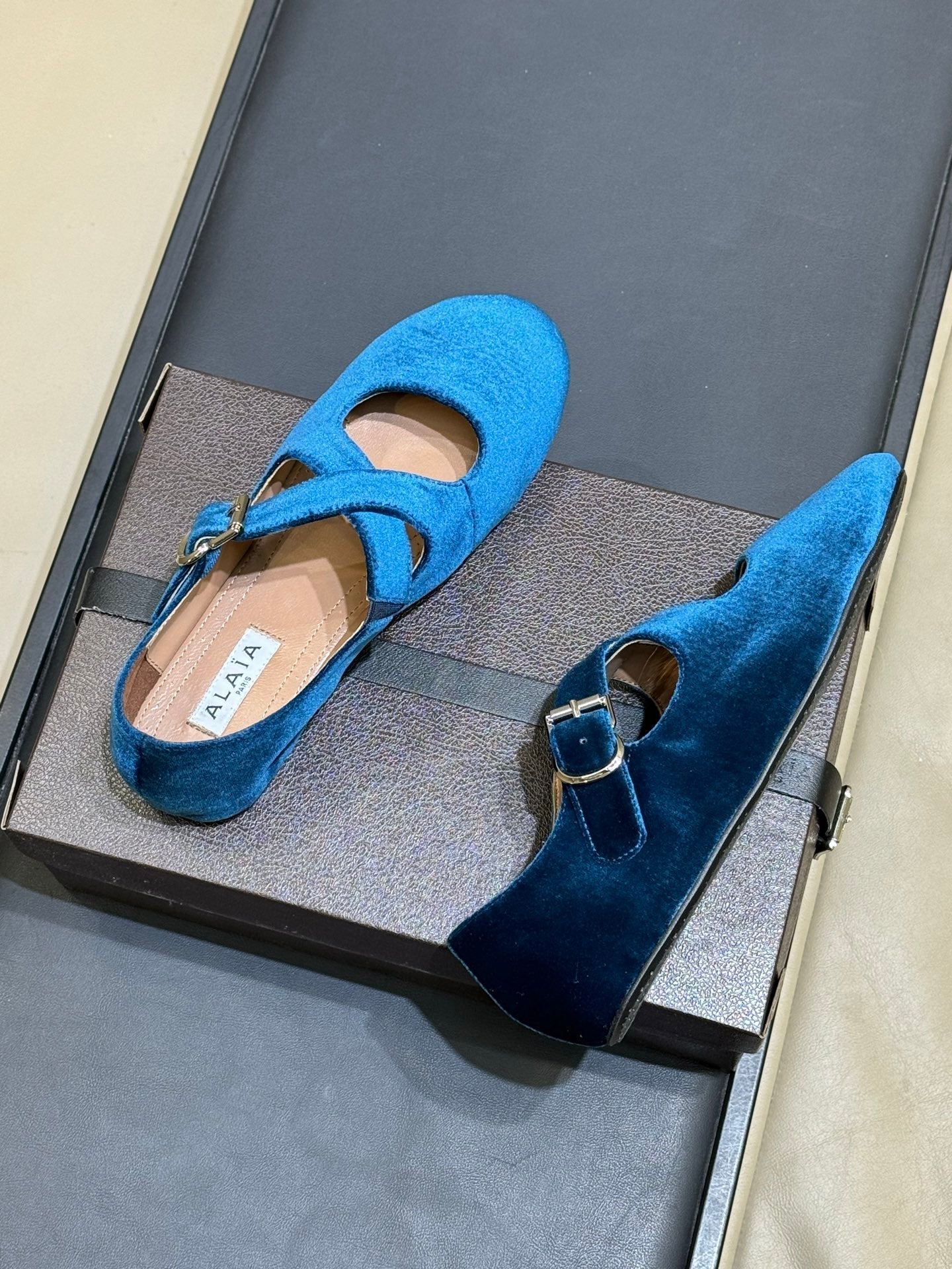 ALAIA 26S MARY JANE BALLET FLATS IN DARK BLUE VELVET