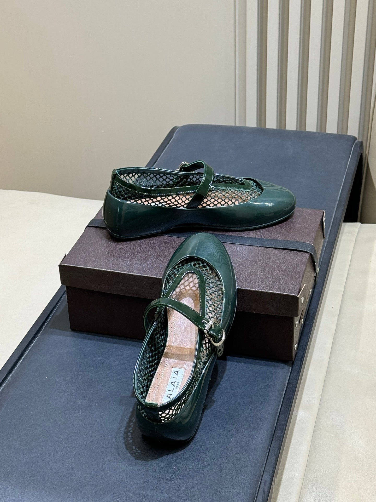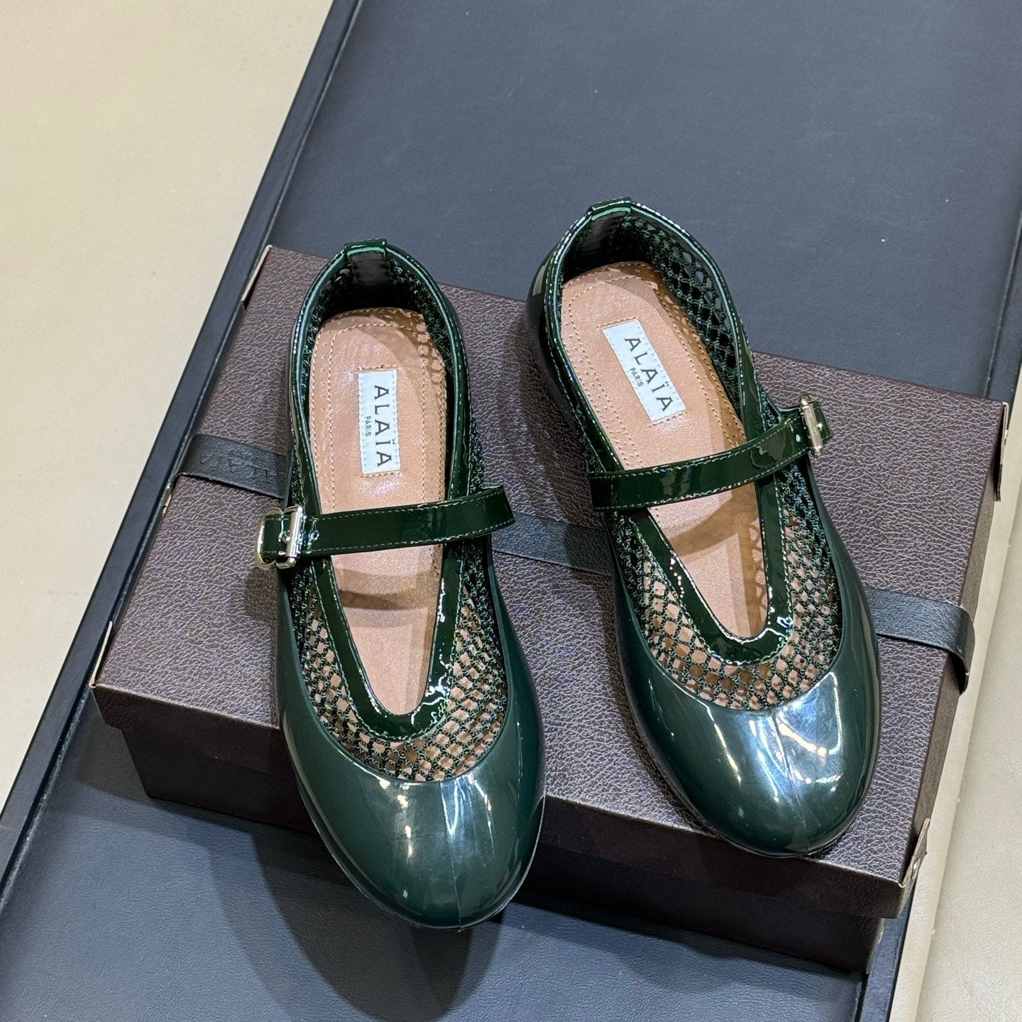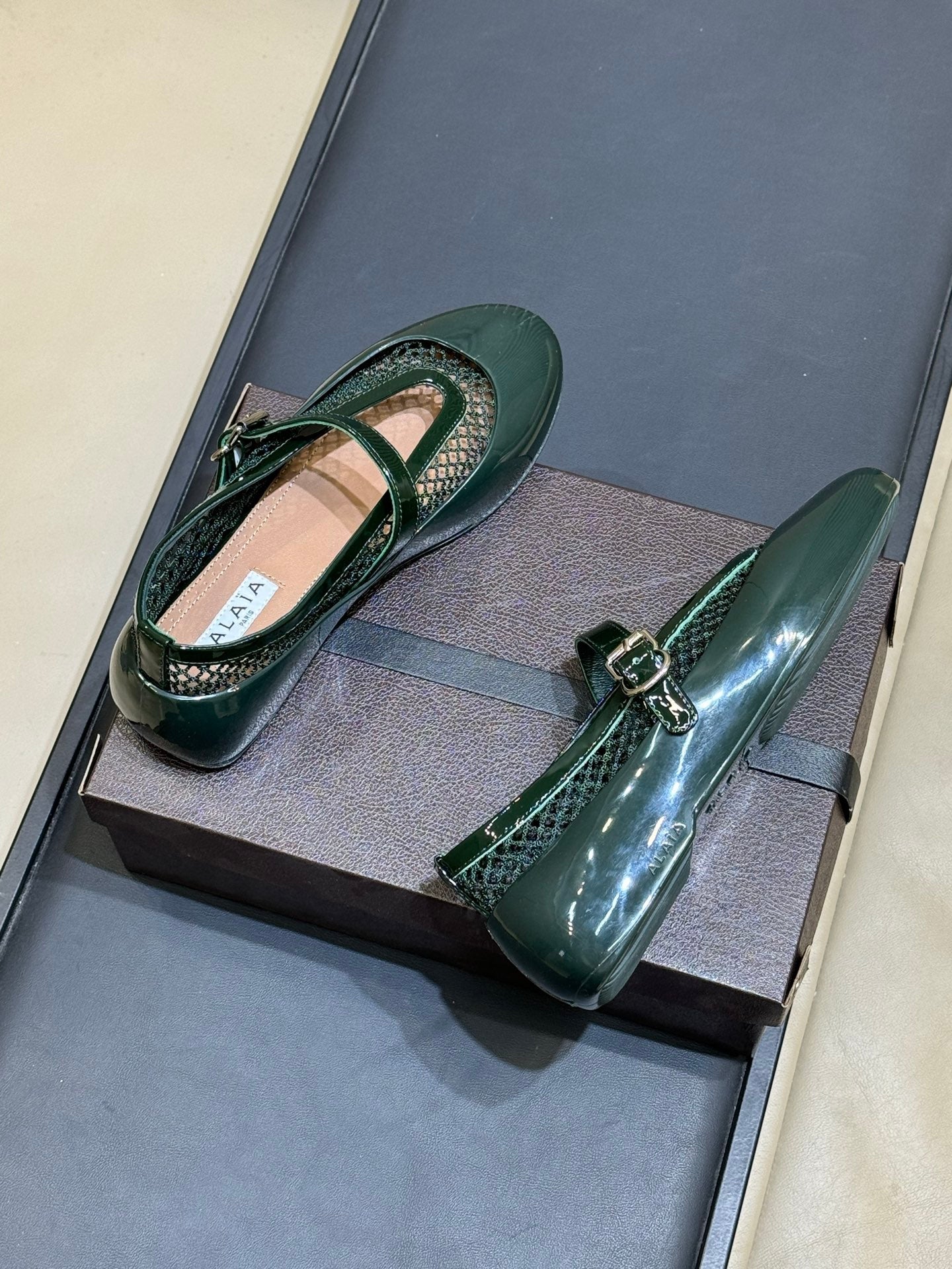 ALAIA 26S MARY JANE BALLET FLATS IN DARK GREEN MESH AND GLOSSY CALFSKIN
