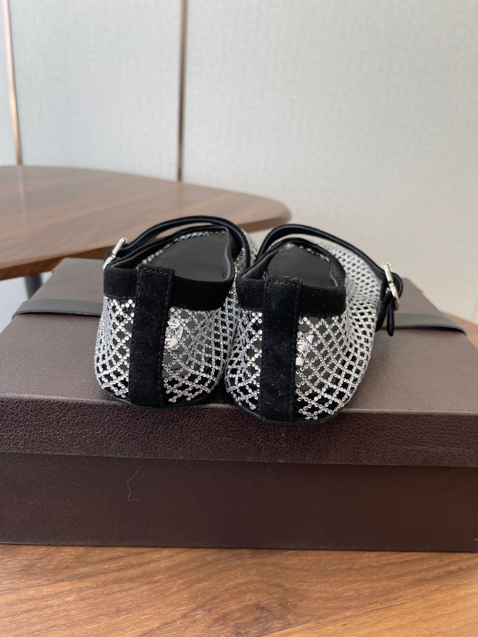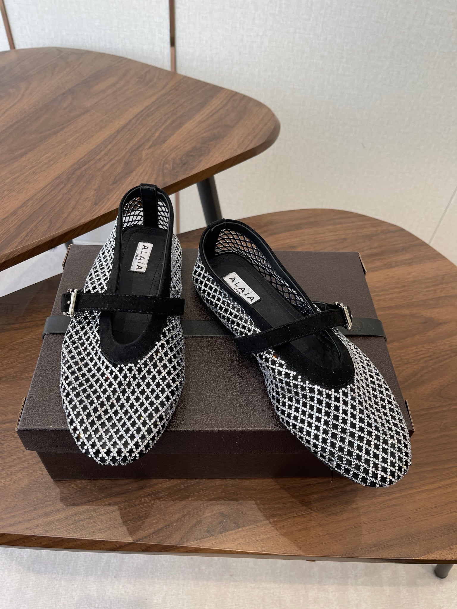 ALAIA 26S MESH FLATS IN BLACK SUEDE AND WHITE RHINESTONE-EMBELLISHED