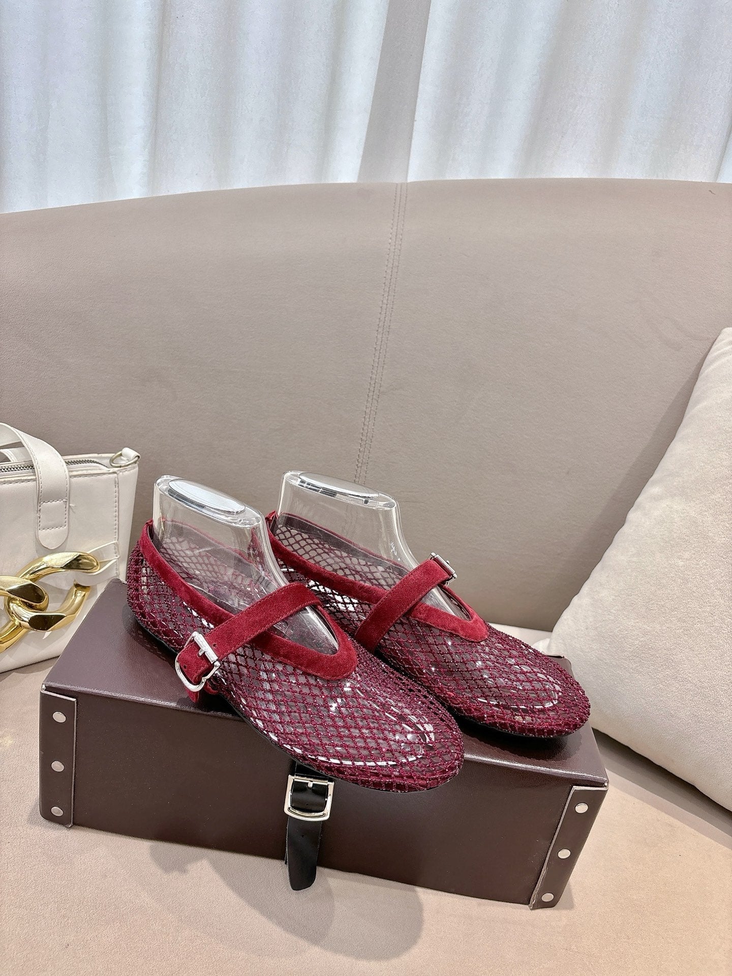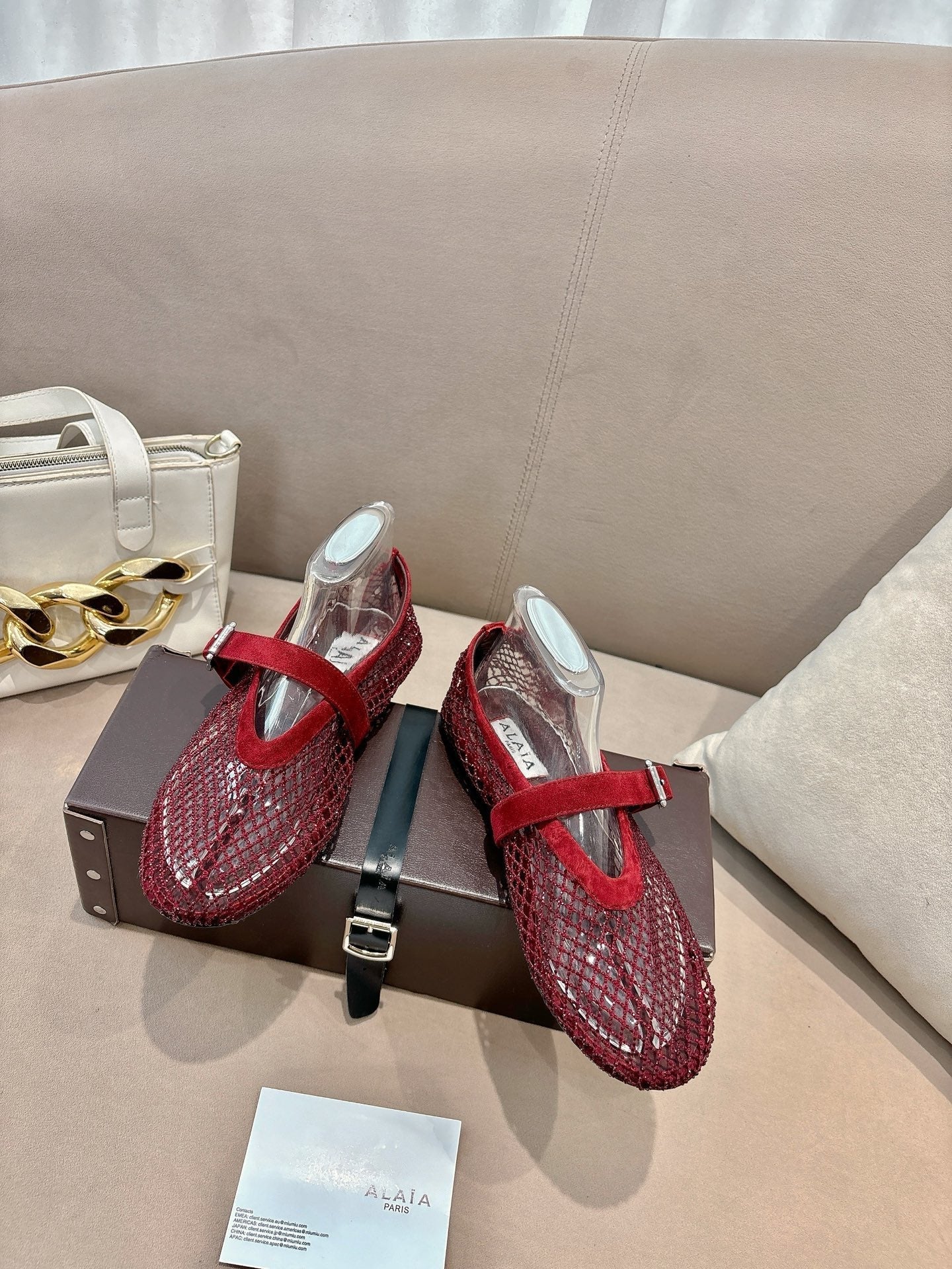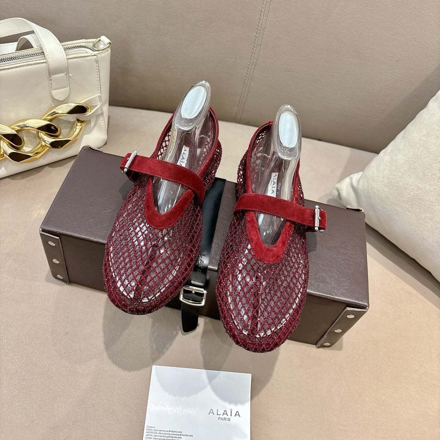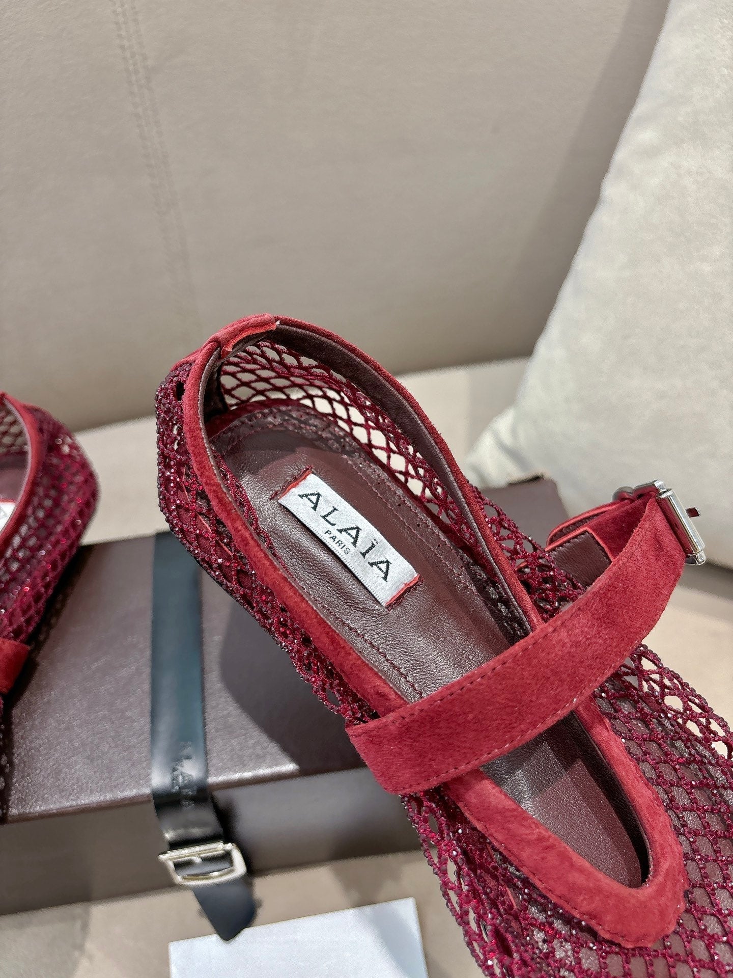 ALAIA 26S MESH FLATS IN DARK RED SUEDE