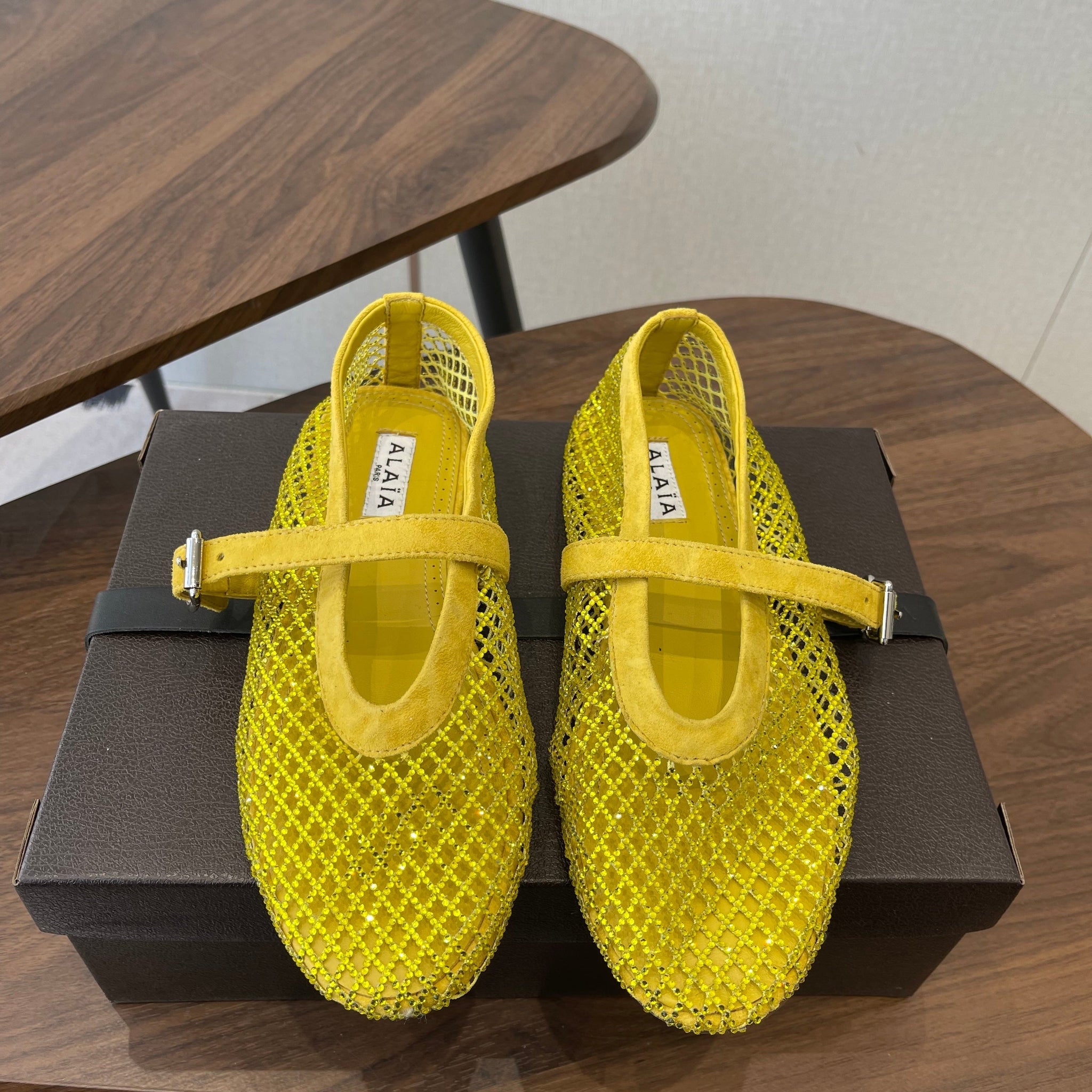 ALAIA 26S MESH FLATS IN DARK YELLOW SUEDE RHINESTONE-EMBELLISHED