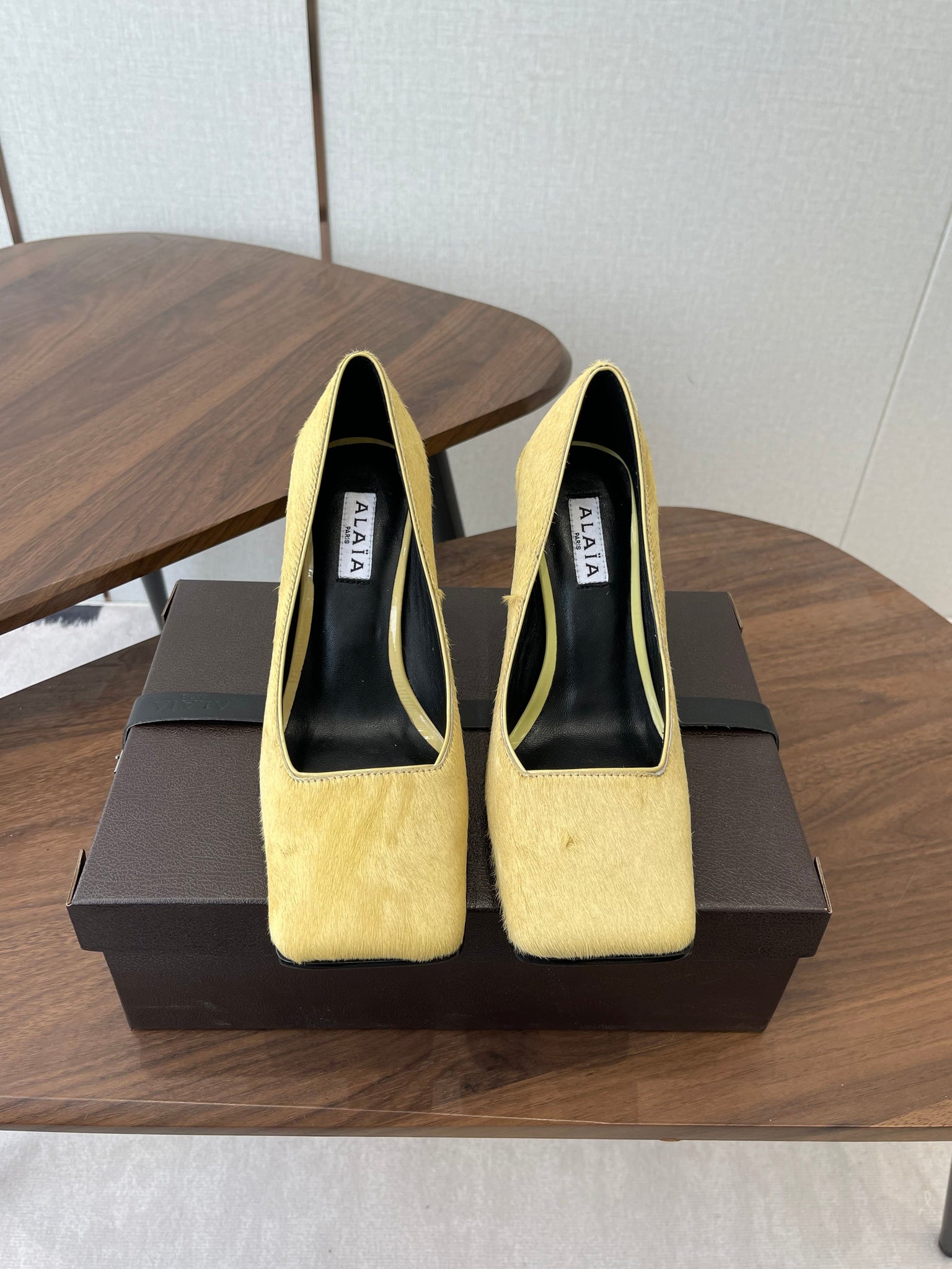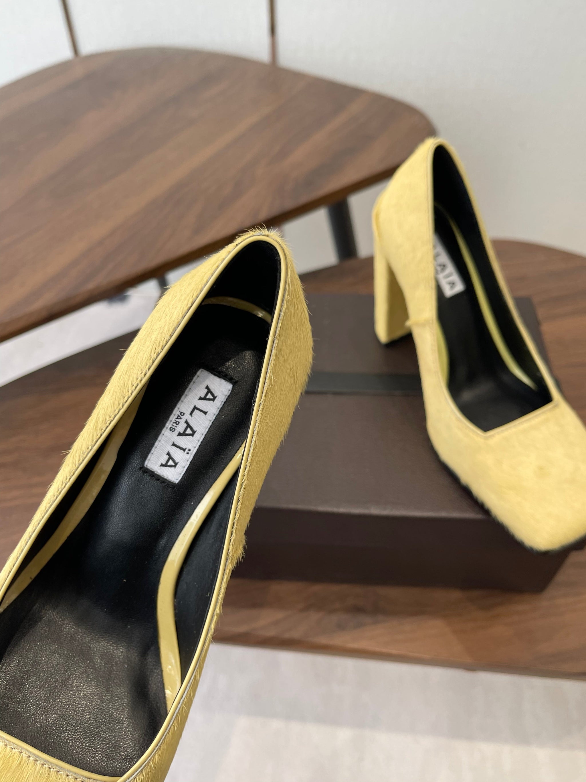ALAIA 26S SQUARE-TOE HIGH HEELS 95 MM IN YELLOW PONY HAIR