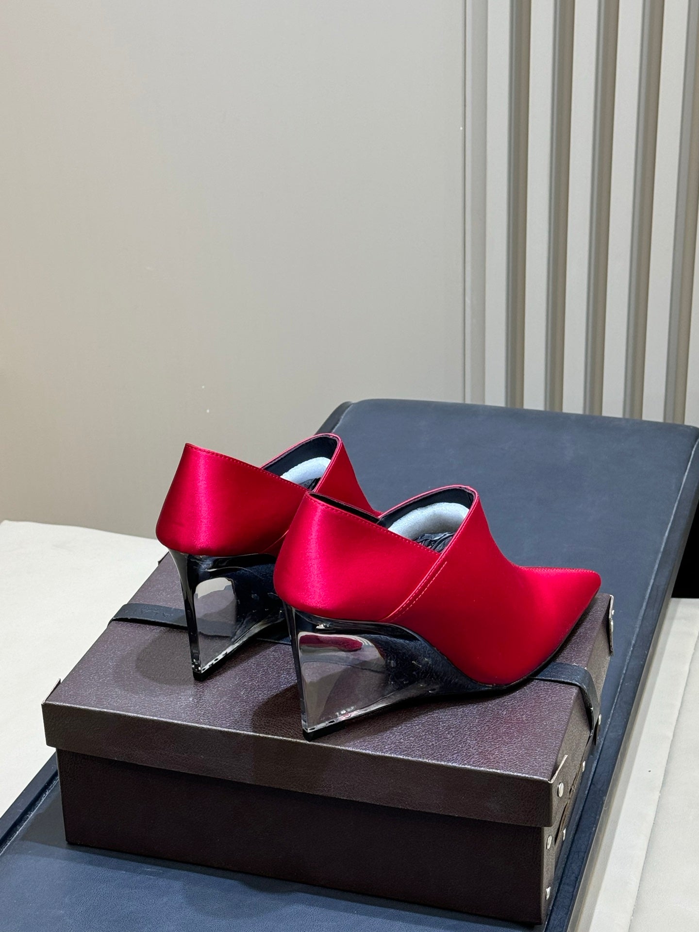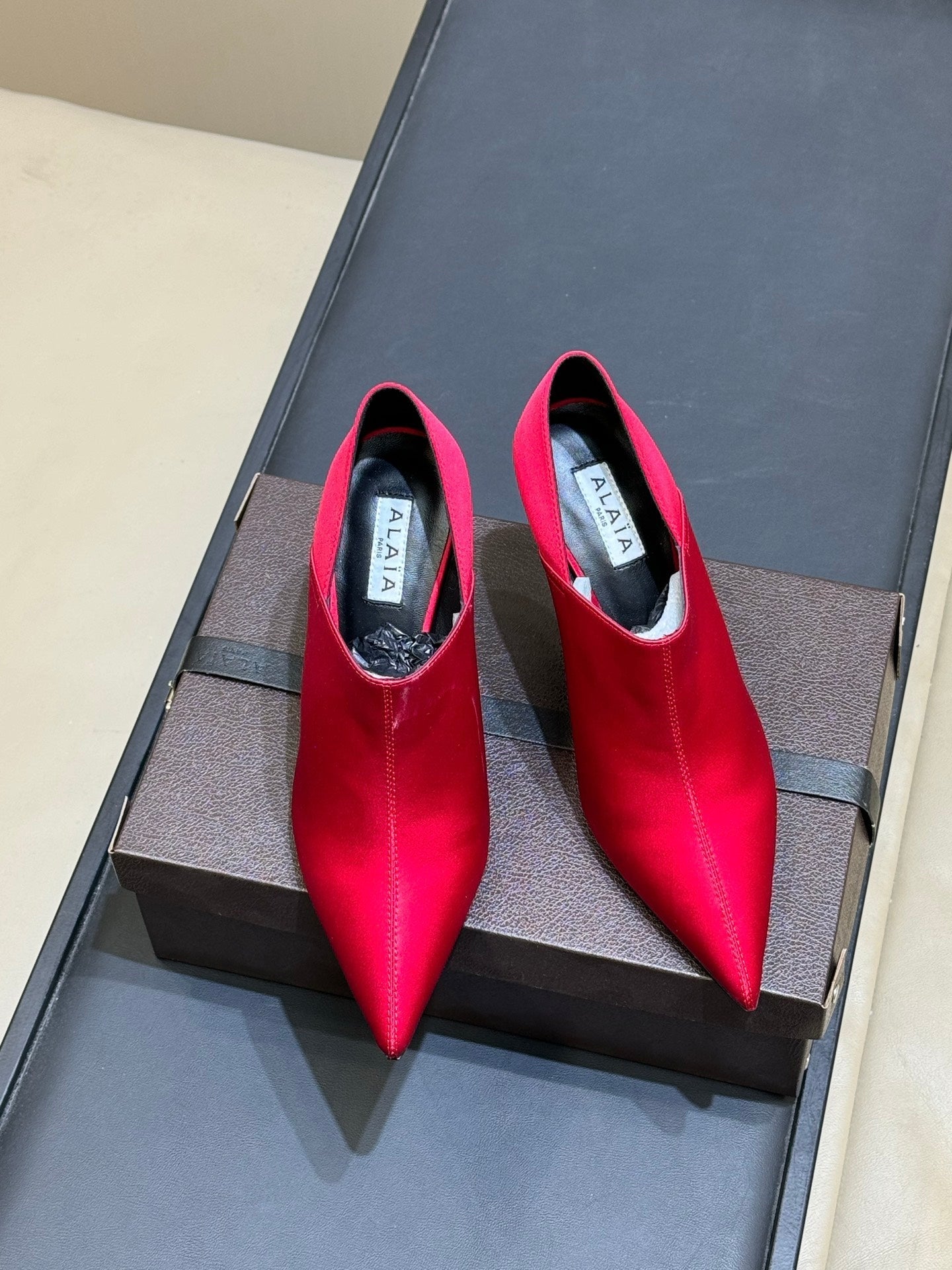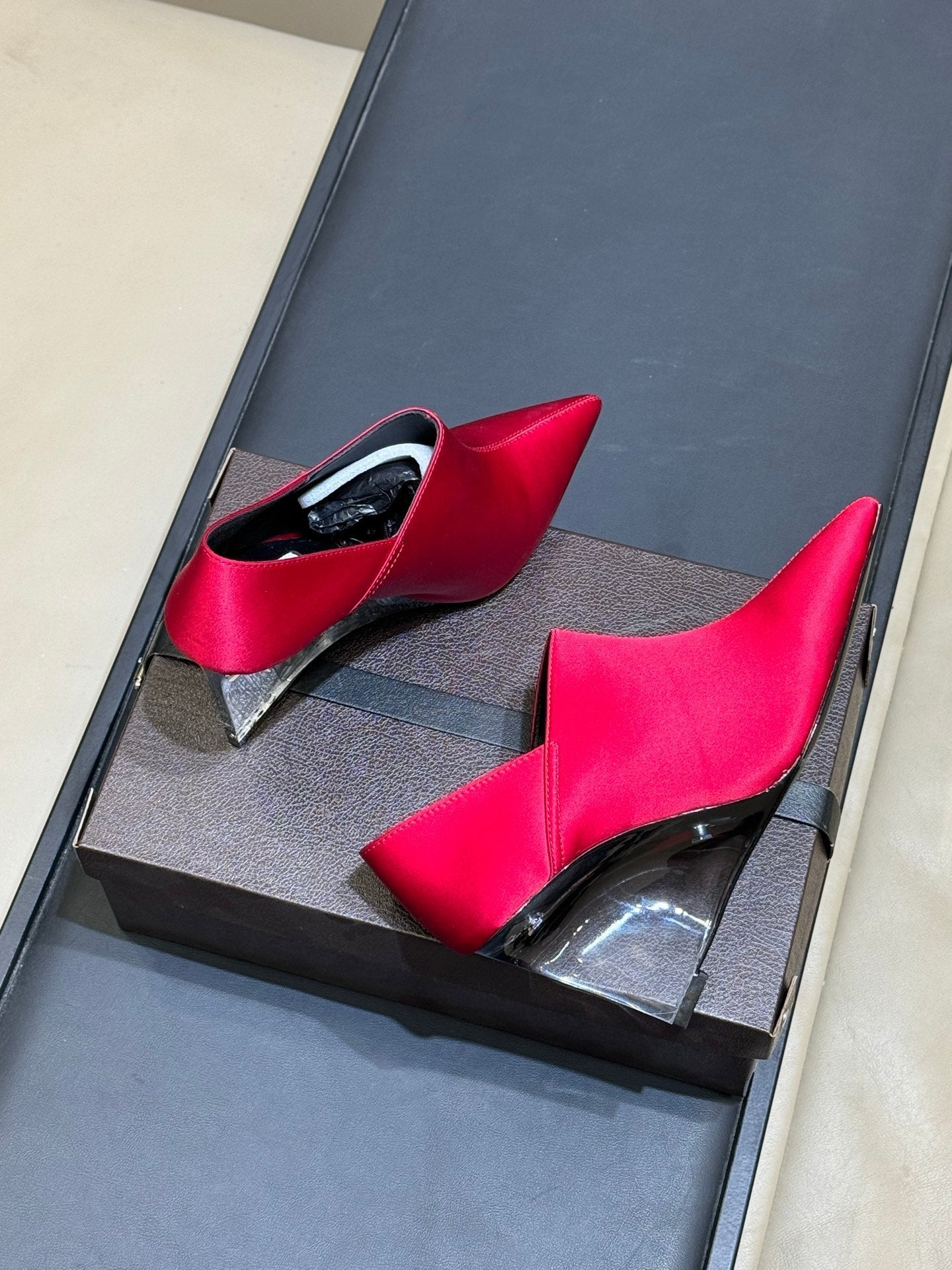 ALAIA 26S TRANSPARENT HIGH HEELS IN RED SATIN
