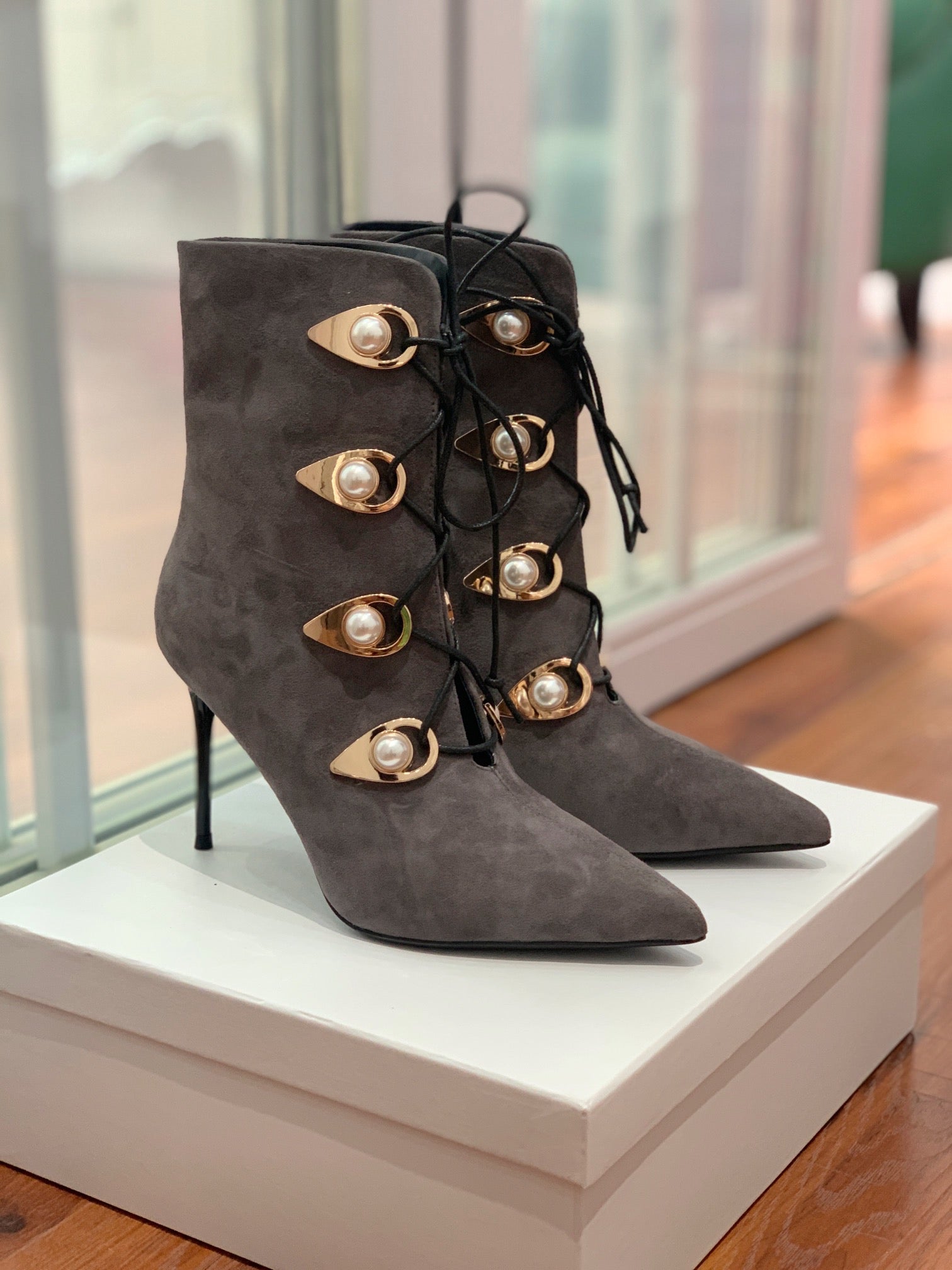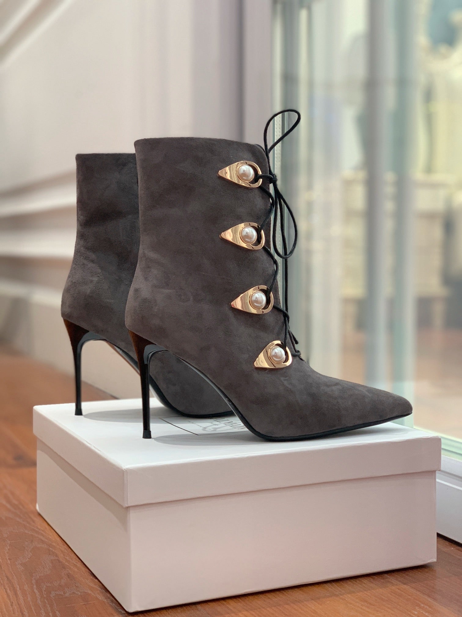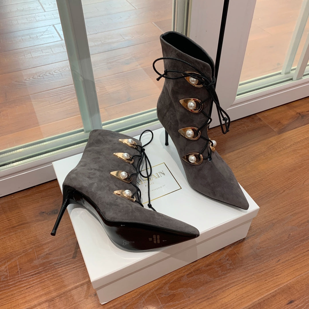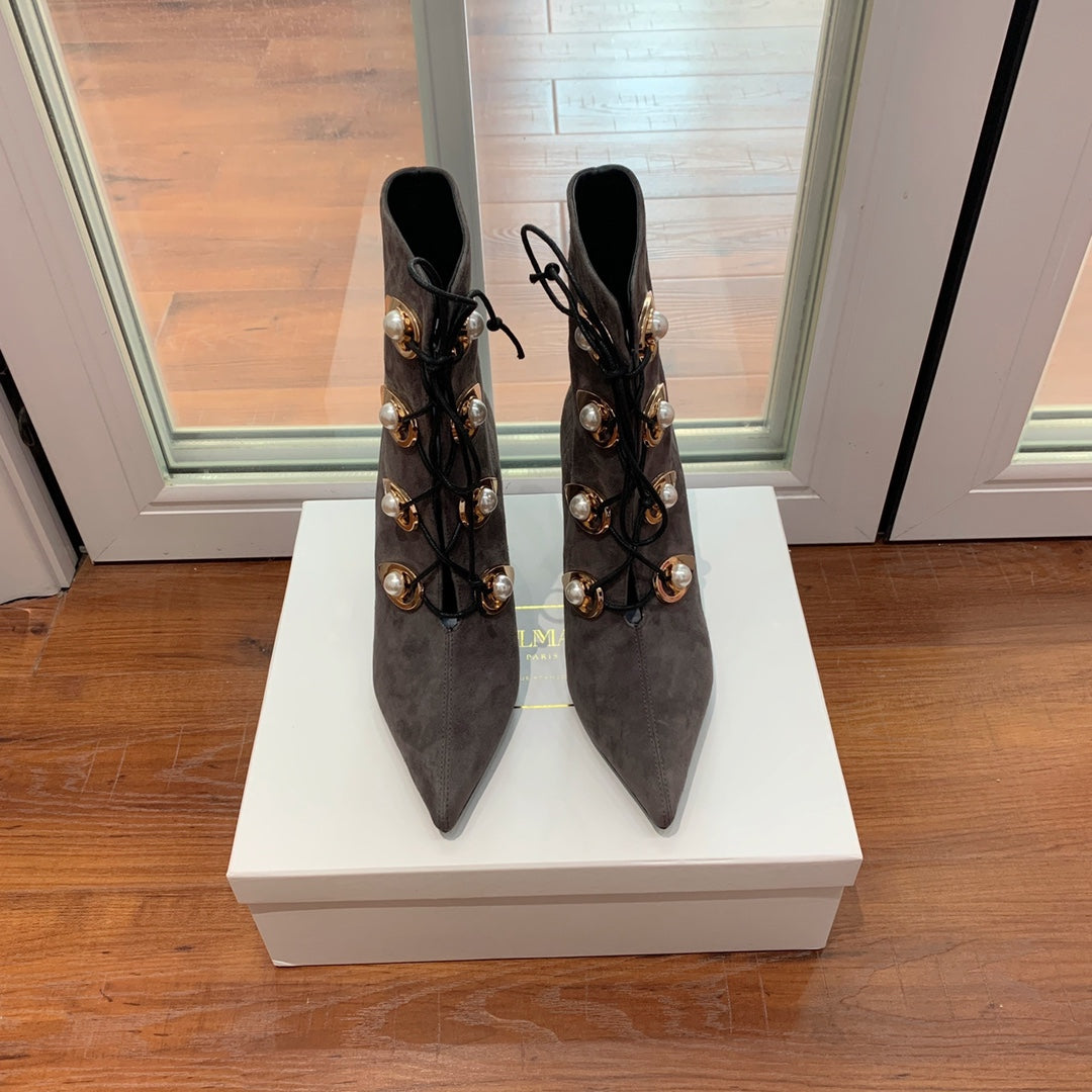 BALMAIN 26S BOOT 95 MM IN CHARCOAL GREY SUEDE PEARL BUTTON