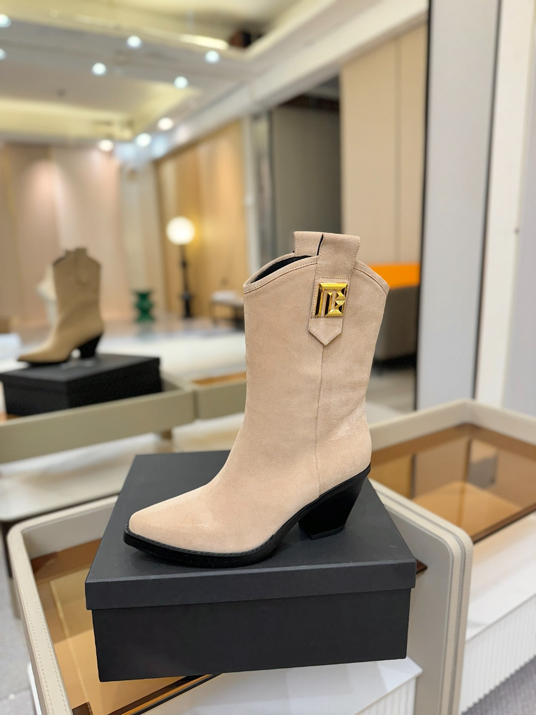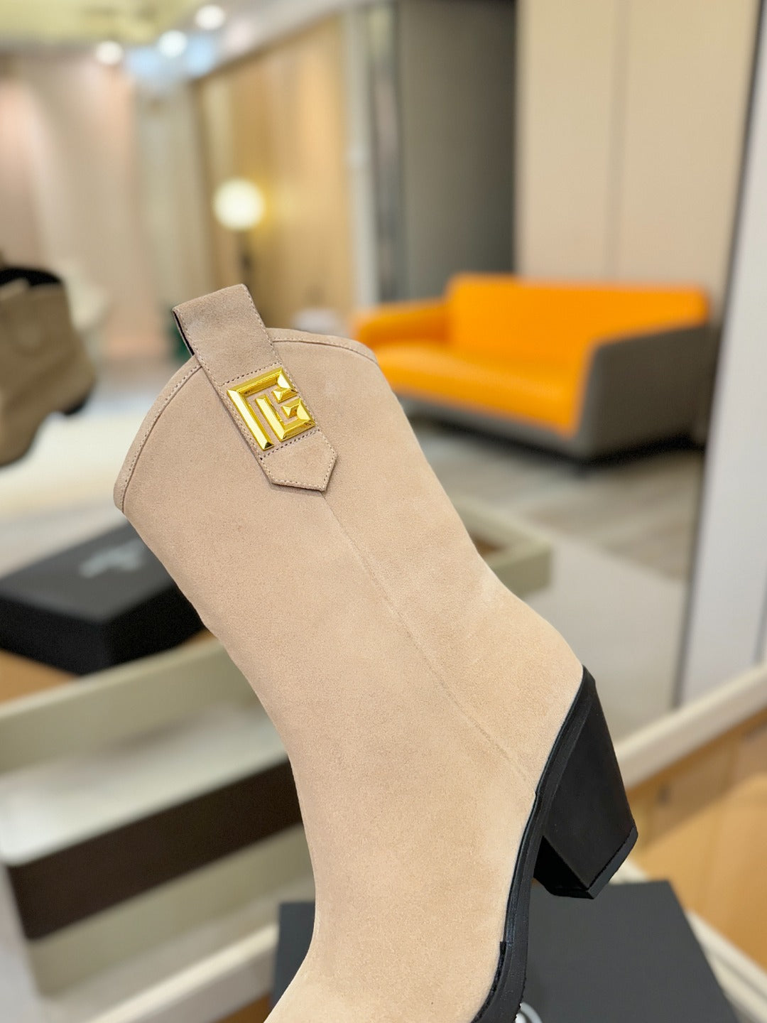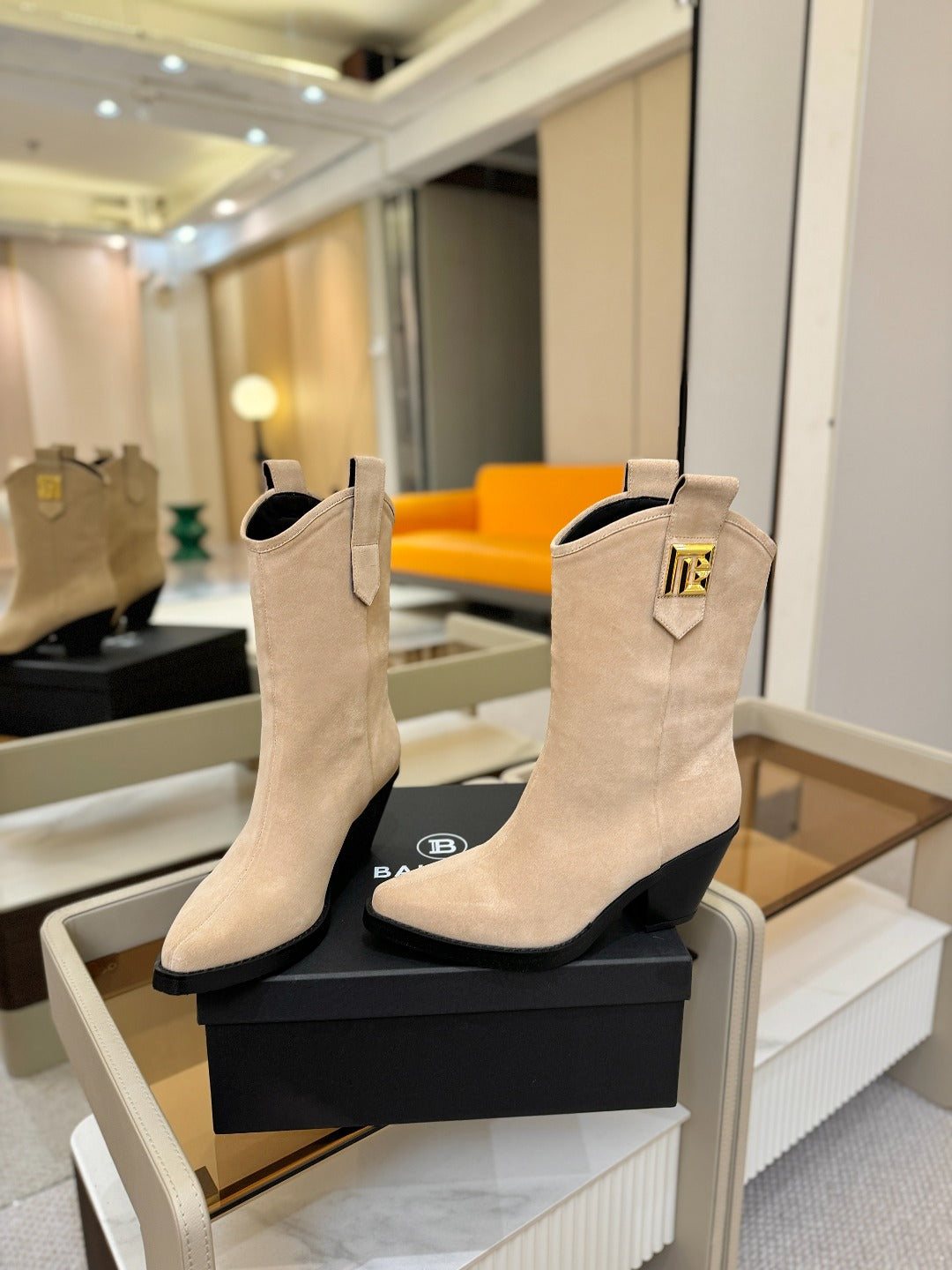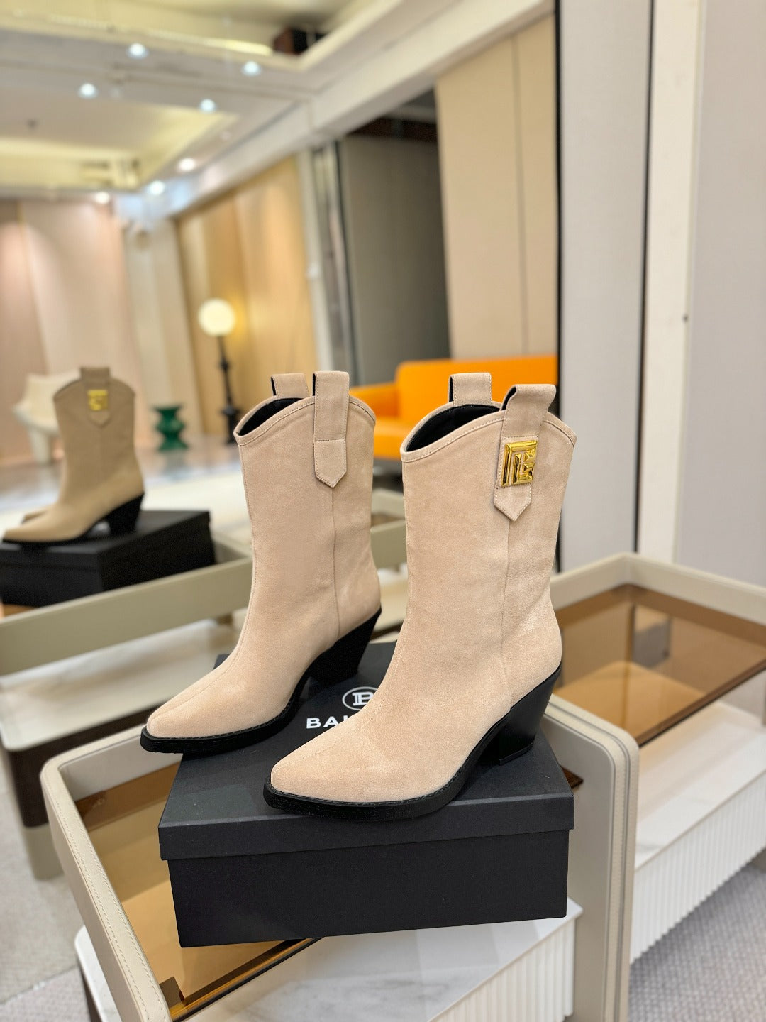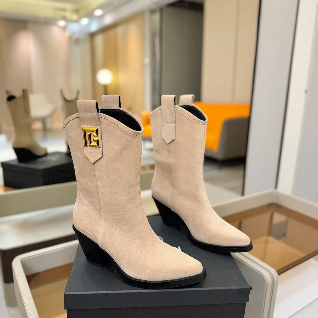 BALMAIN 26S COWBOY ANKLE BOOTS 65 MM IN BEIGE SUEDE