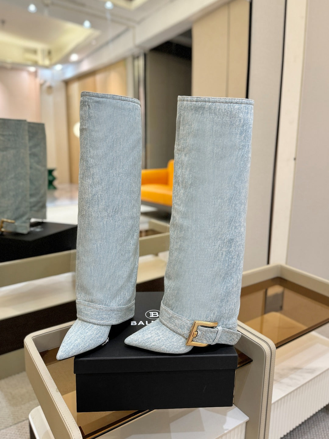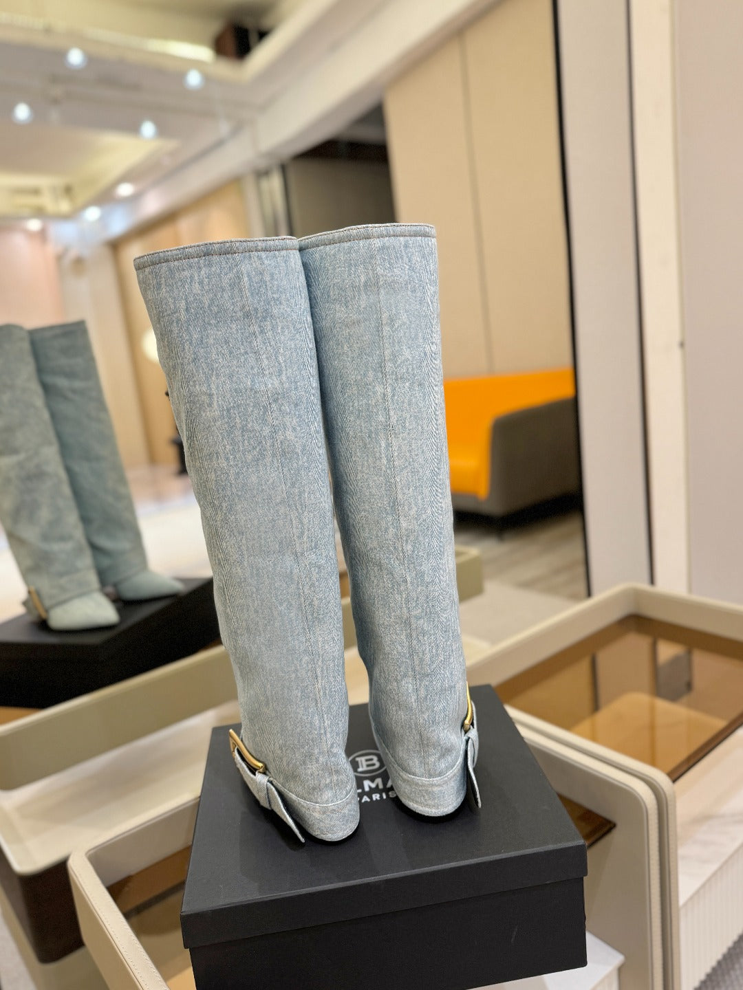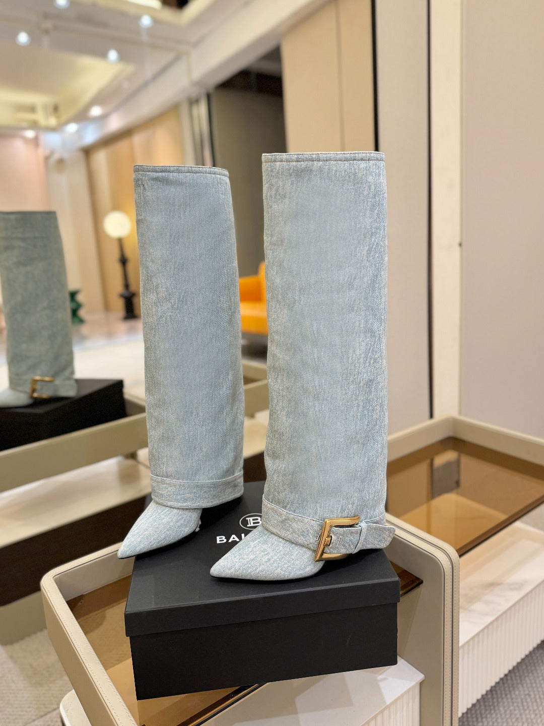 BALMAIN 26S KNEE-HIGH BOOTS 100 MM IN LIGHT BLUE DENIM