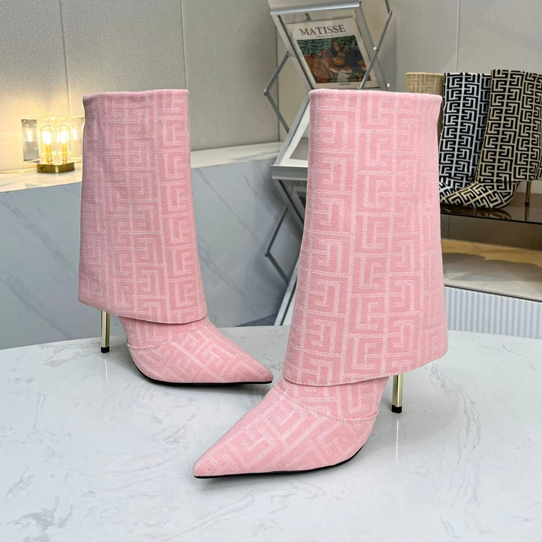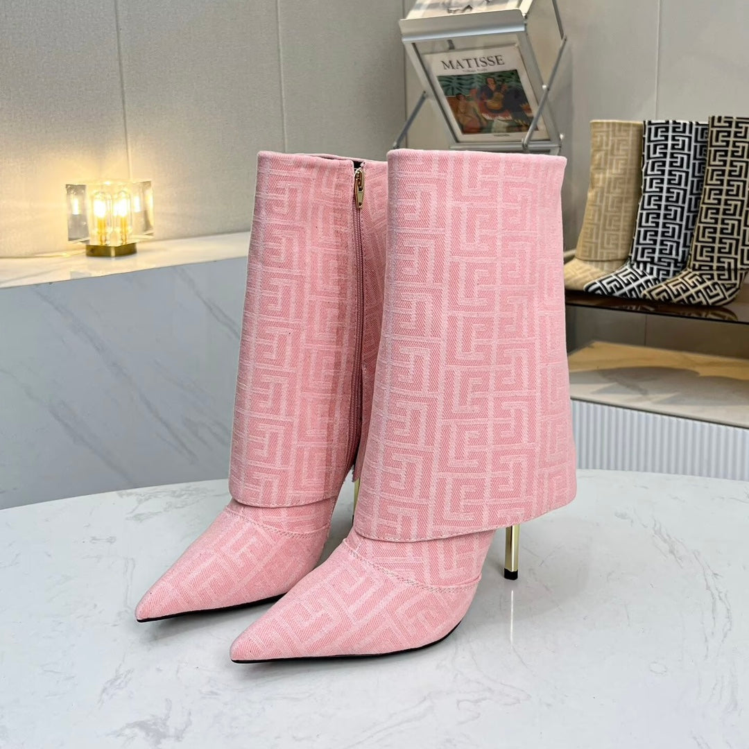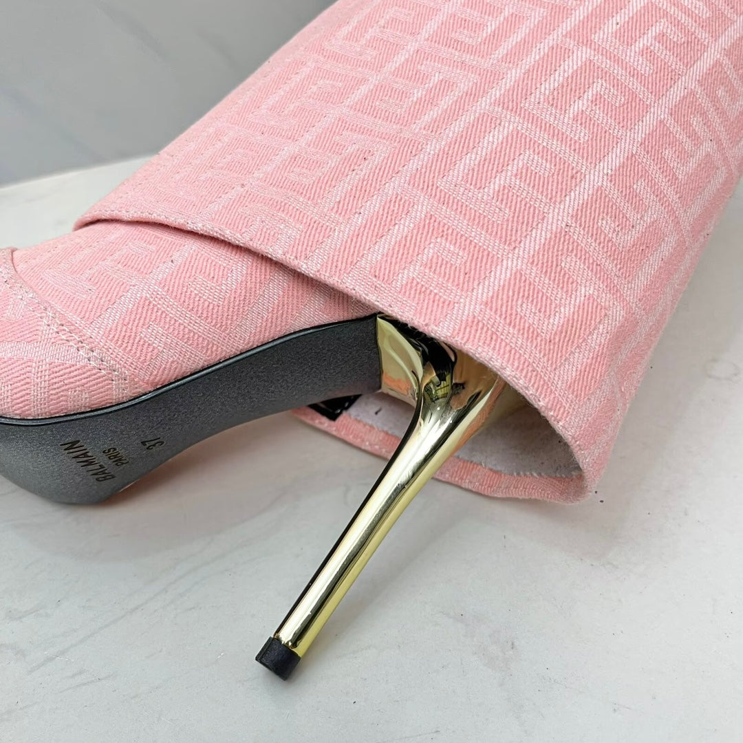 BALMAIN 26S MONOGRAM BOOTS 105 MM IN LIGHT PINK JACQUARD-WOVEN CANVAS