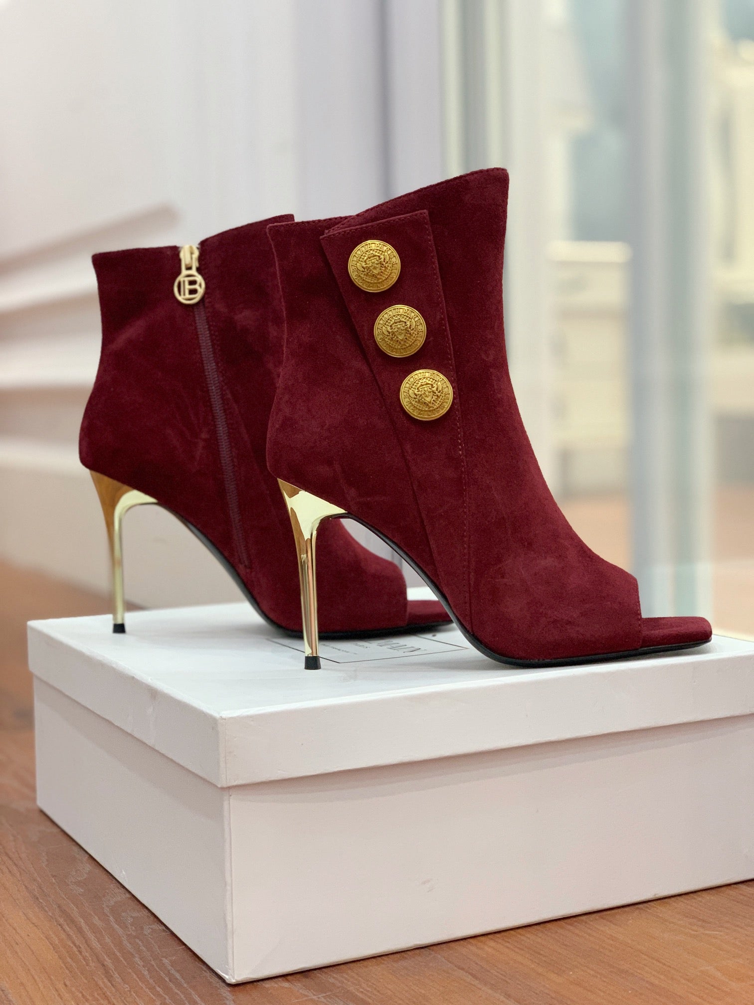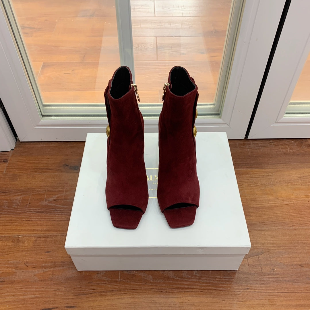 BALMAIN 26S OPEN-TOE BOOTS 95 MM IN DARK RED SUEDE