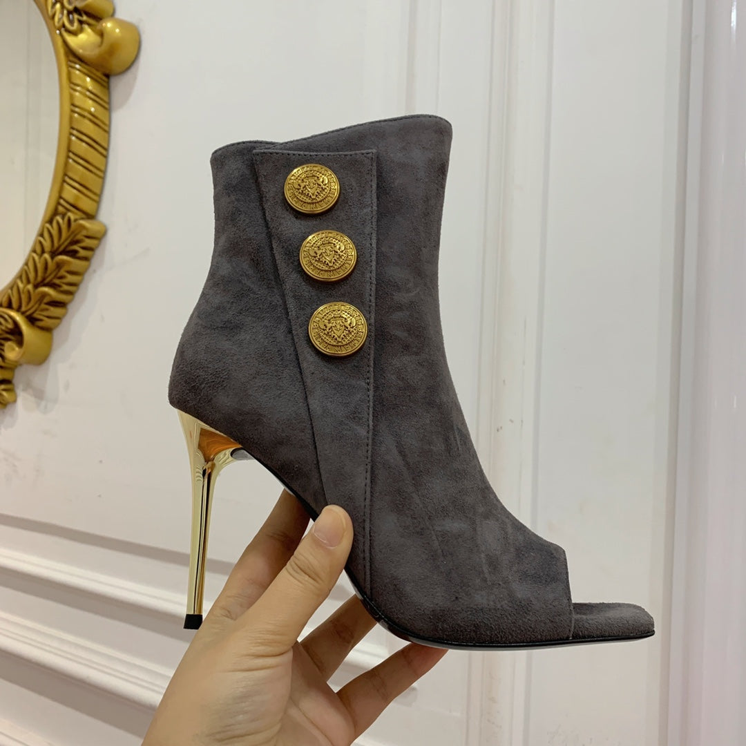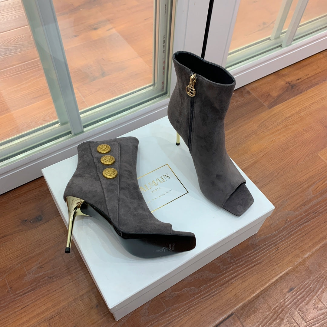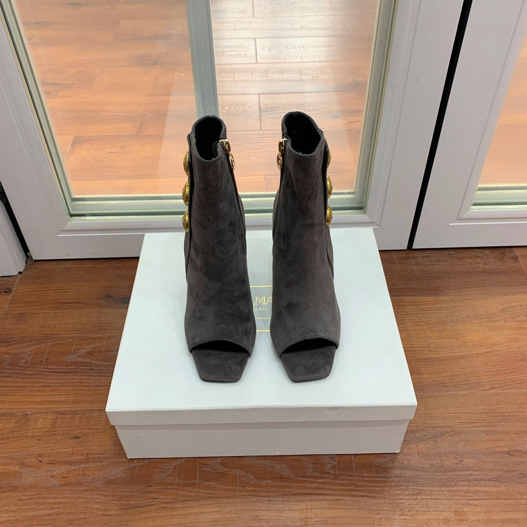 BALMAIN 26S OPEN-TOE BOOTS 95 MM IN GRAYISH BROWN SUEDE