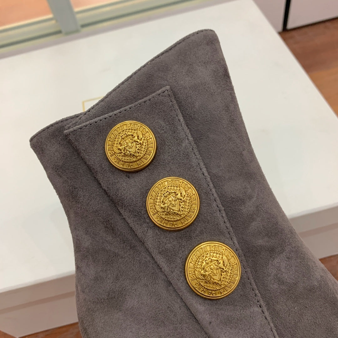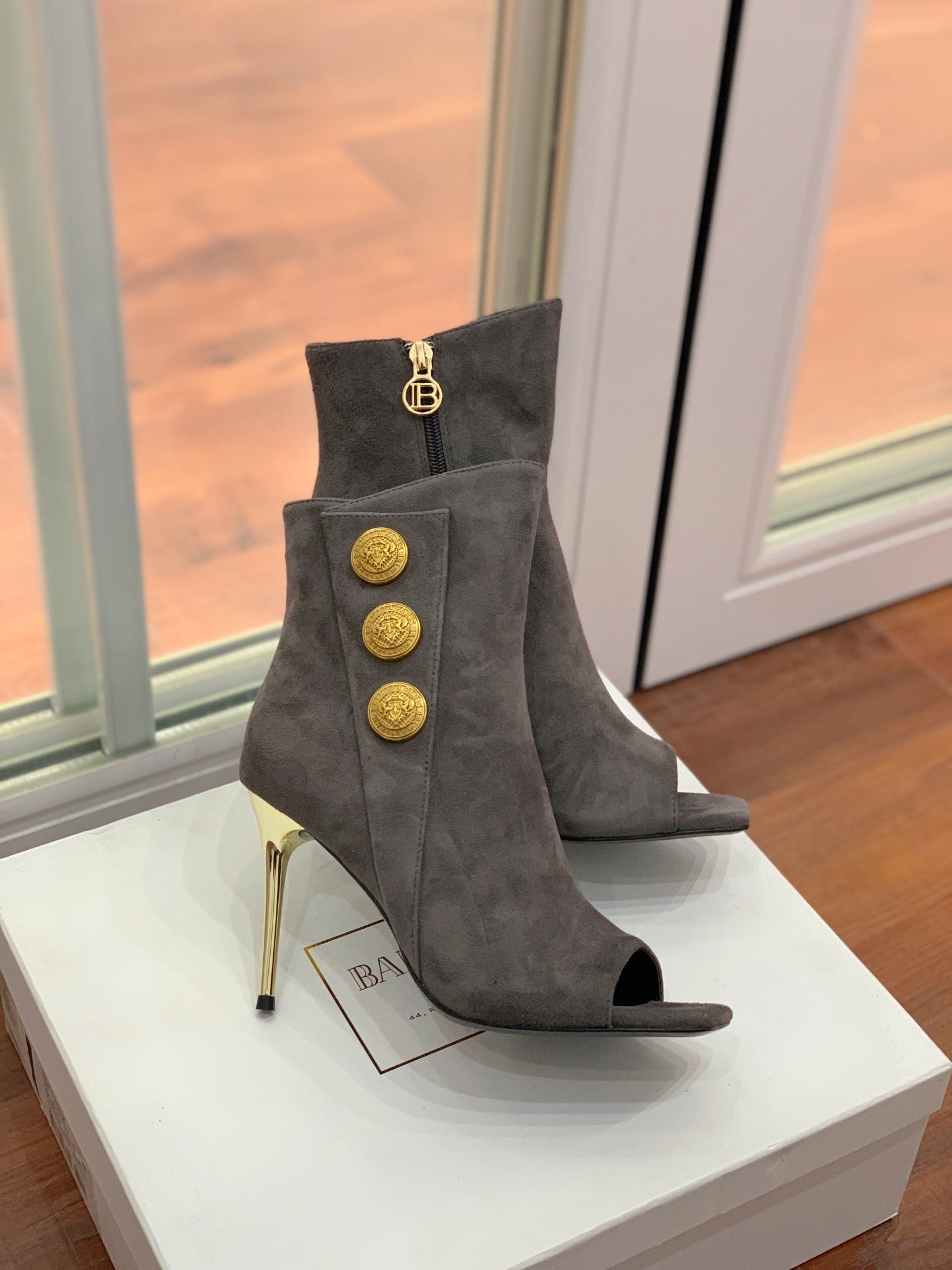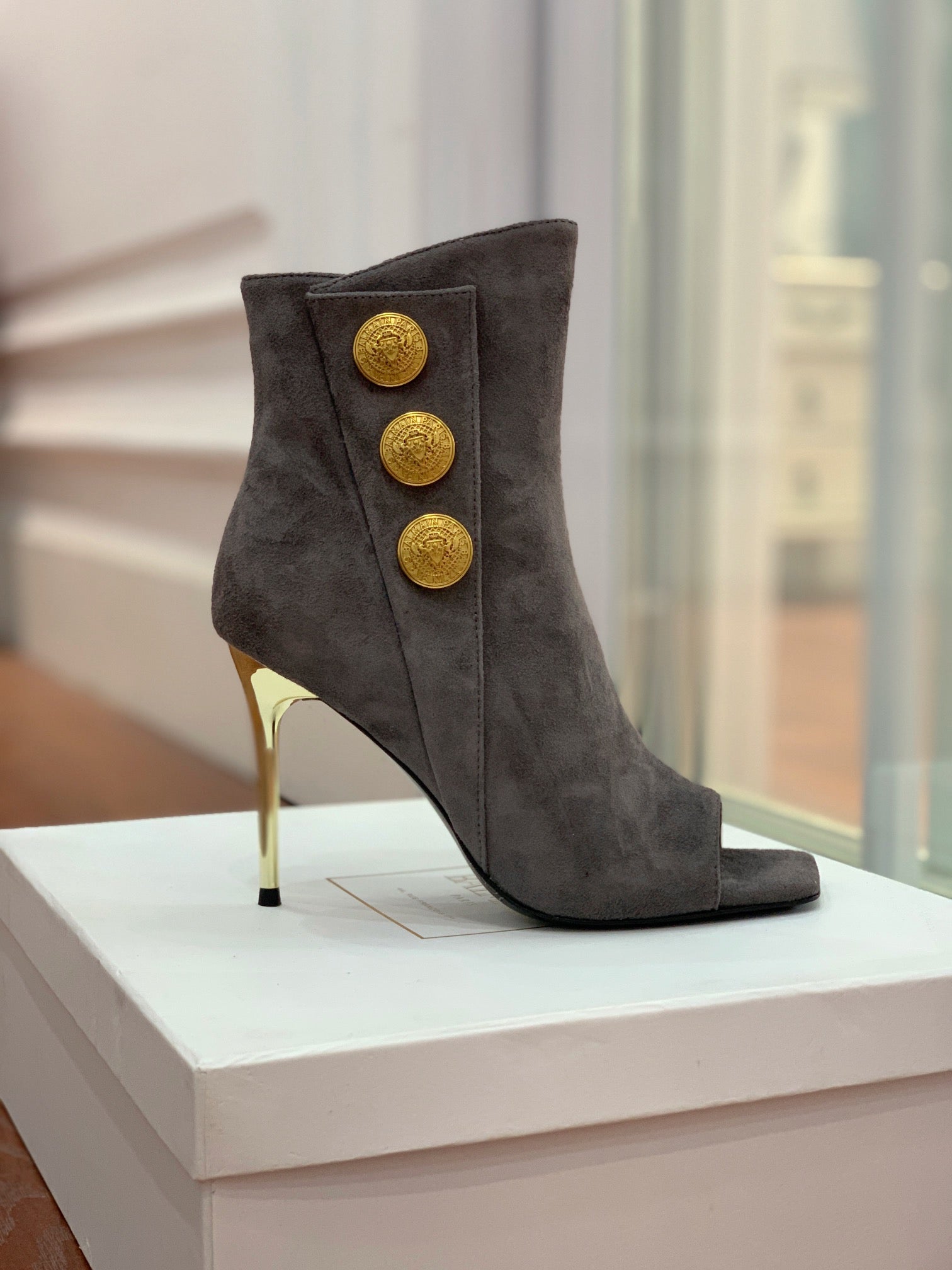 BALMAIN 26S OPEN-TOE BOOTS 95 MM IN GRAYISH BROWN SUEDE