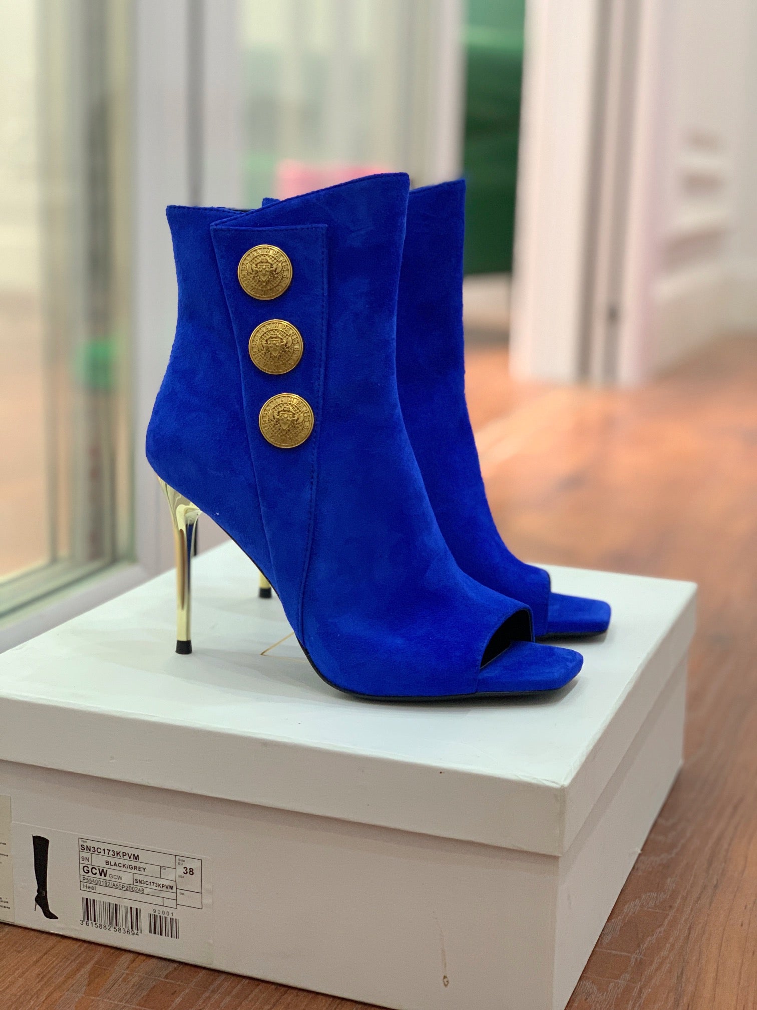 BALMAIN 26S OPEN-TOE BOOTS 95 MM IN NAVY BLUE SUEDE