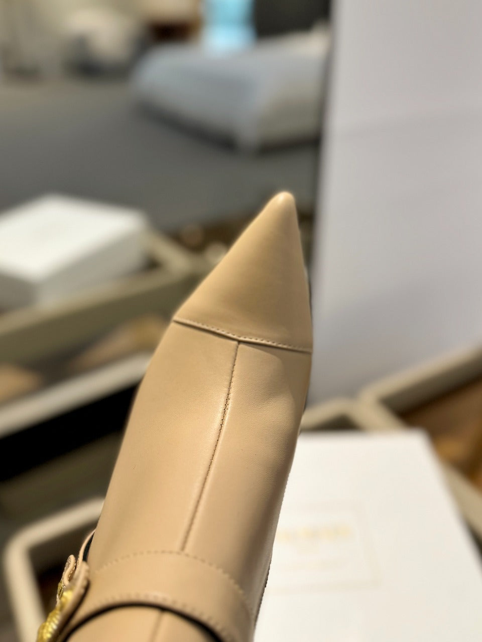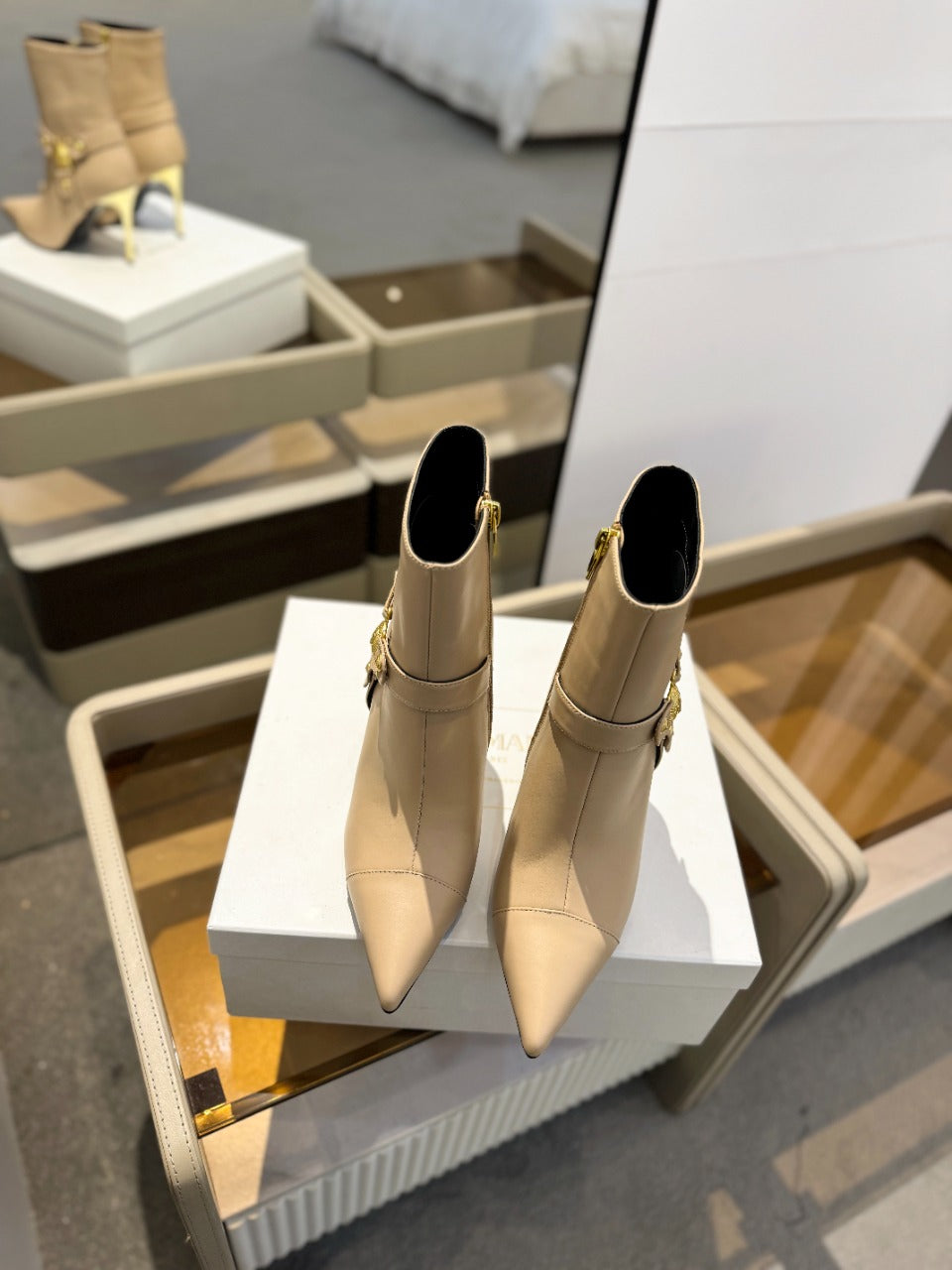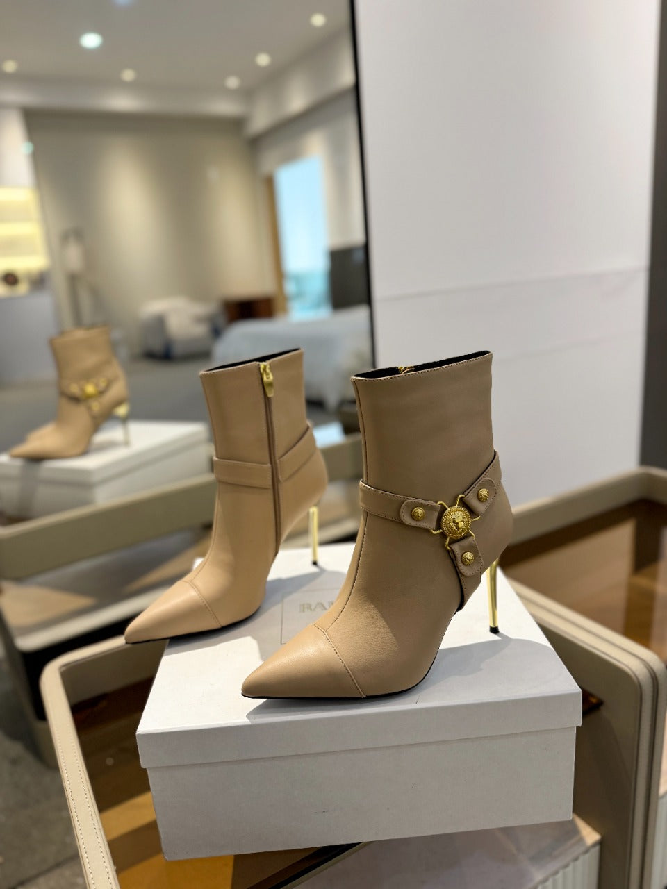 BALMAIN 26S STILETTO HEEL BOOTS 95 MM IN DARK BEIGE CALFSKIN