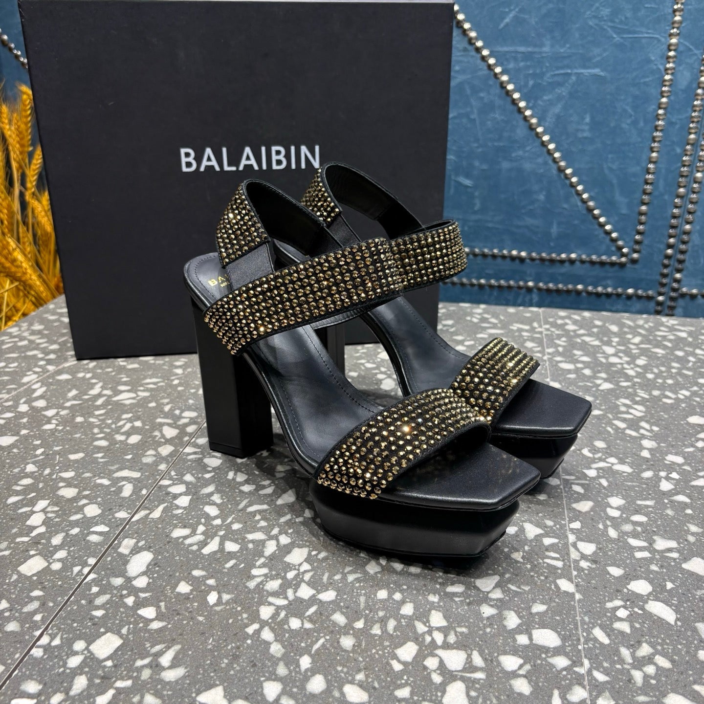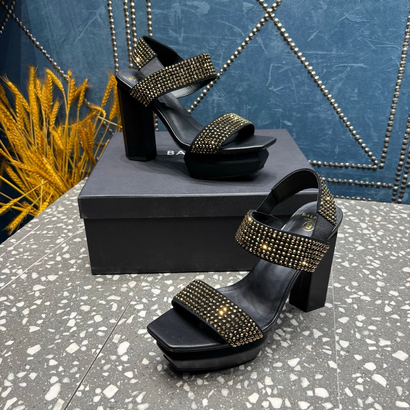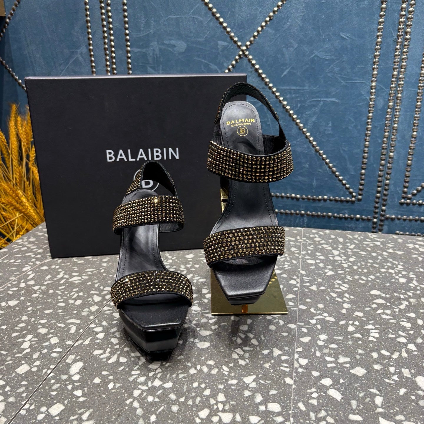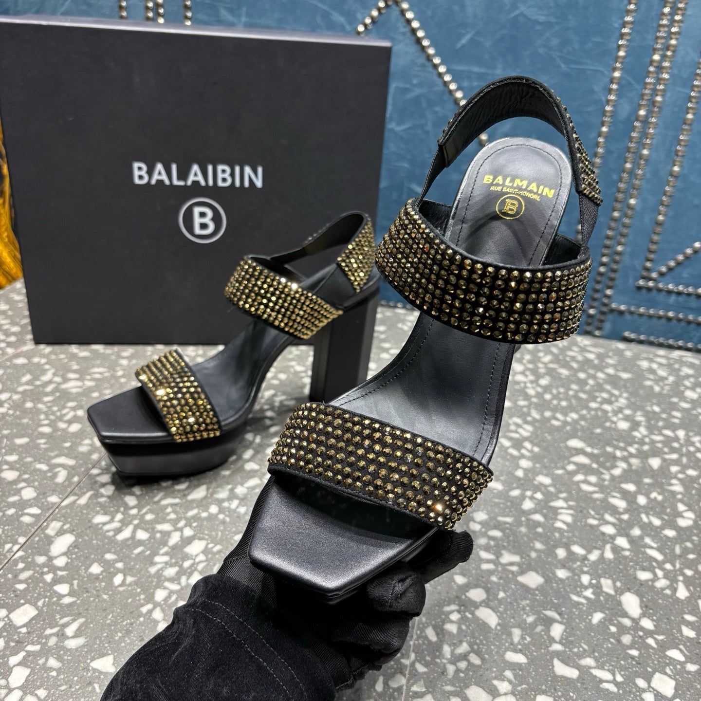 BALMAIN 26S HIGH-HEELED SANDALS 105 MM IN BLACK CALFSKIN WITH GOLD STONE EMBELLISHED