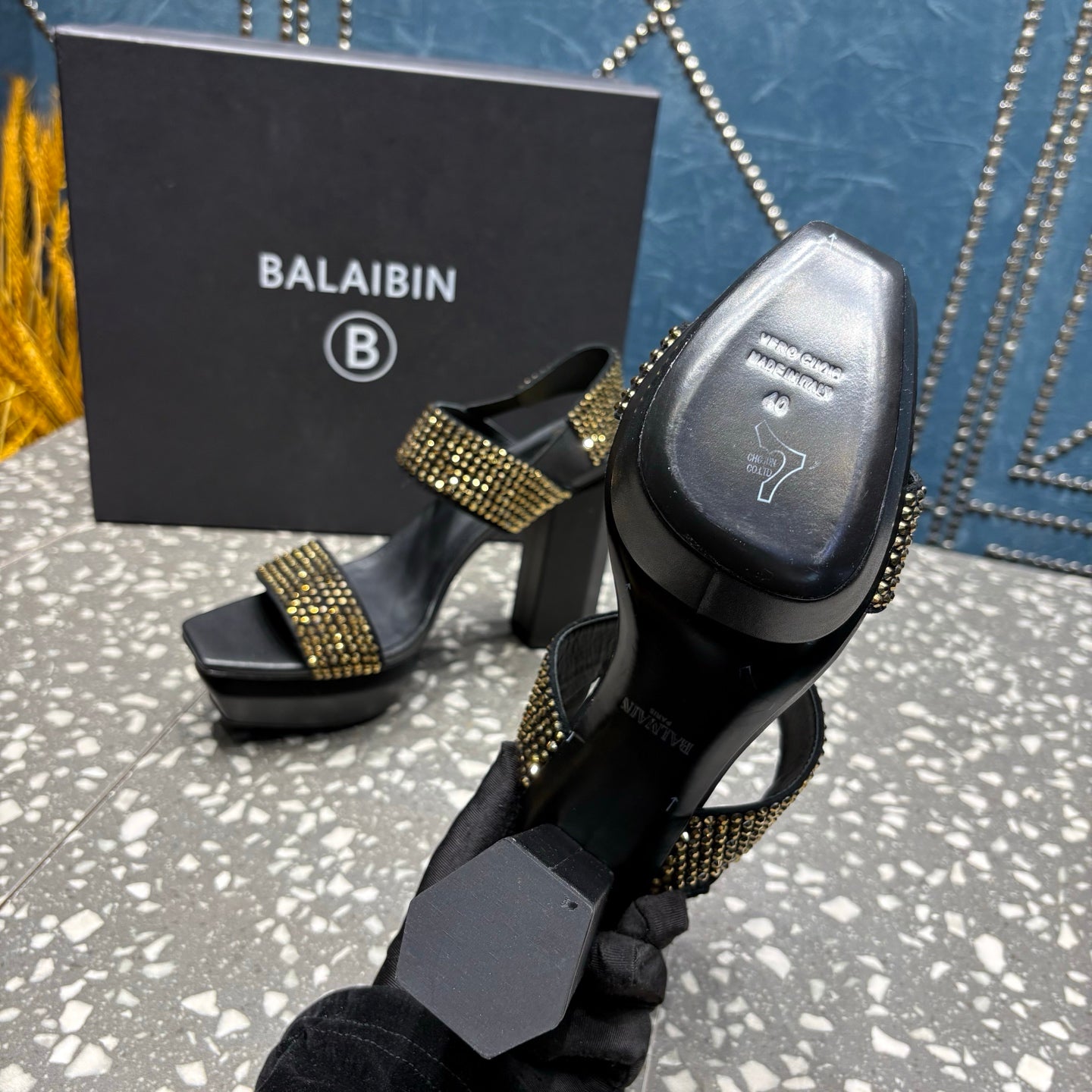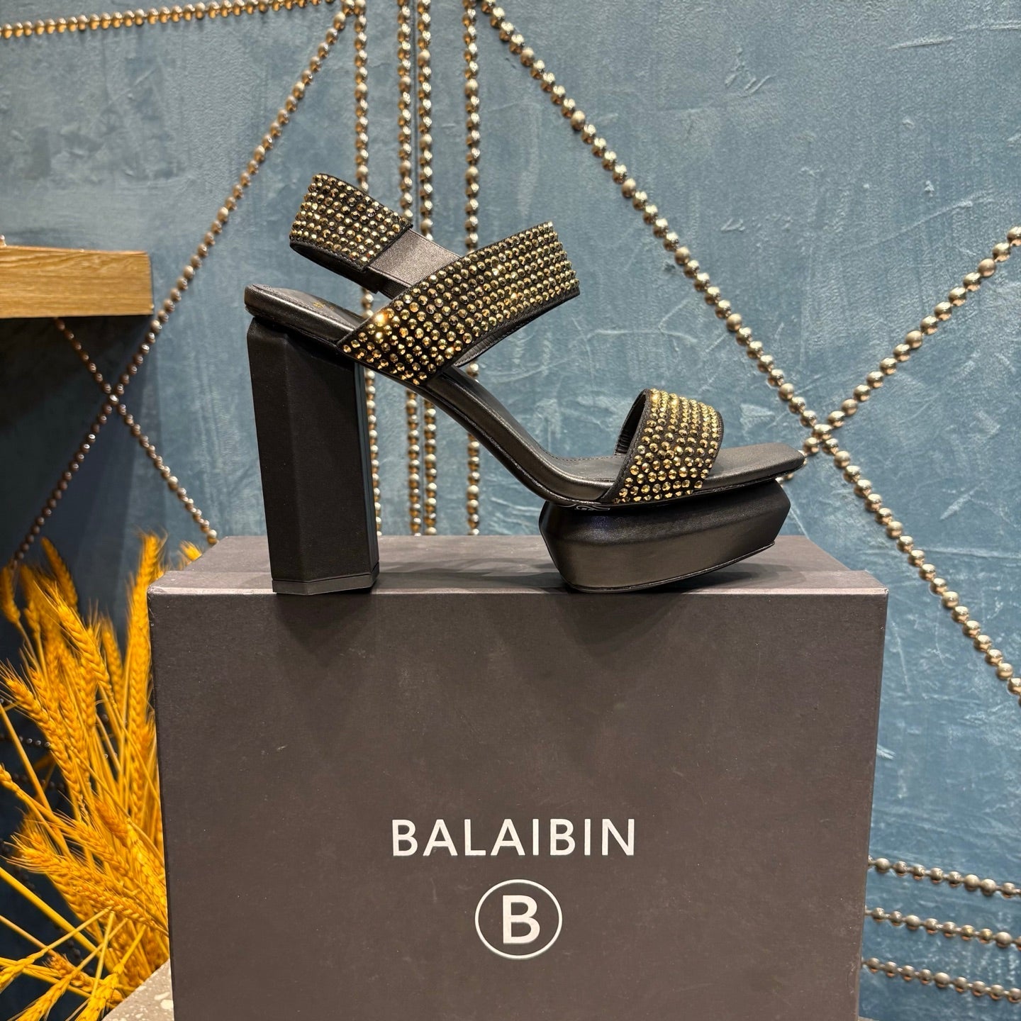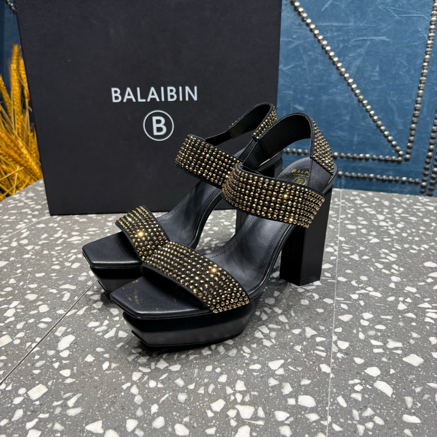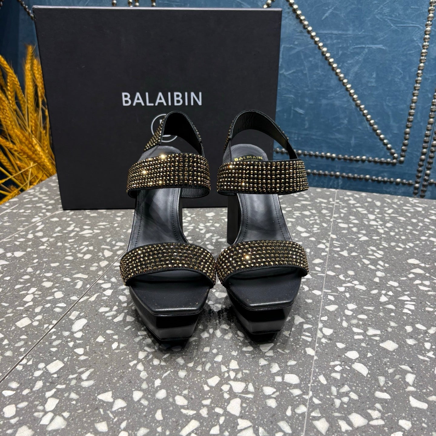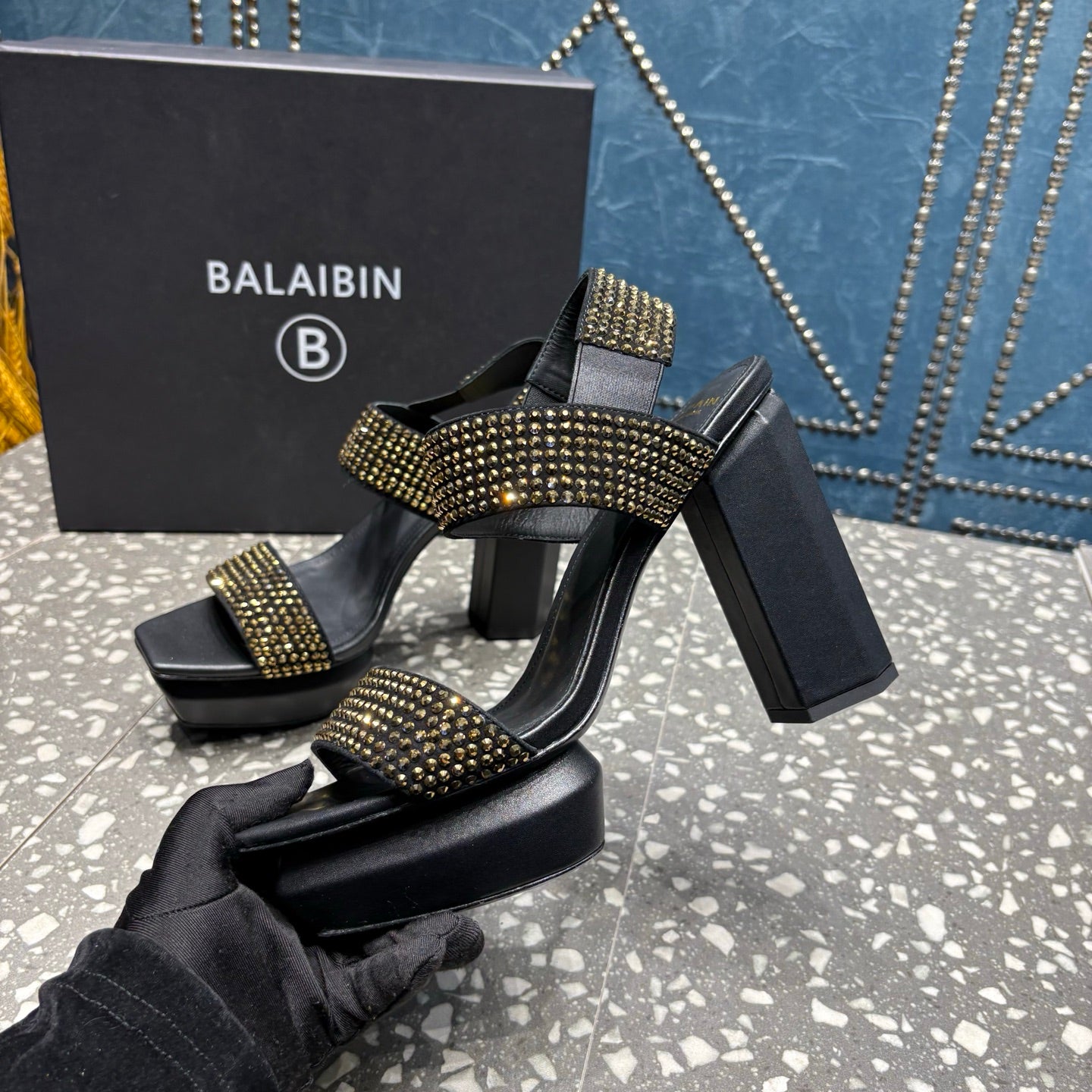 BALMAIN 26S HIGH-HEELED SANDALS 105 MM IN BLACK CALFSKIN WITH GOLD STONE EMBELLISHED