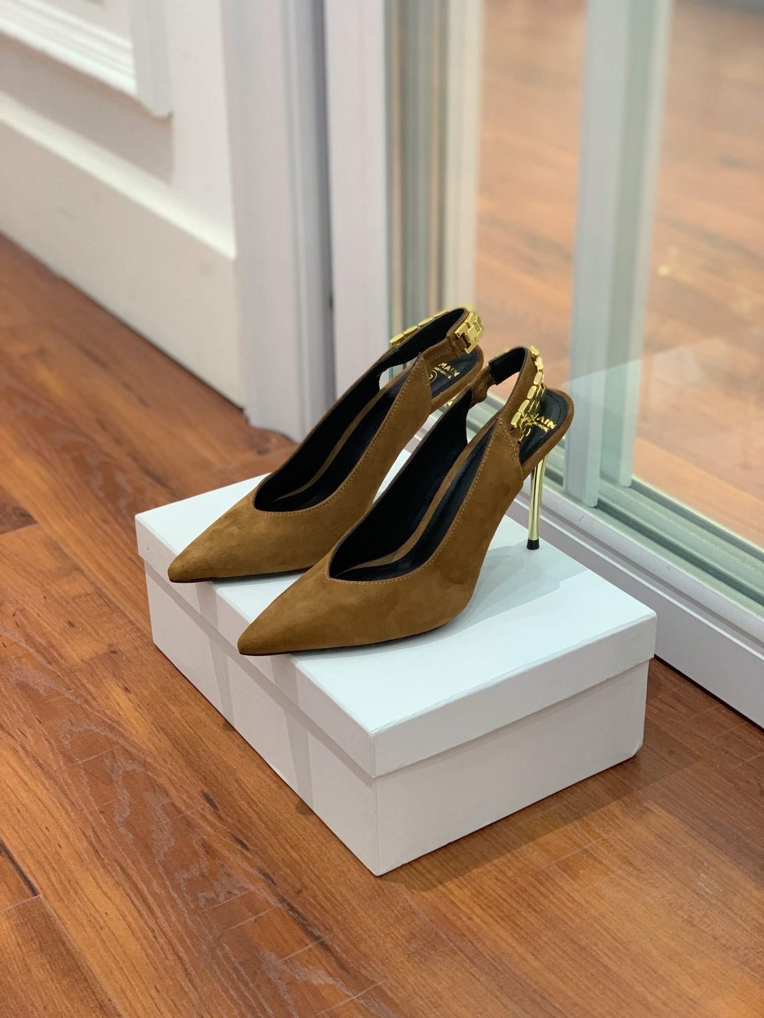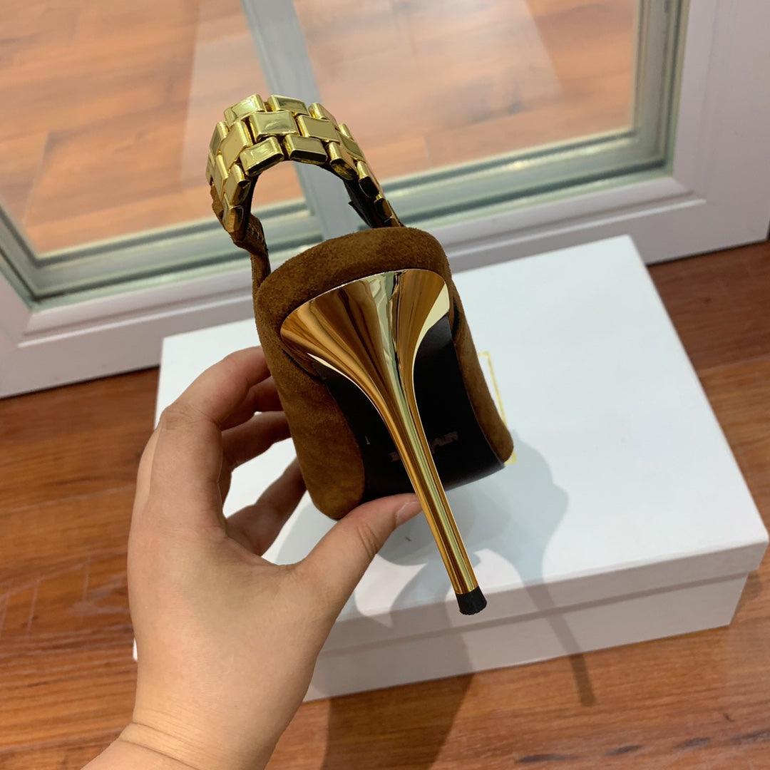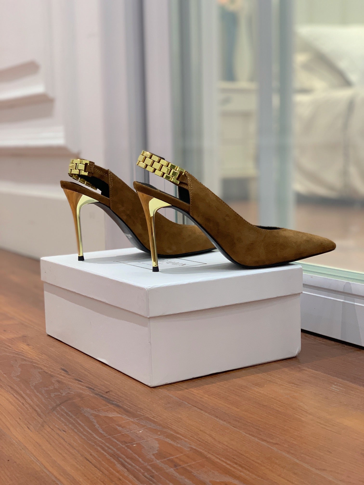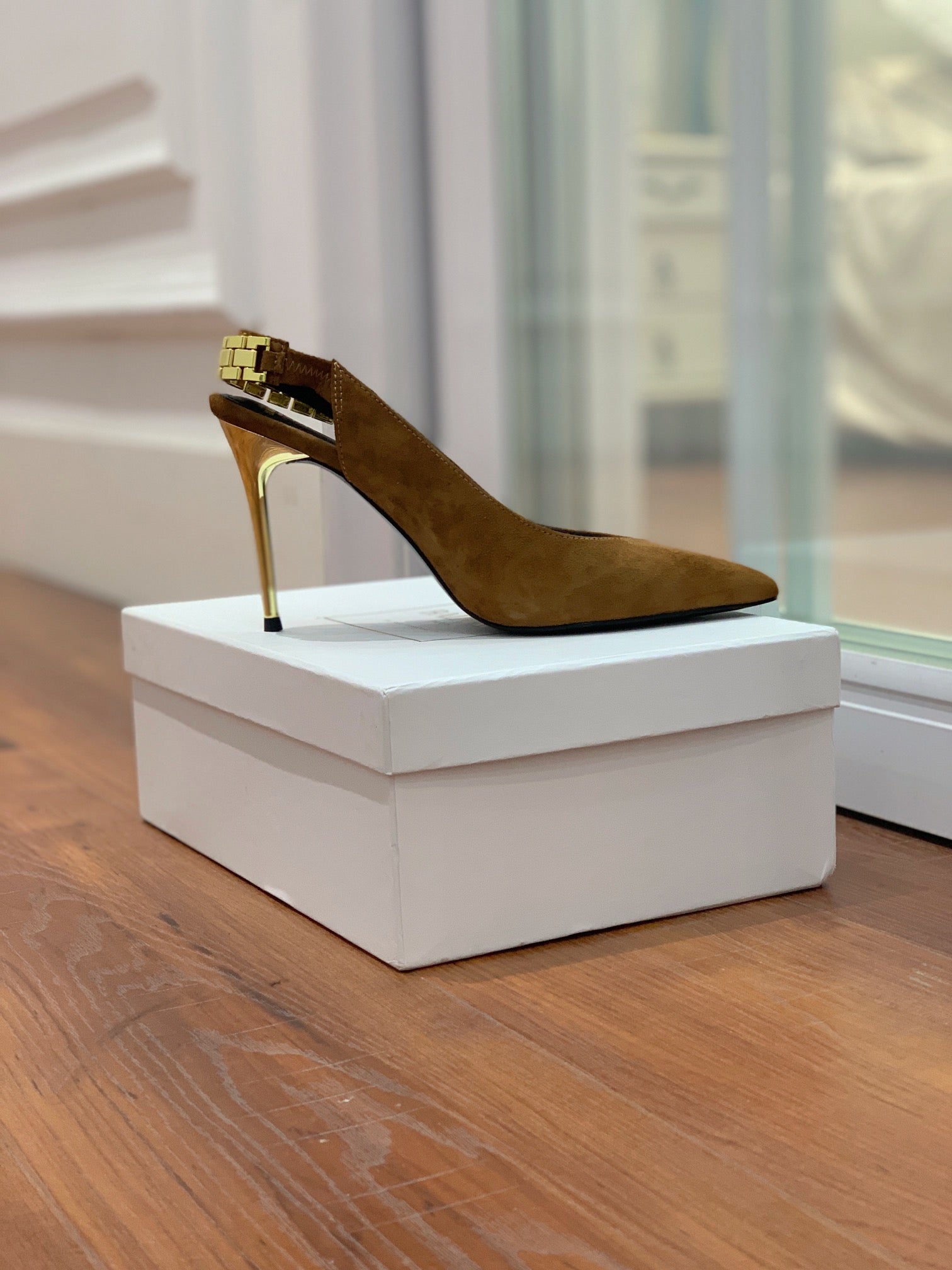 BALMAIN 26S SLINGBACK 95 MM IN BROWN SUEDE WITH GOLD HARDWARE