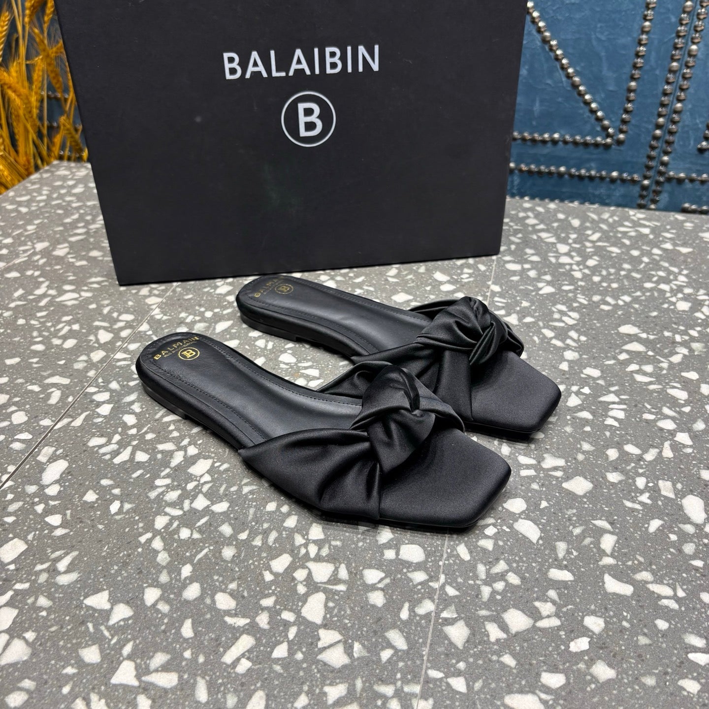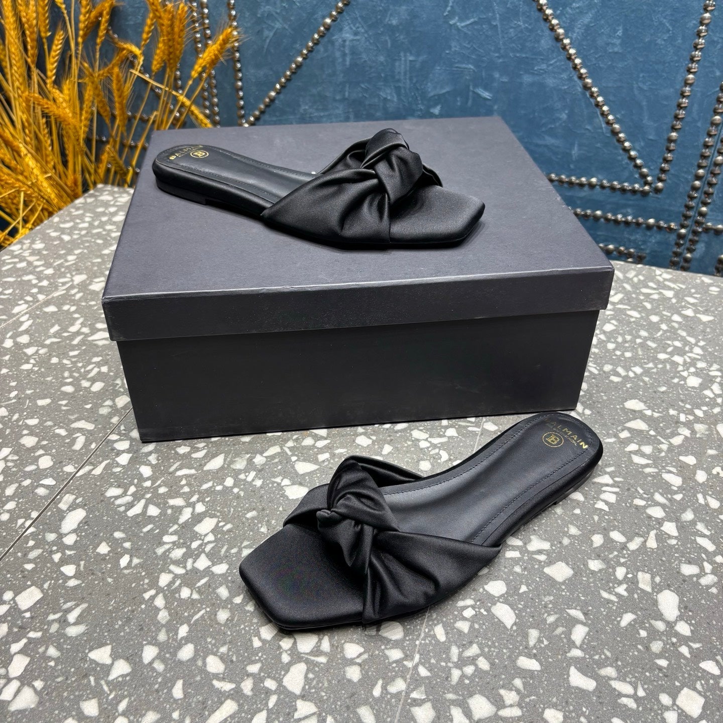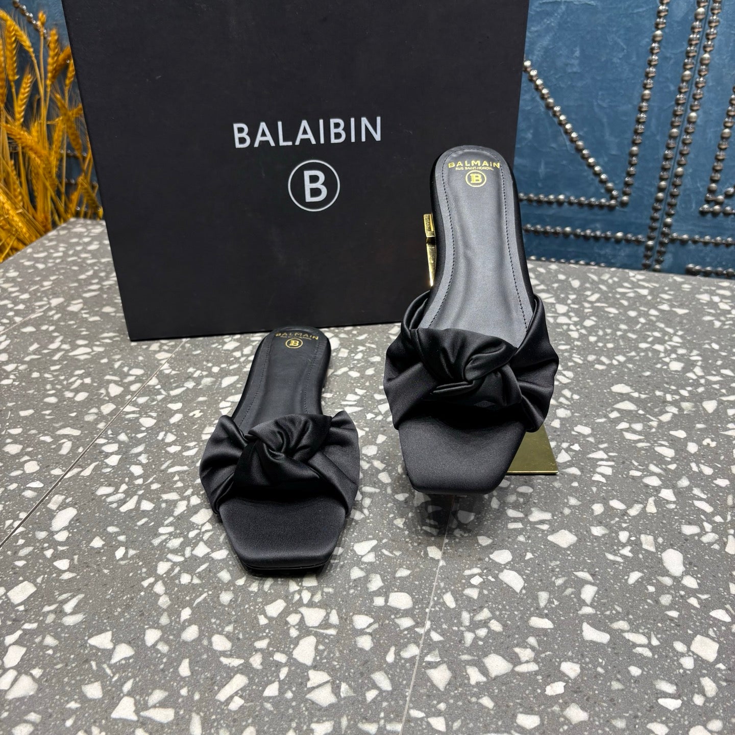 BALMAIN 26S SLIDES IN BLACK SATIN