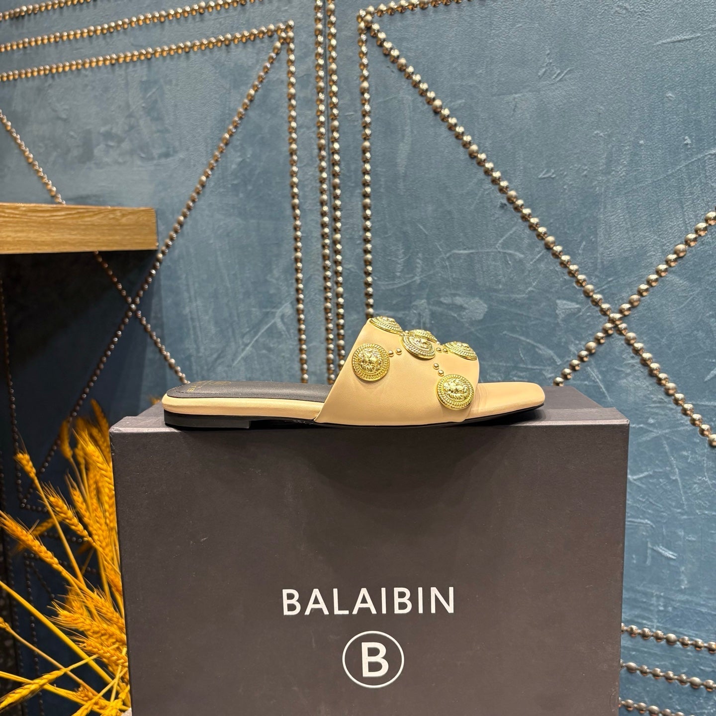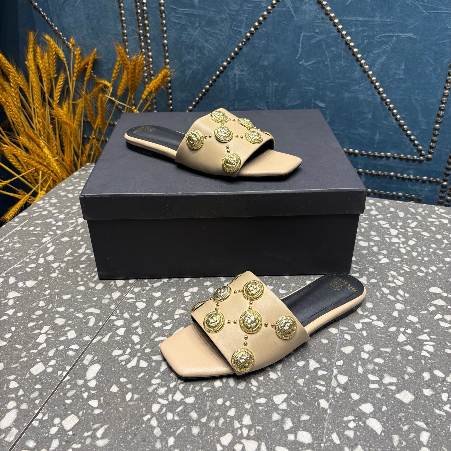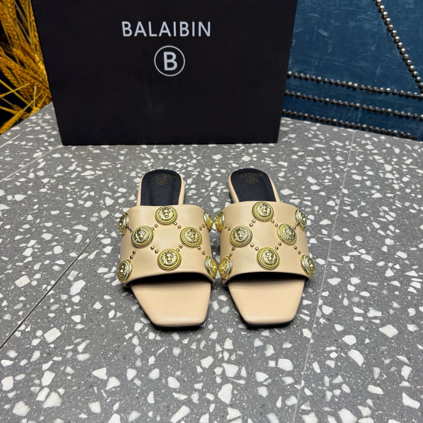 BALMAIN 26S SLIPPERS IN BEIGE CALFSKIN WITH GOLD HARDWARE