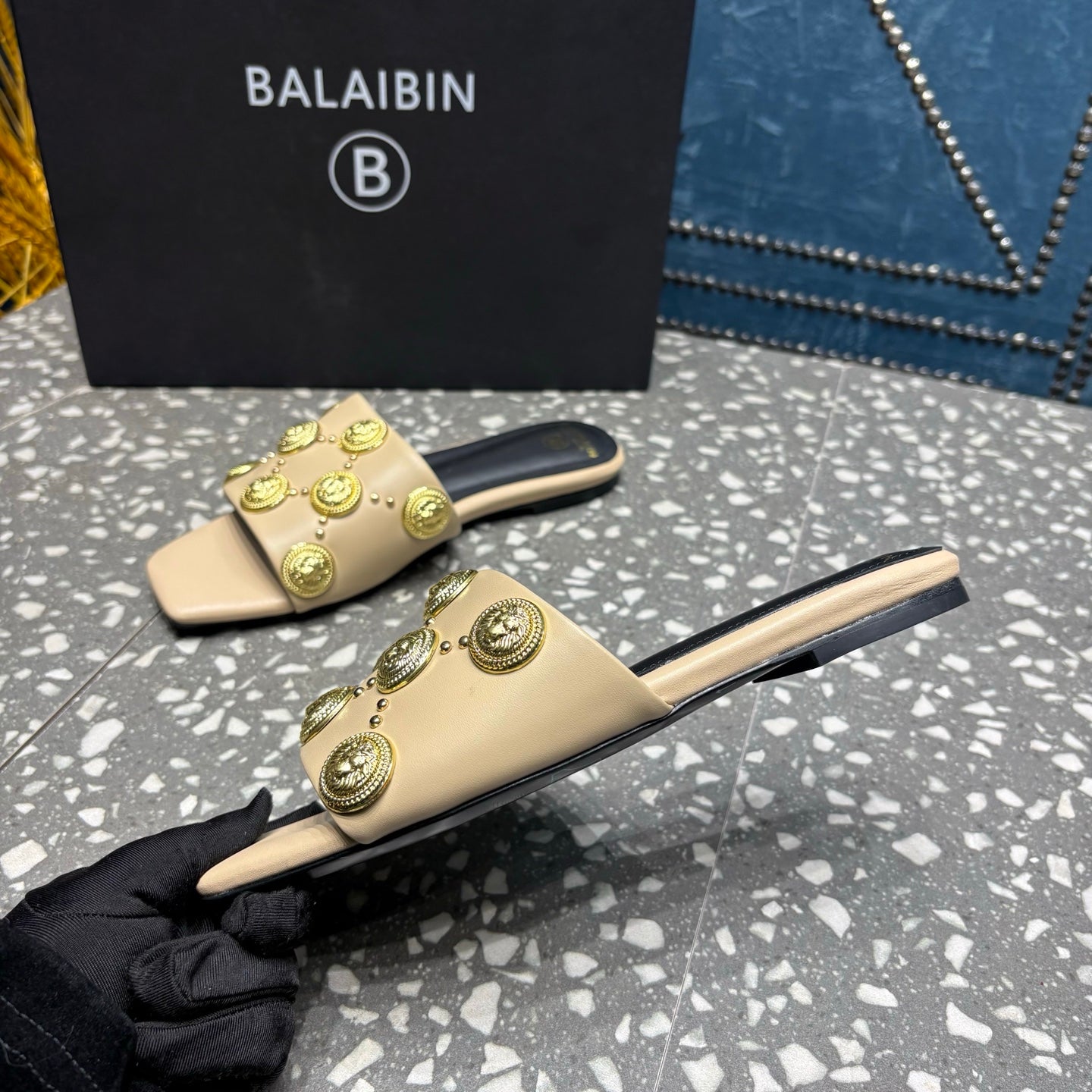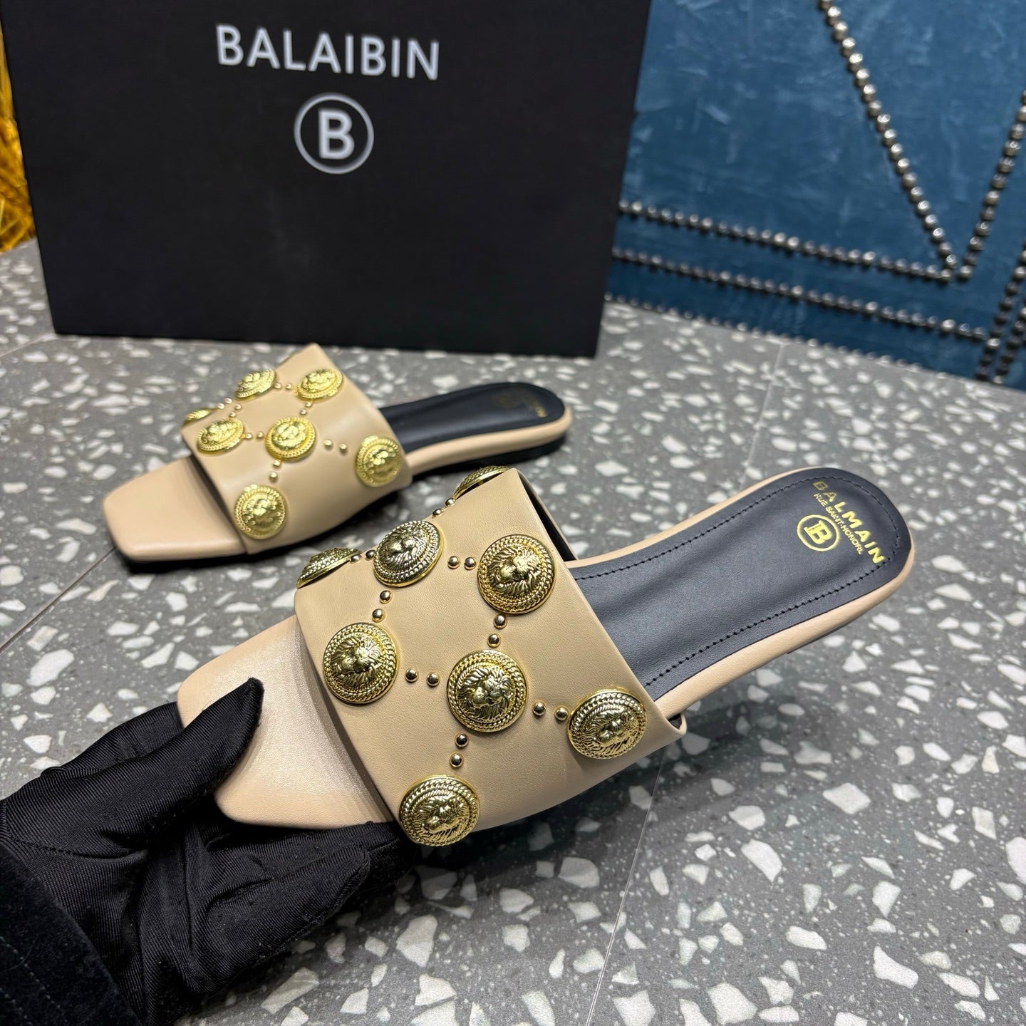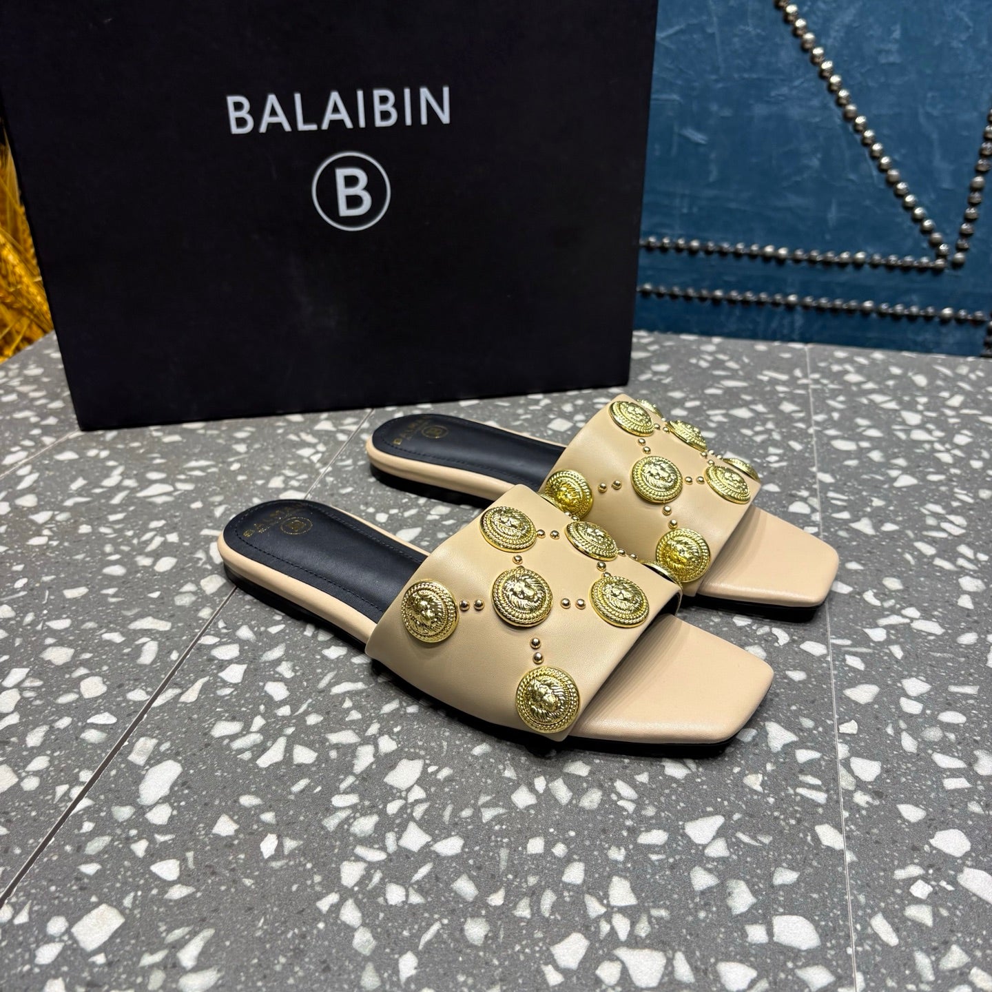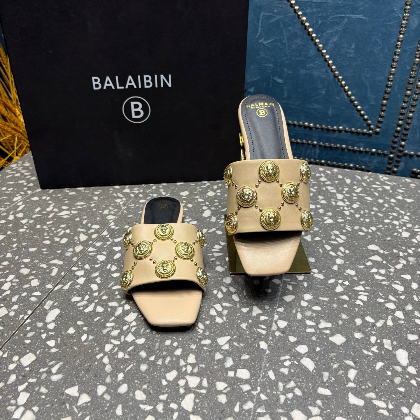 BALMAIN 26S SLIPPERS IN BEIGE CALFSKIN WITH GOLD HARDWARE
