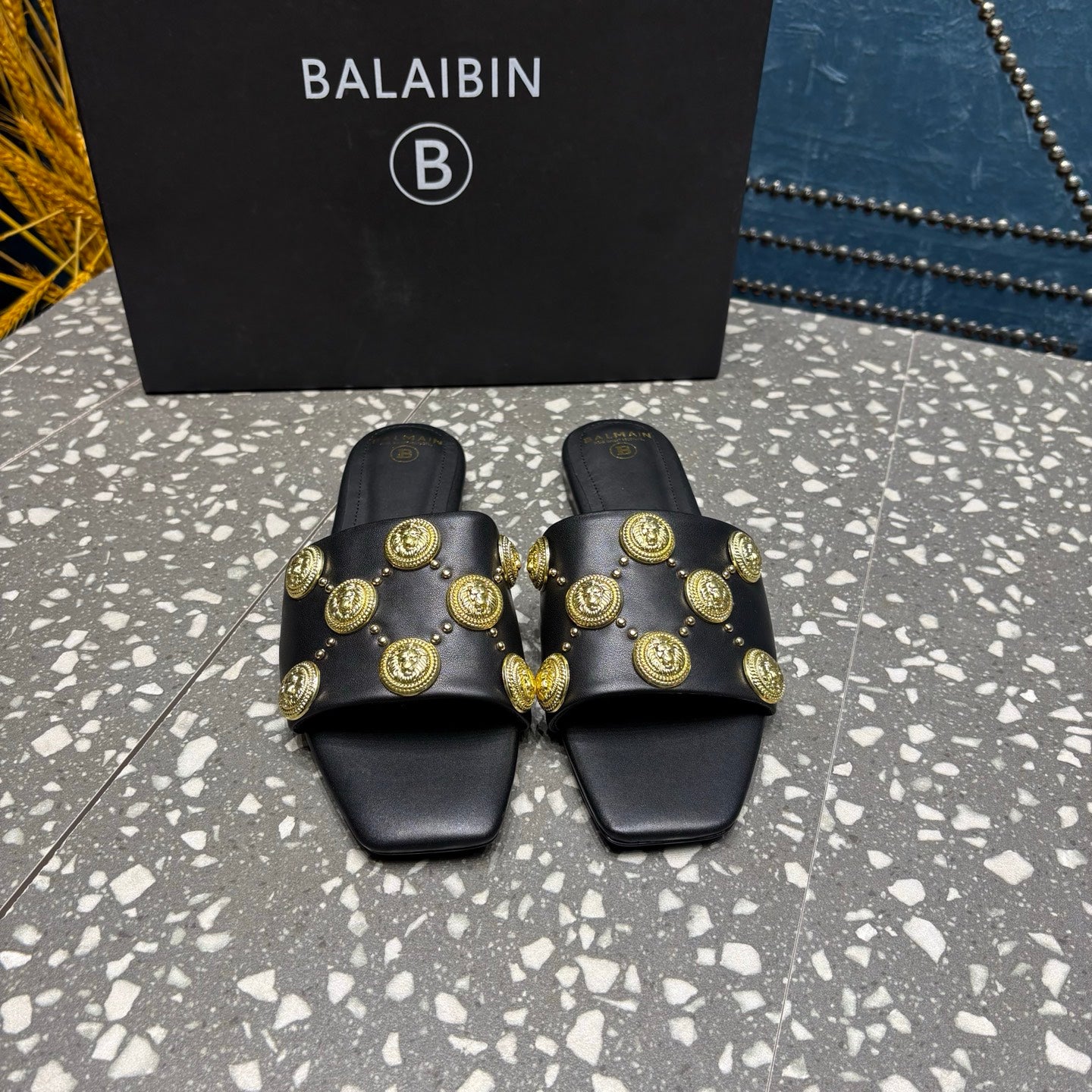 BALMAIN 26S SLIPPERS IN BLACK CALFSKIN WITH GOLD HARDWARE