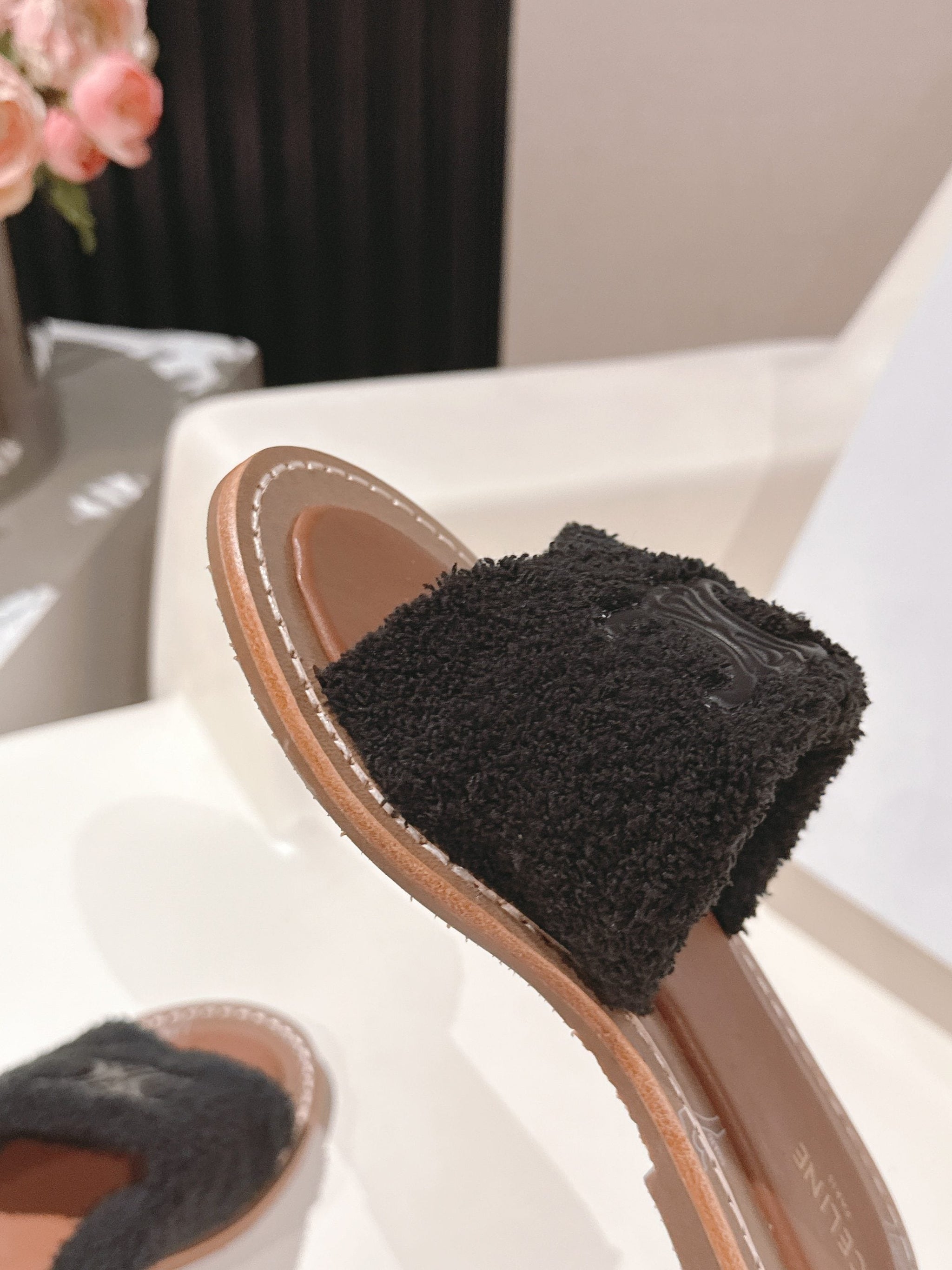 CELINE 25S LYMPIA TWISTED SANDAL IN BLACK SPONGE FABRIC