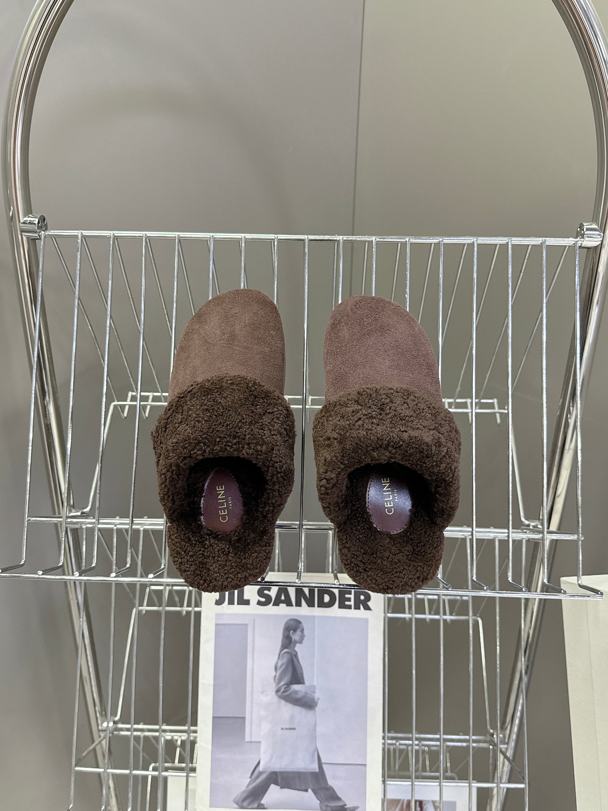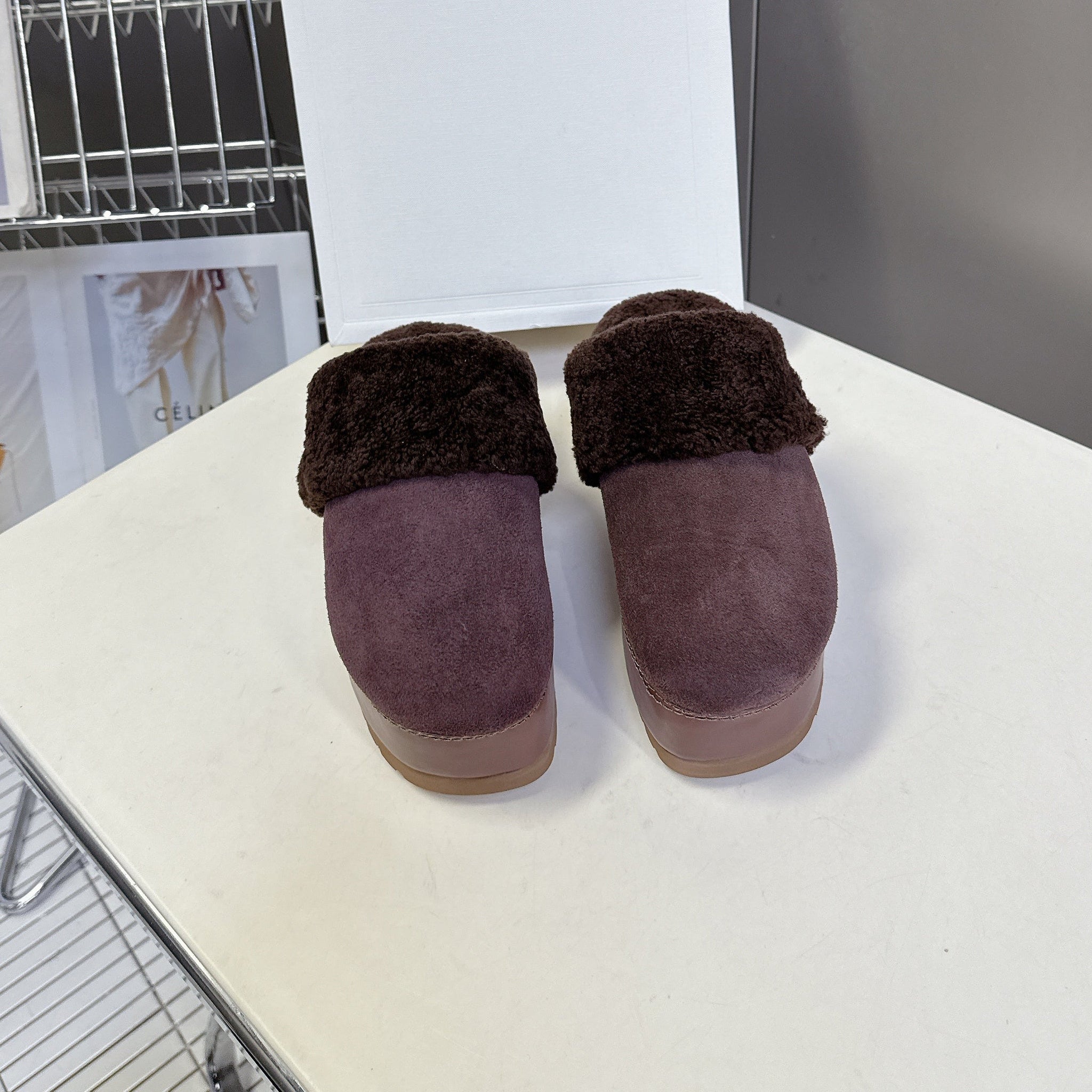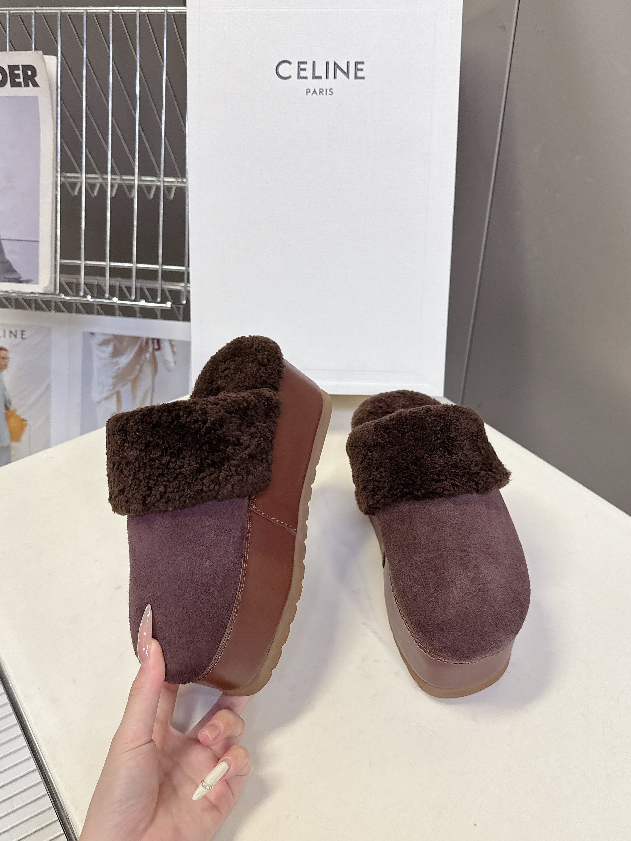 CELINE 26S WEDGE MULES IN PLUM BROWN SUEDE AND WOOL