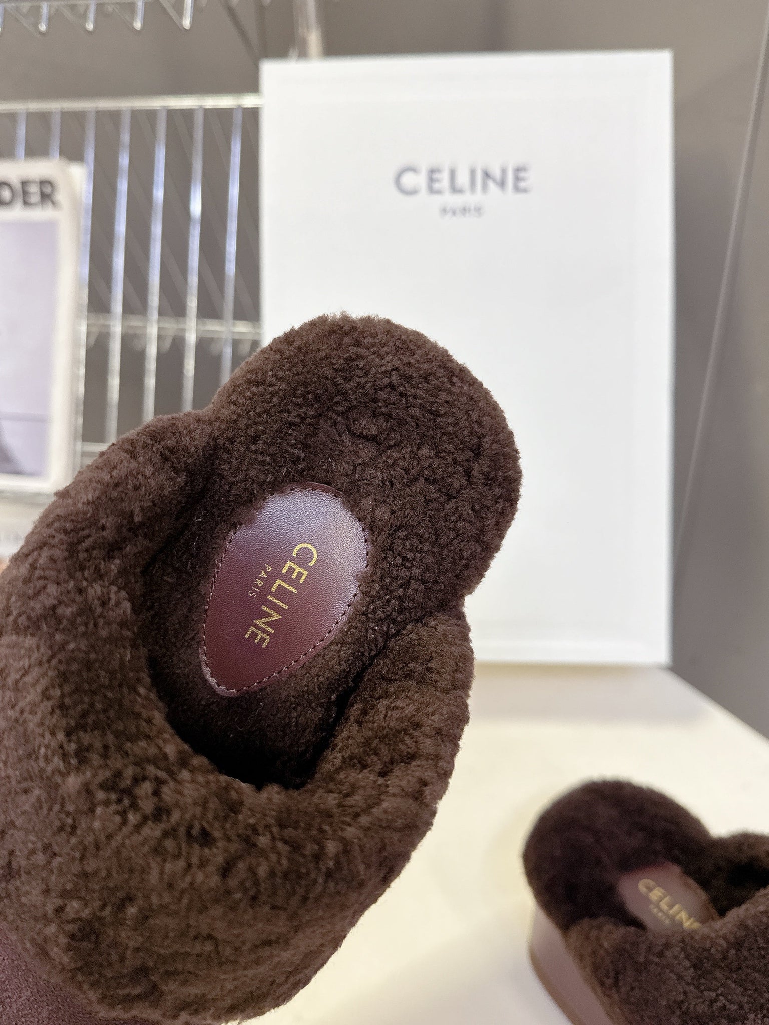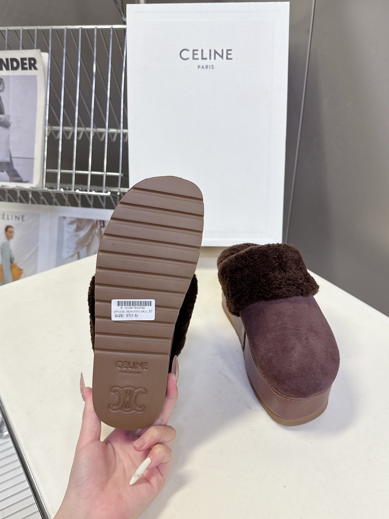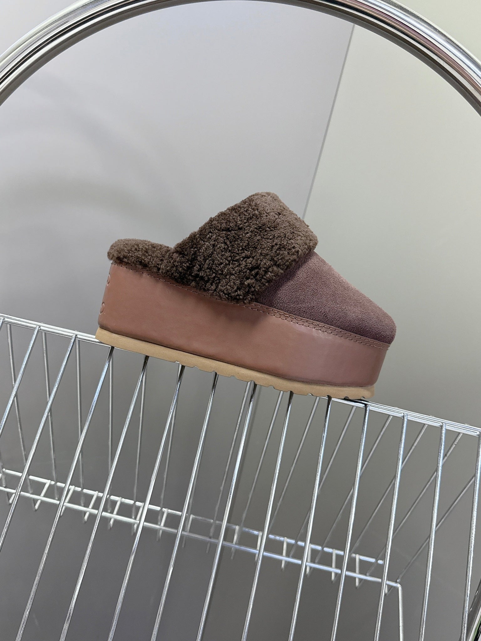CELINE 26S WEDGE MULES IN PLUM BROWN SUEDE AND WOOL