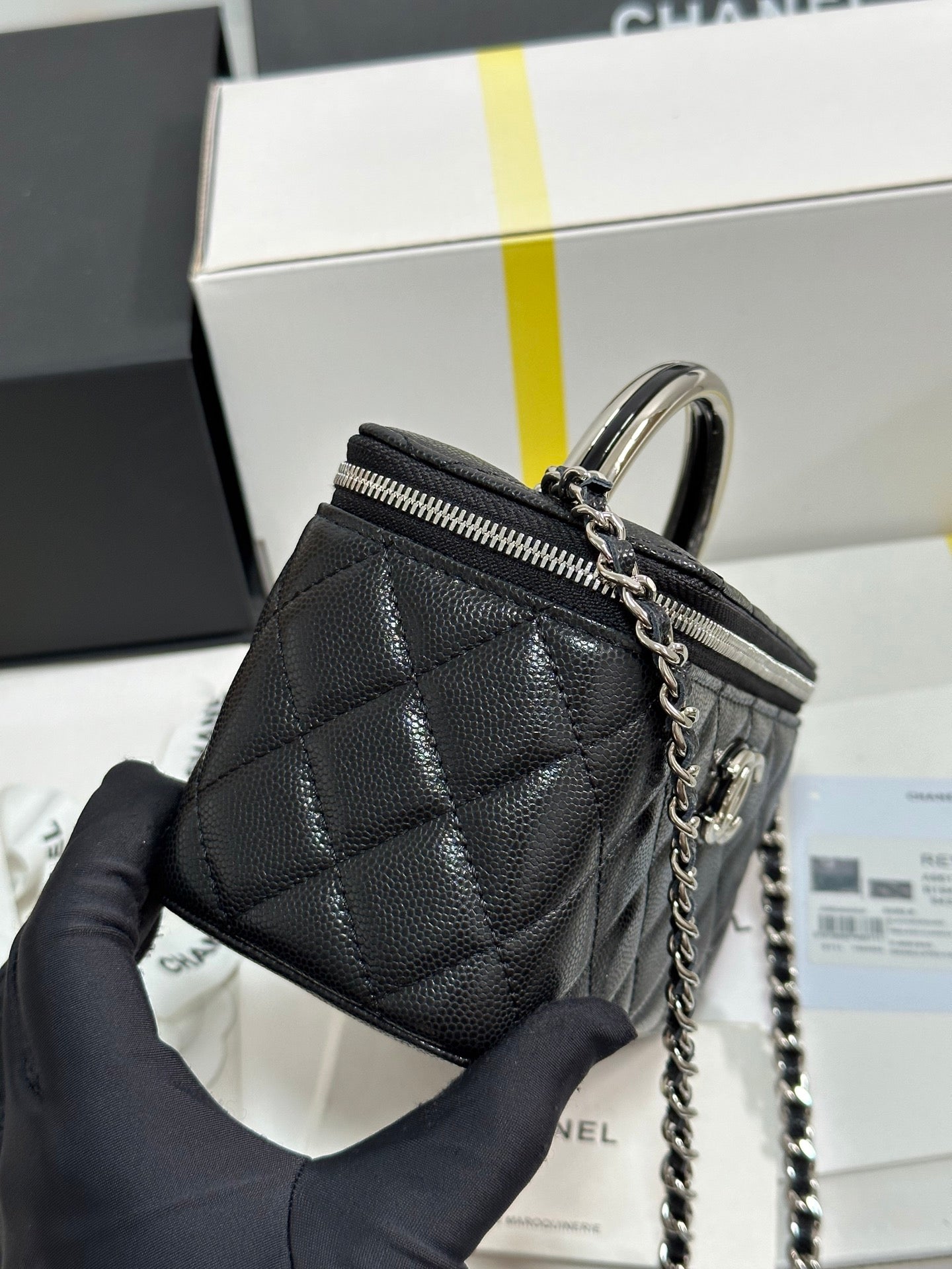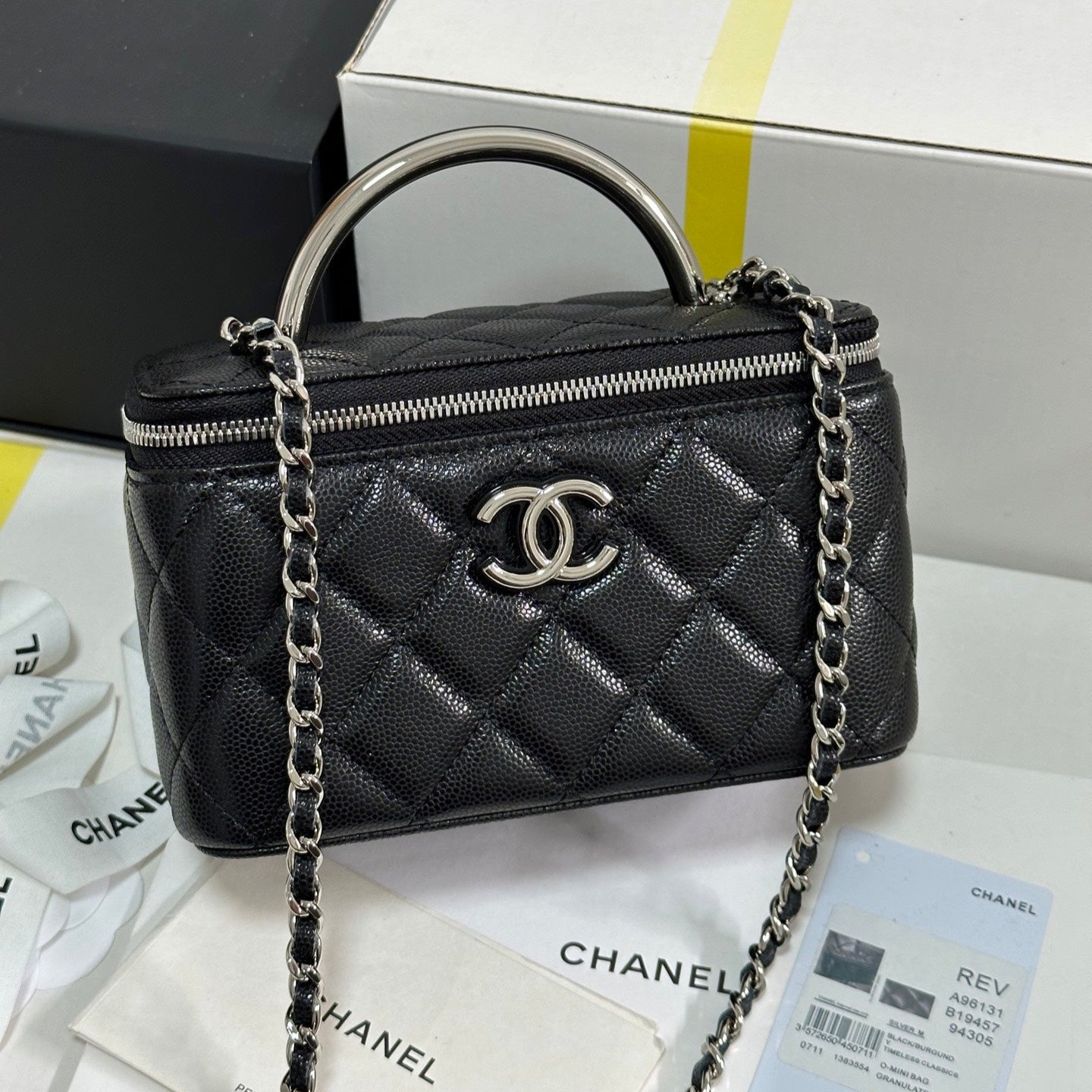 MINI VANITY TOP HANDLE CASE 17 IN BLACK CAVIAR SKIN SILVER-TONE PLATED METAL