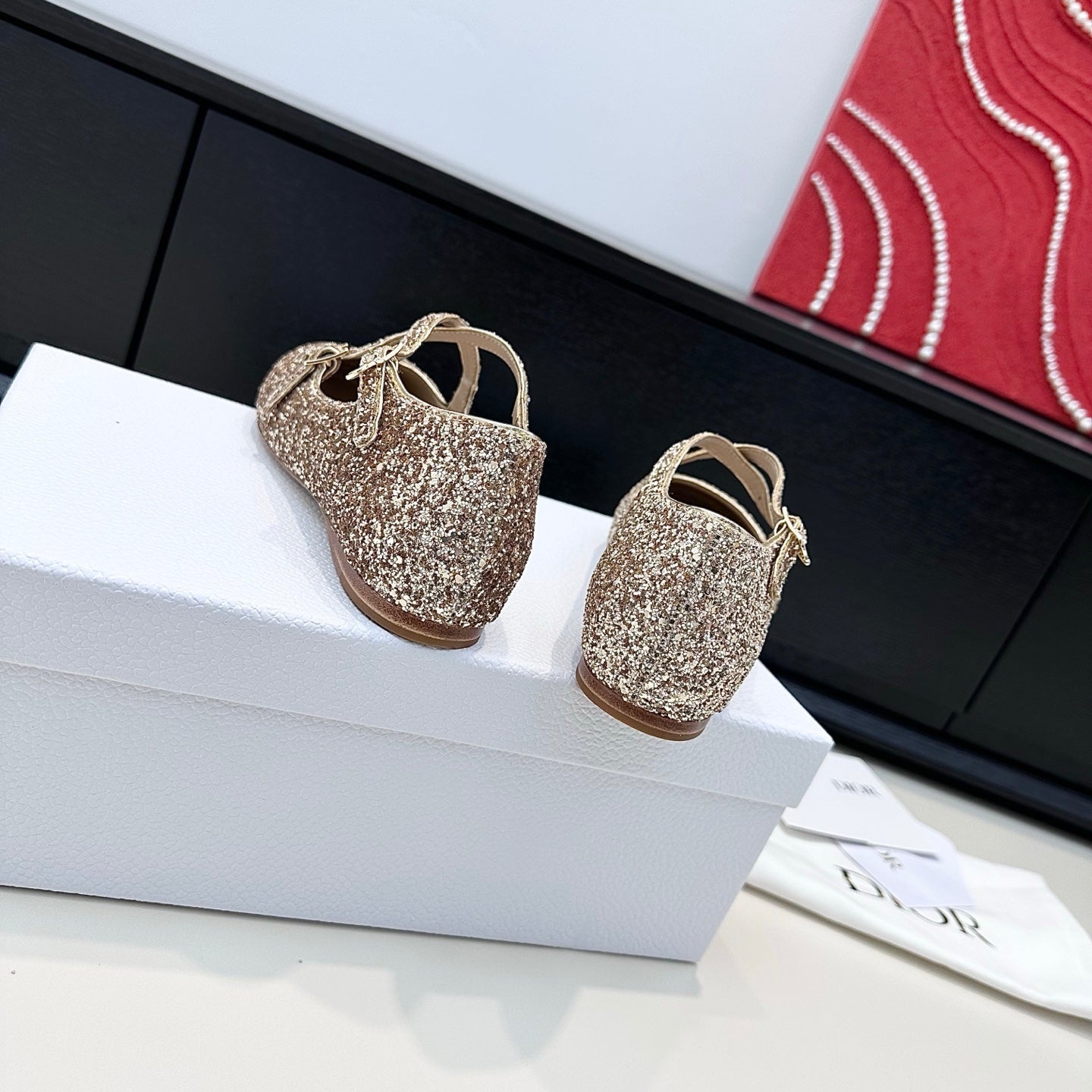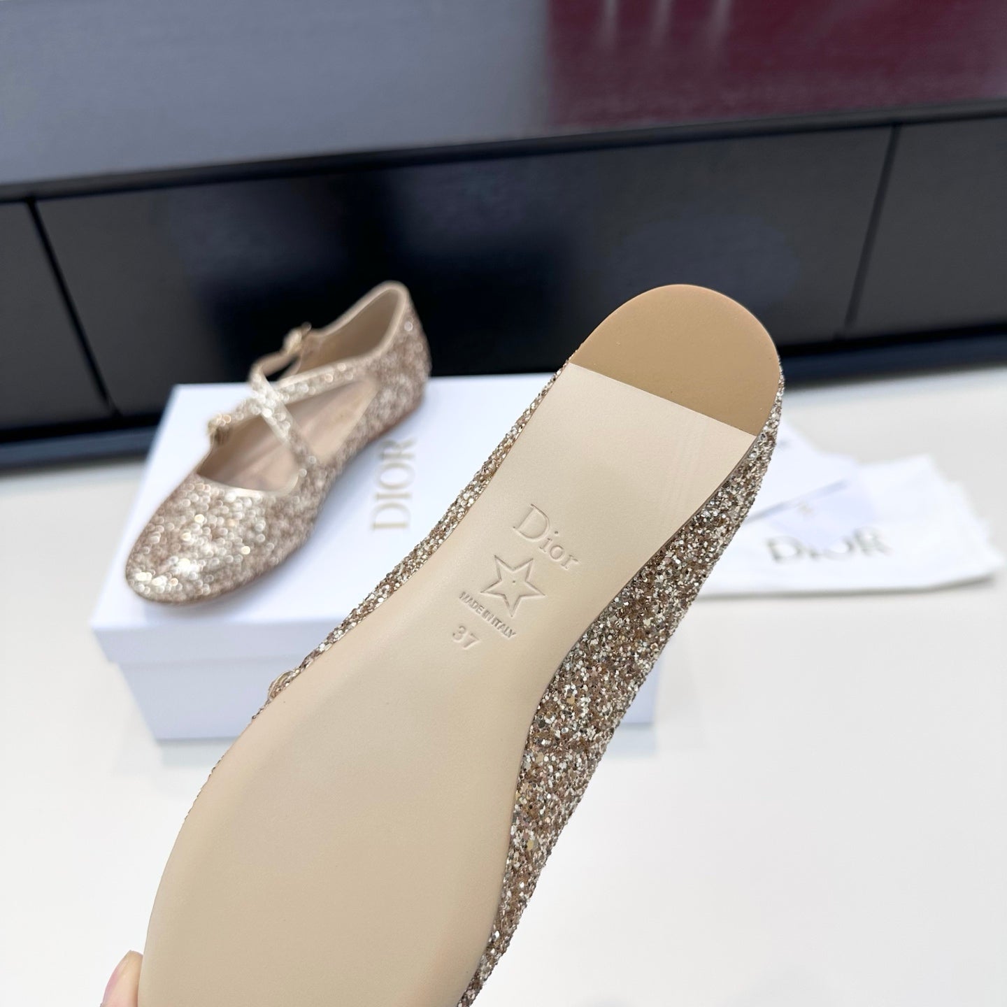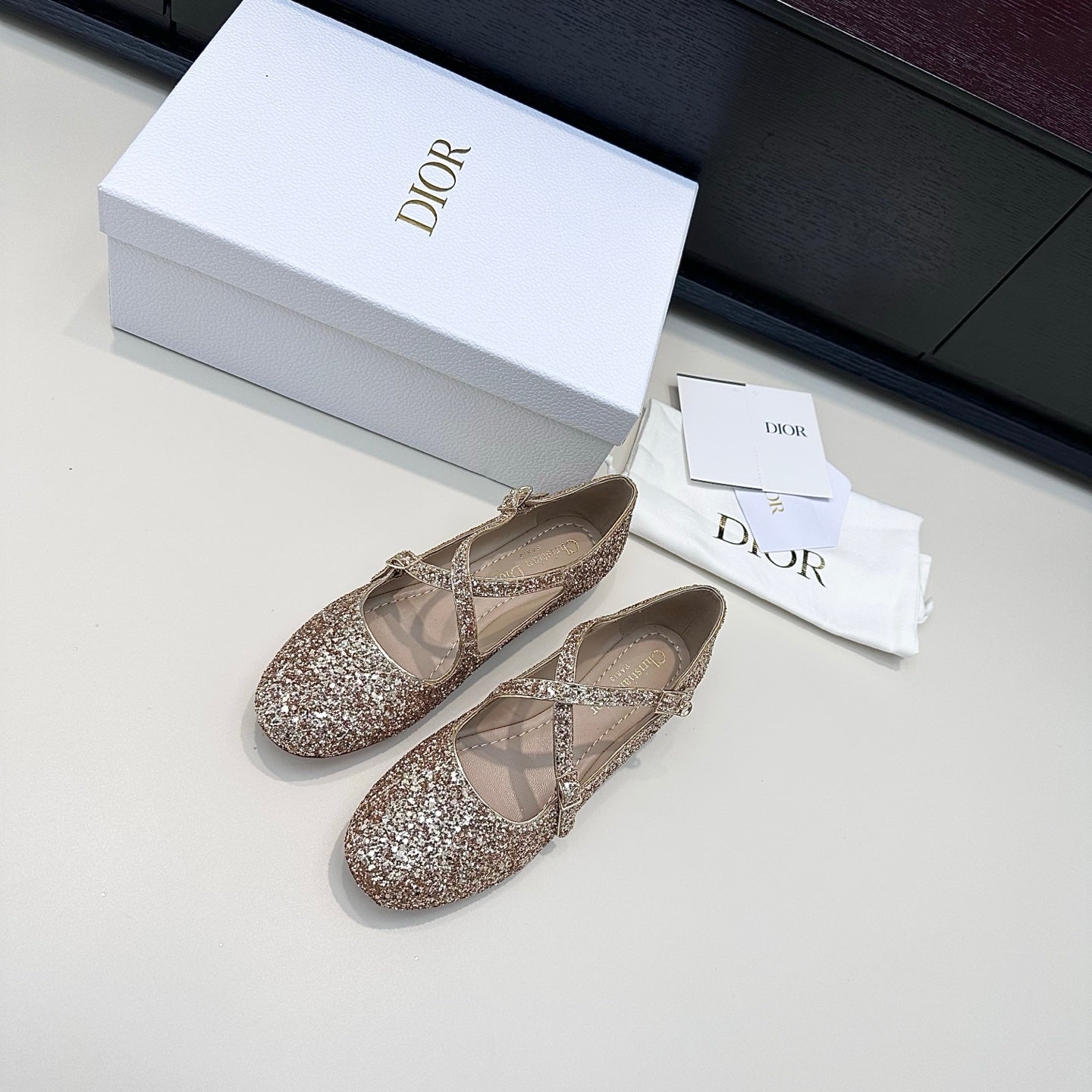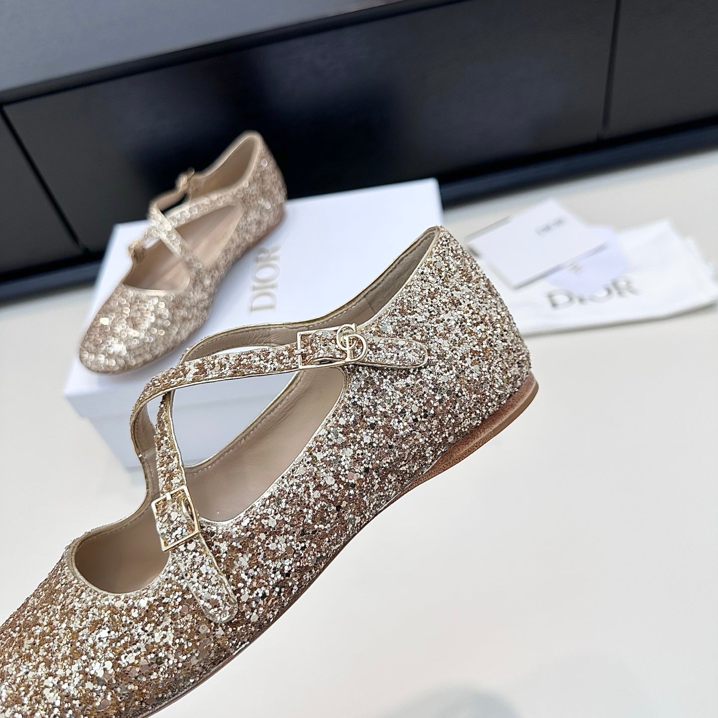 DIOR 26S BALLET FLAT IN GOLD LAMINATED LAMBSKIN AND GLITTER