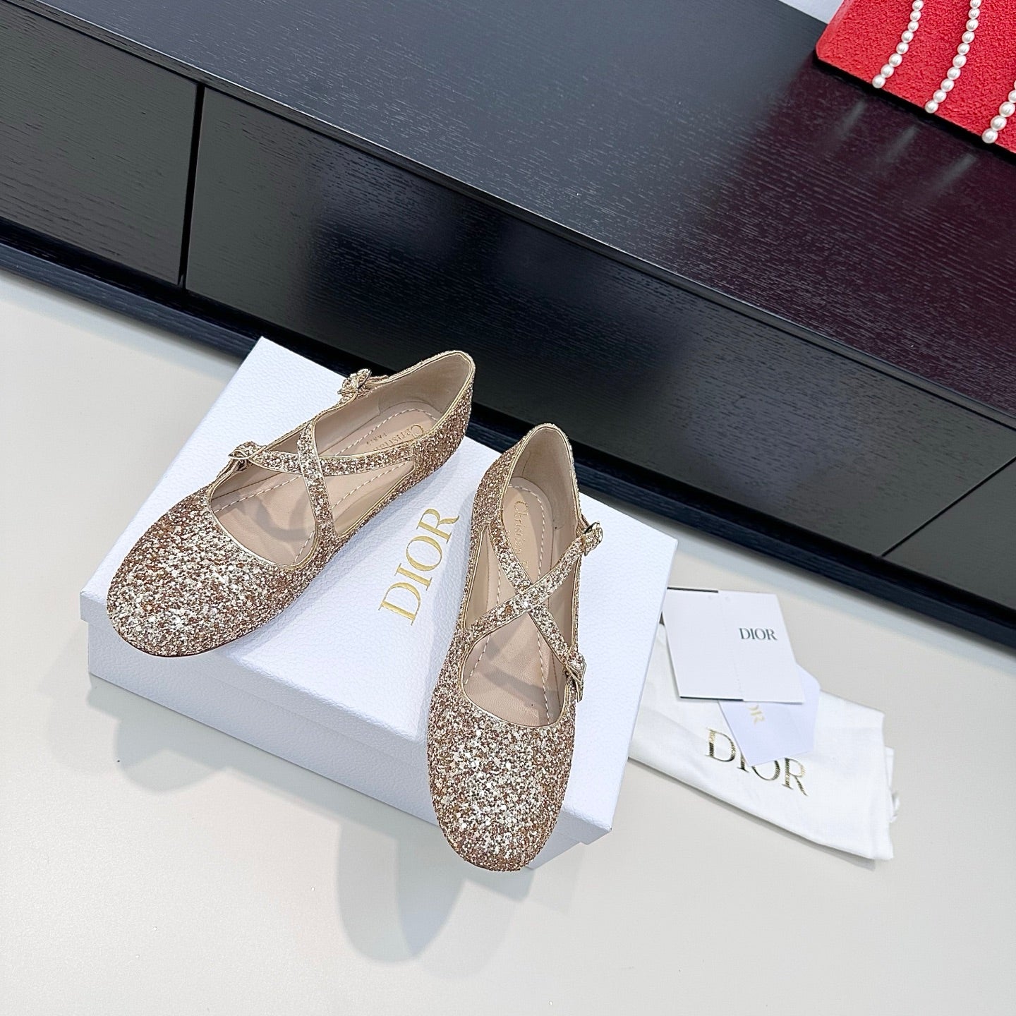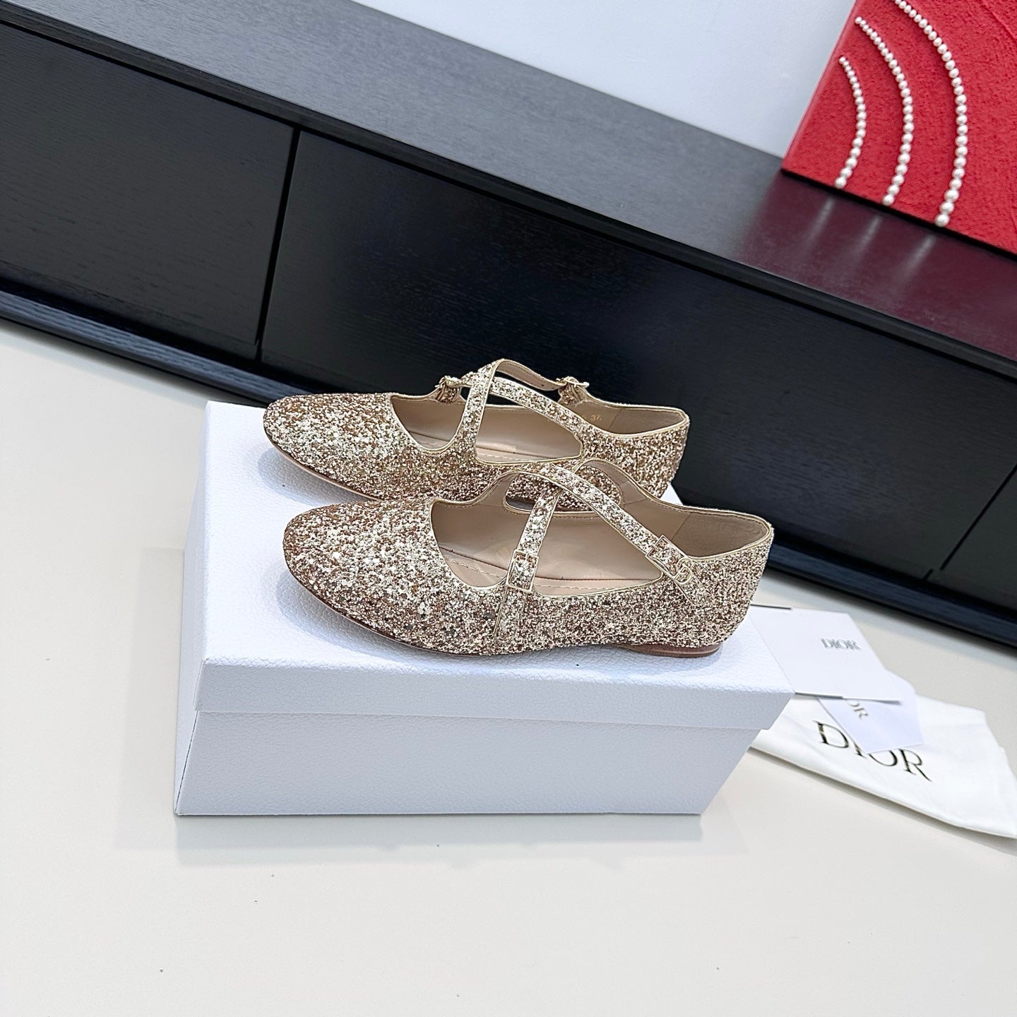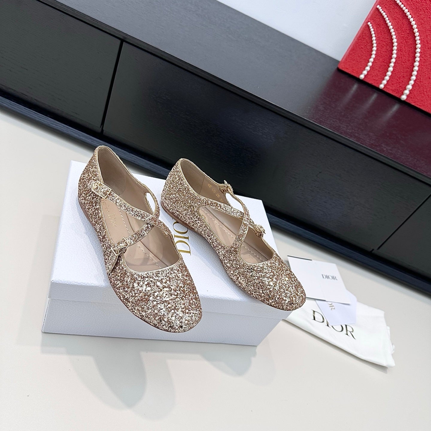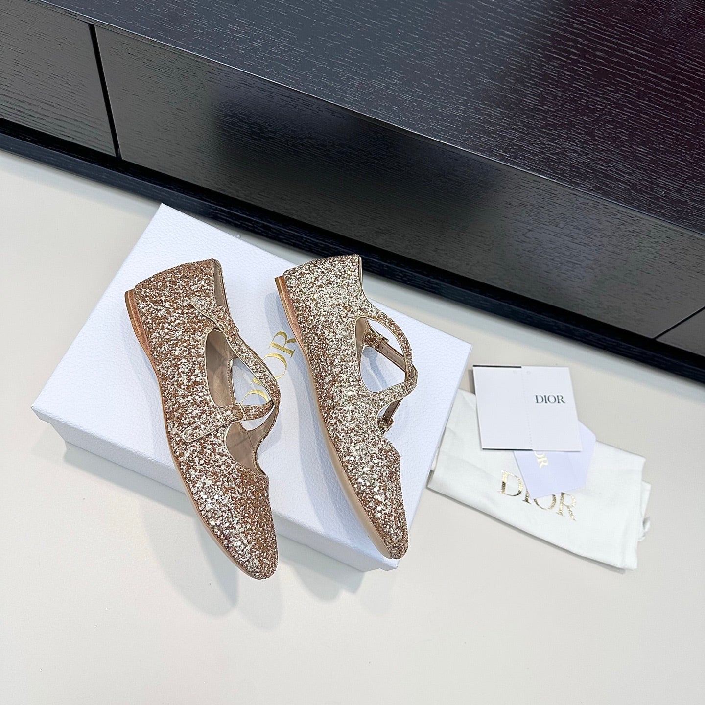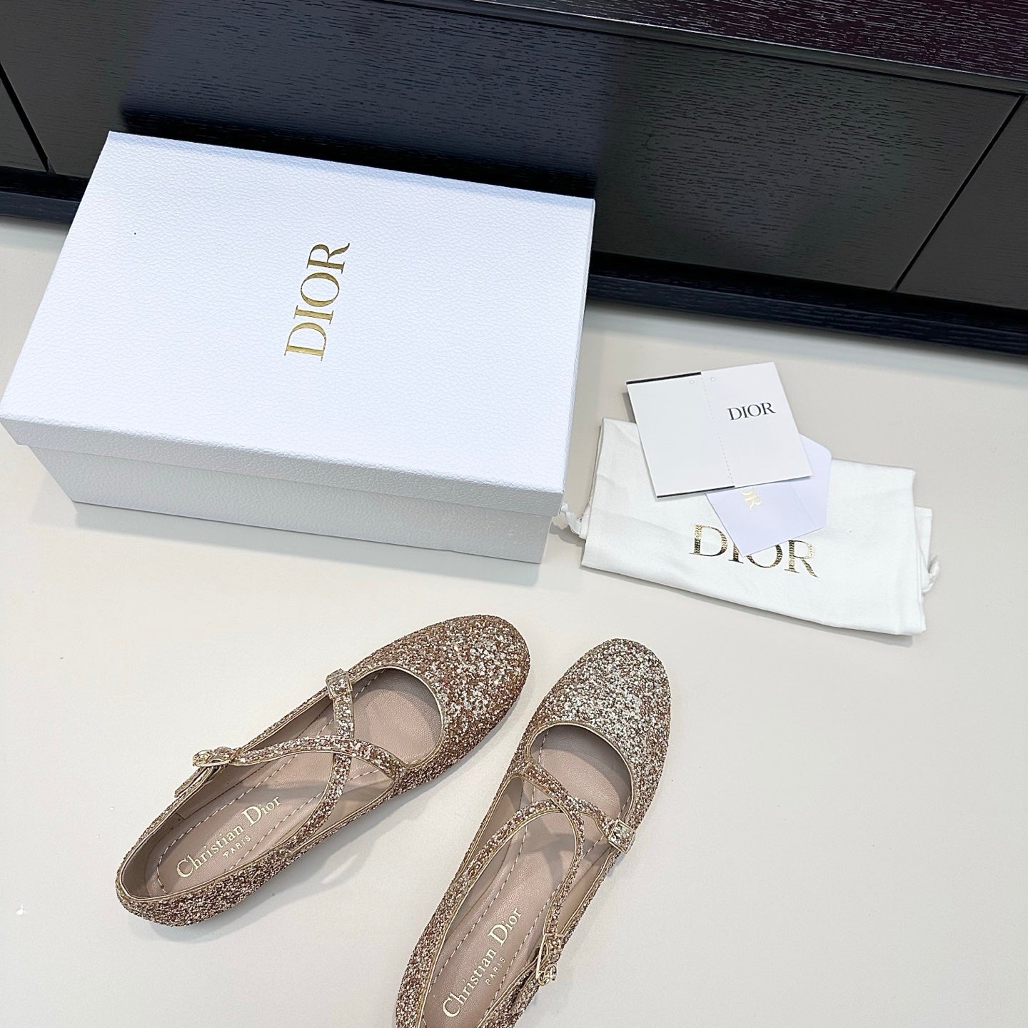 DIOR 26S BALLET FLAT IN GOLD LAMINATED LAMBSKIN AND GLITTER