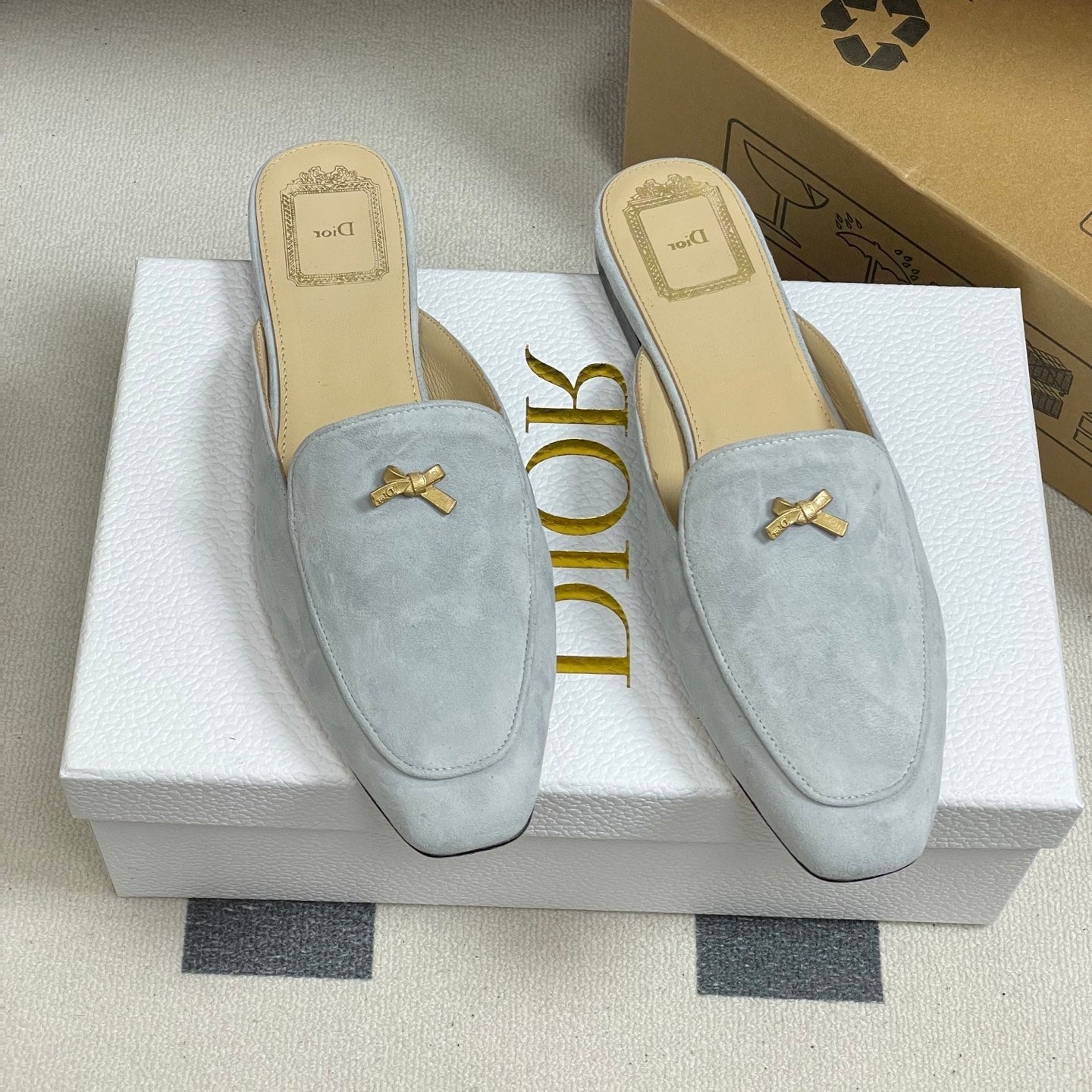 DIOR 26S MULES IN LIGHT BLUE GRAY SUEDE WITH BOW