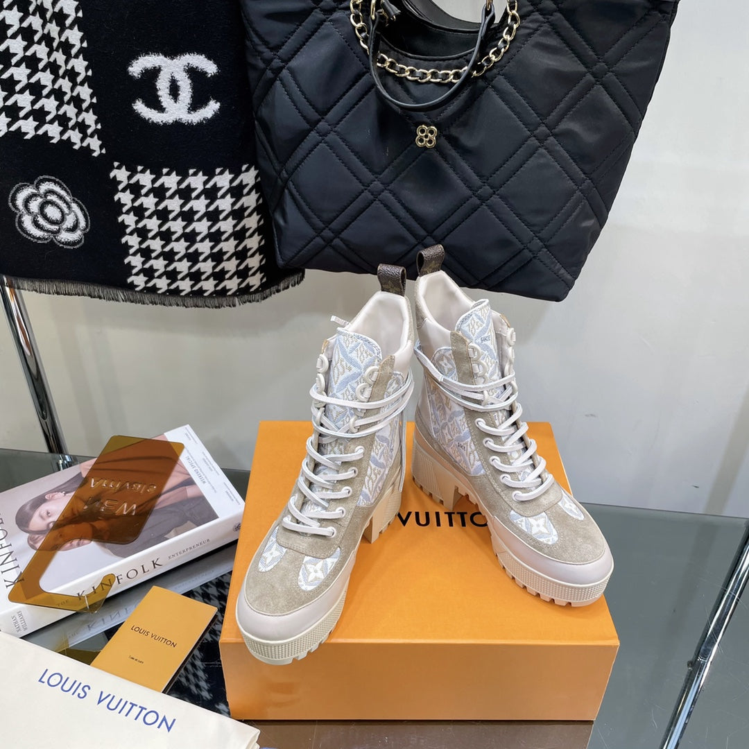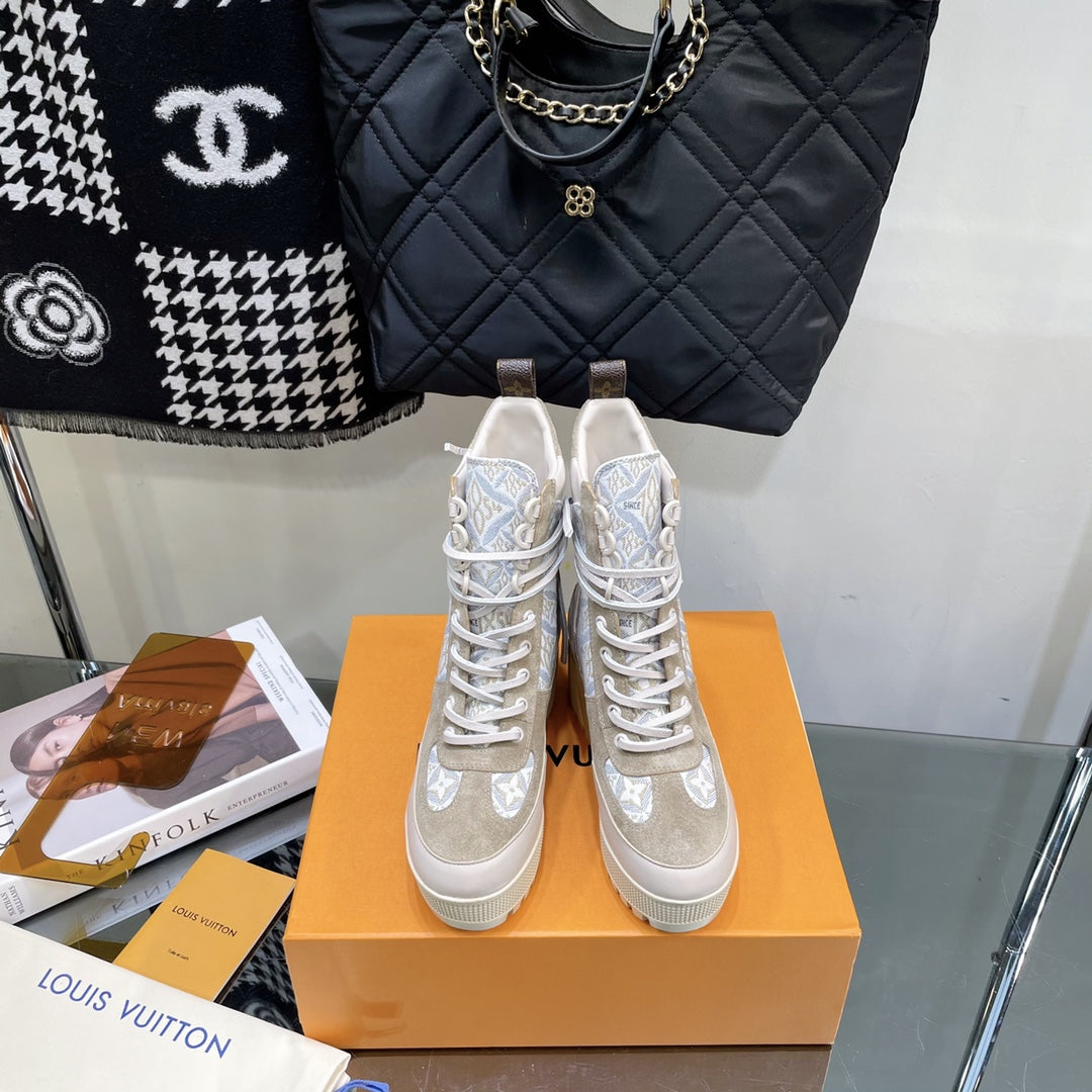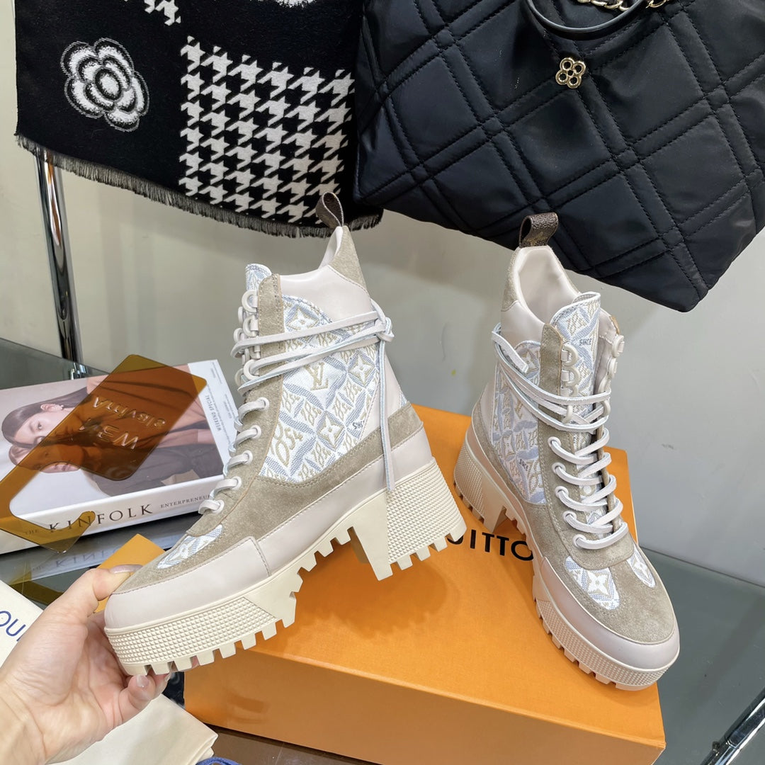 LAUREATE PLATFORM BOOTS IN OAT TAN SUEDE AND MONOGRAM JACQUARD PATTERN