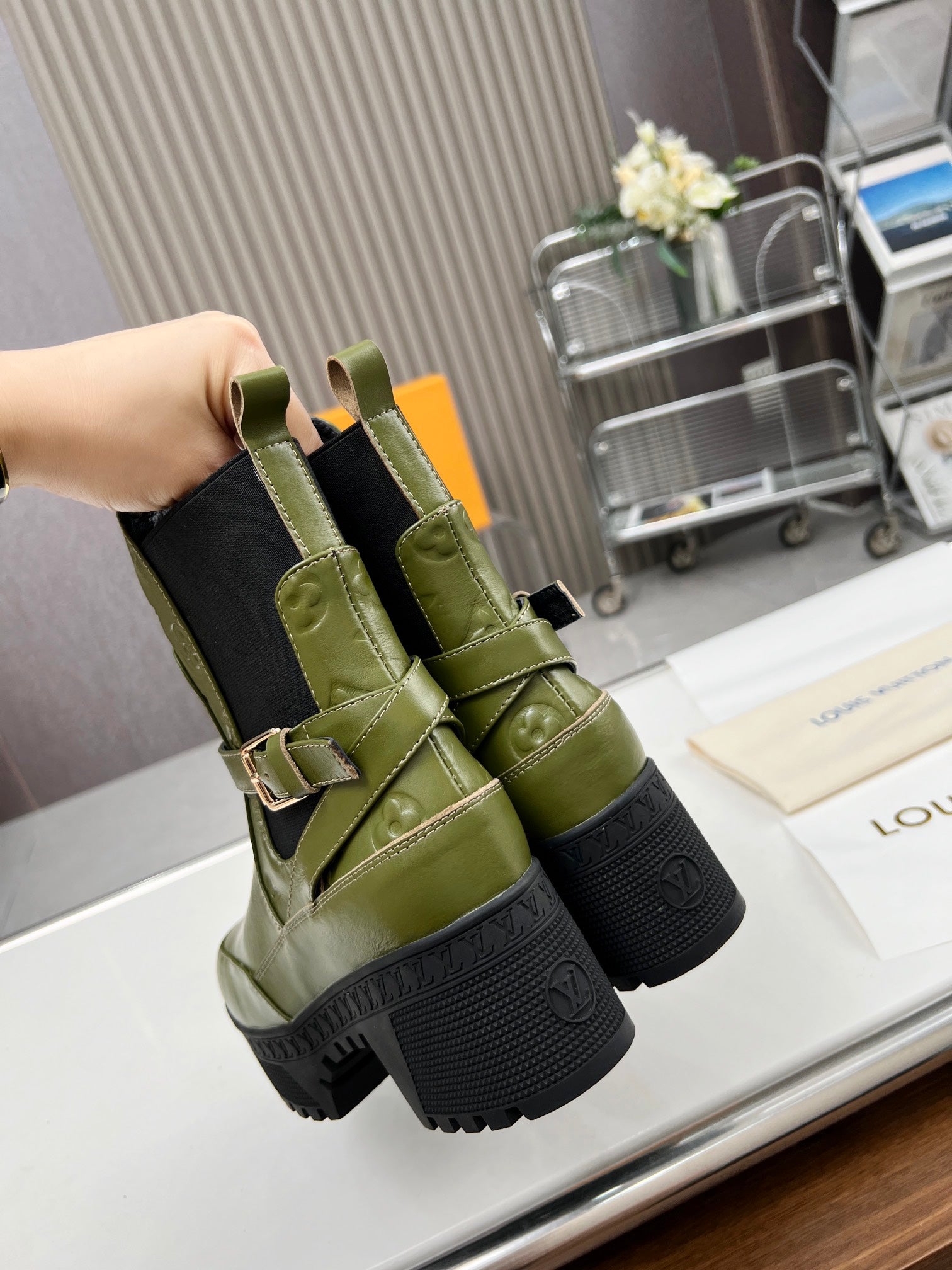 LAUREATE PLATFORM DESERT BOOT IN DARK OLIVE GREEN CALFSKIN
