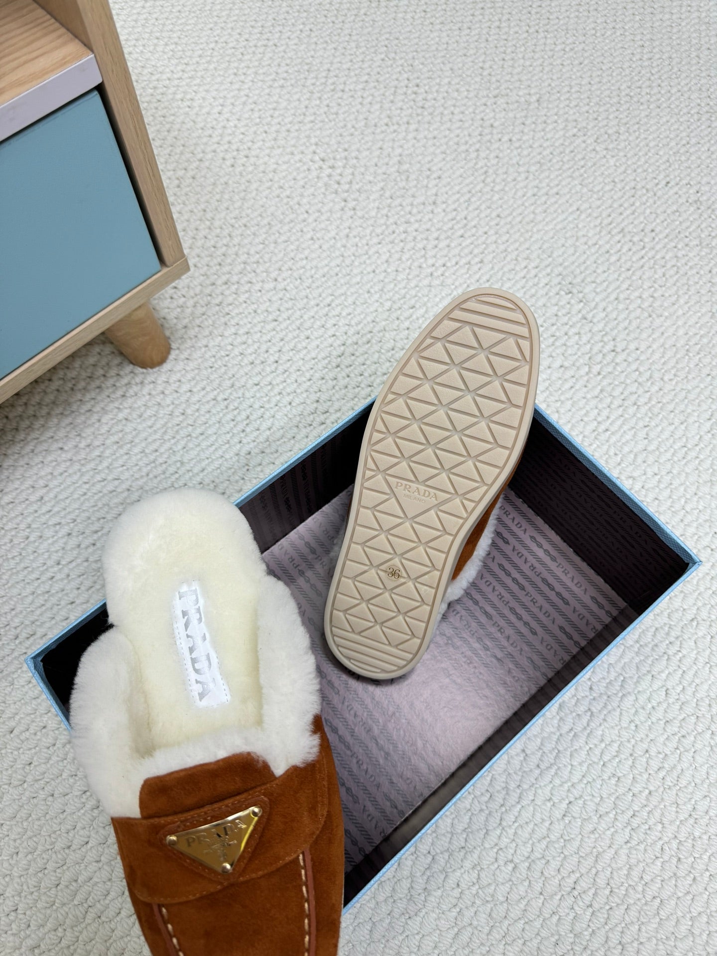 TRIANGLE LOGO FLATS IN RED BROWN SUEDE AND FUR LINING