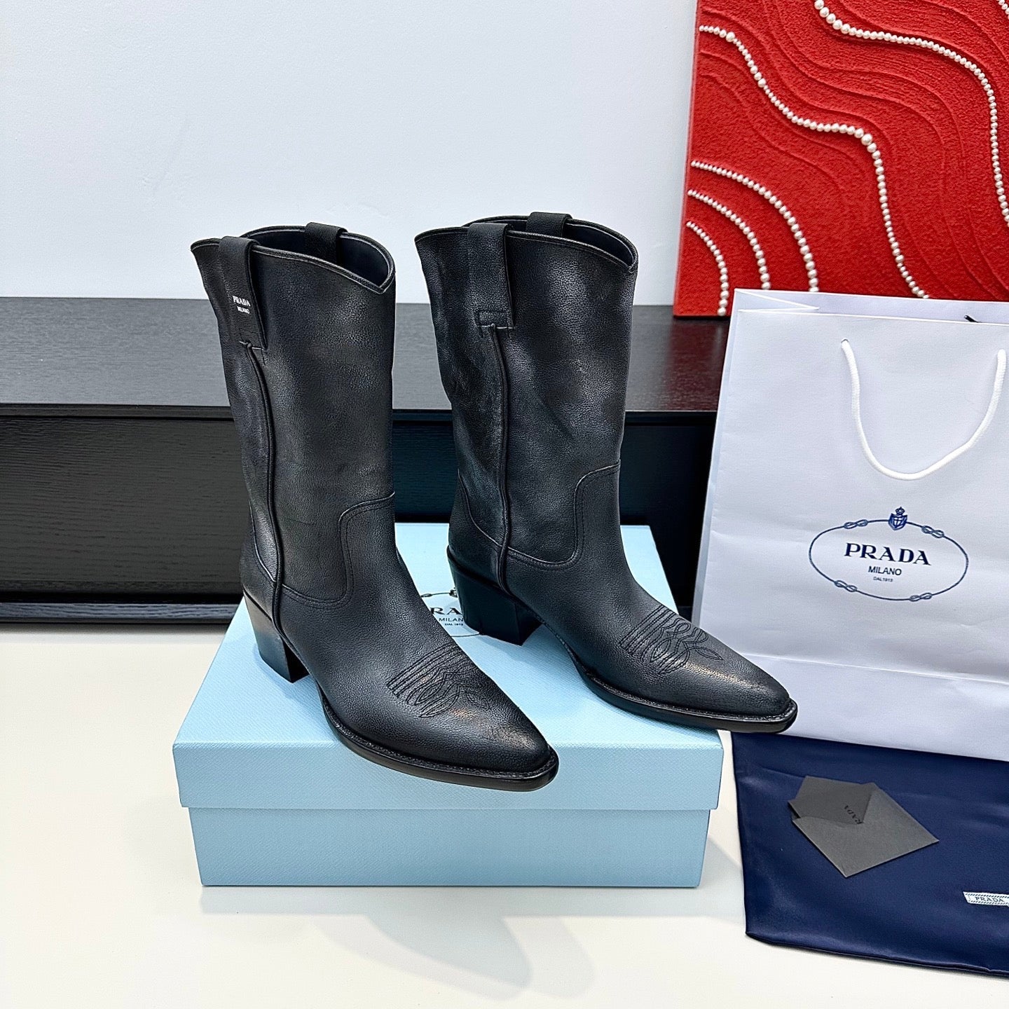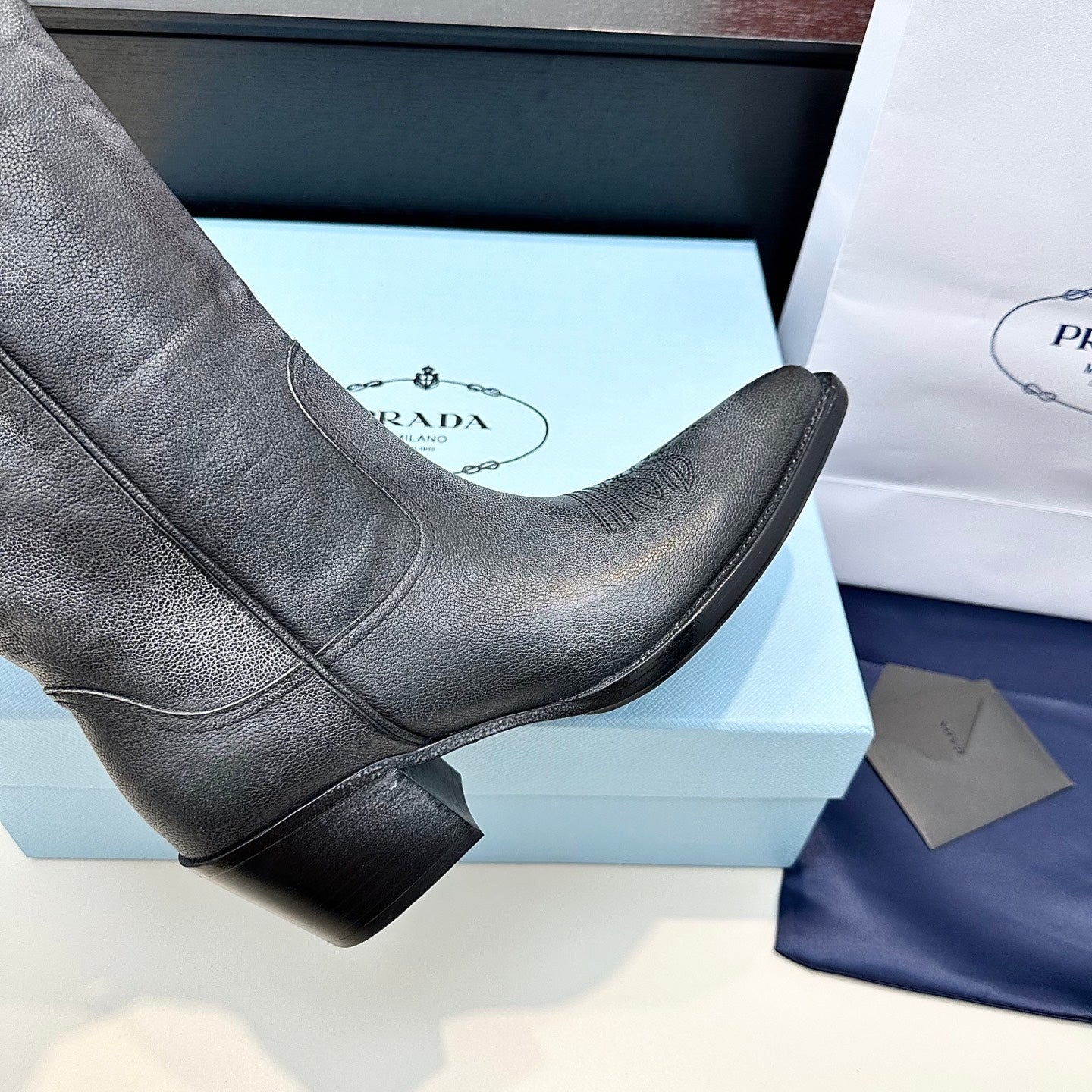 PRADA 25S POINTED-TOE LOW-CUT BOOTS IN BLACK COWHIDE