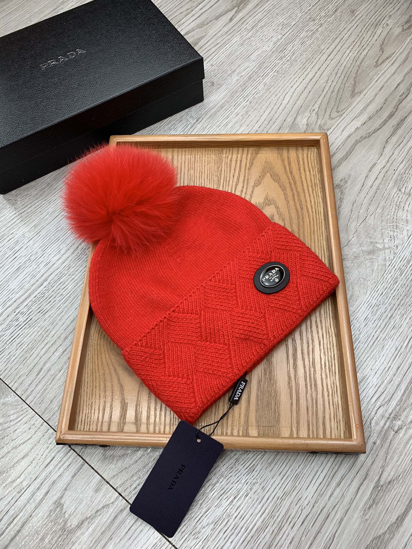 BEANIE HAT IN CHERRY RED WOOL AND RABBIT FUR 346718
