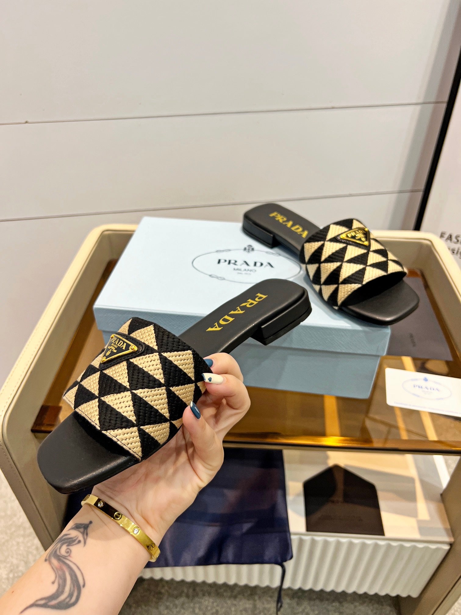 PRA EMBROIDERED SLIDES FLAT BLACK AND BEIGE FABRIC