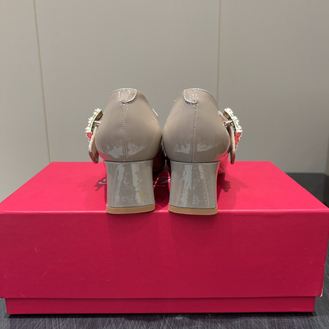 ROGER VIVIER 25S TRÈS VIVIER 50MM IN NUDE CALFSKIN WITH RHINESTONE BUCKLE