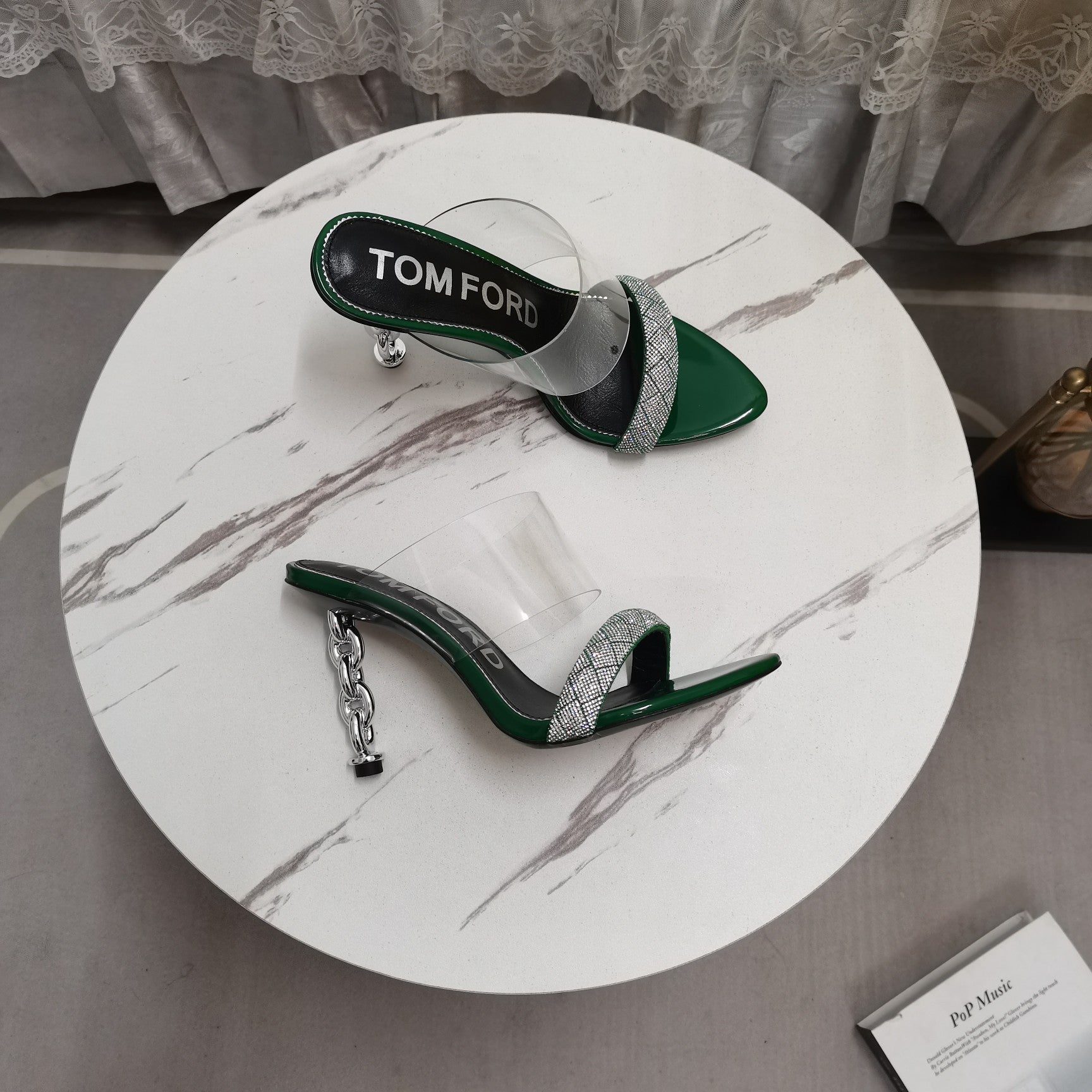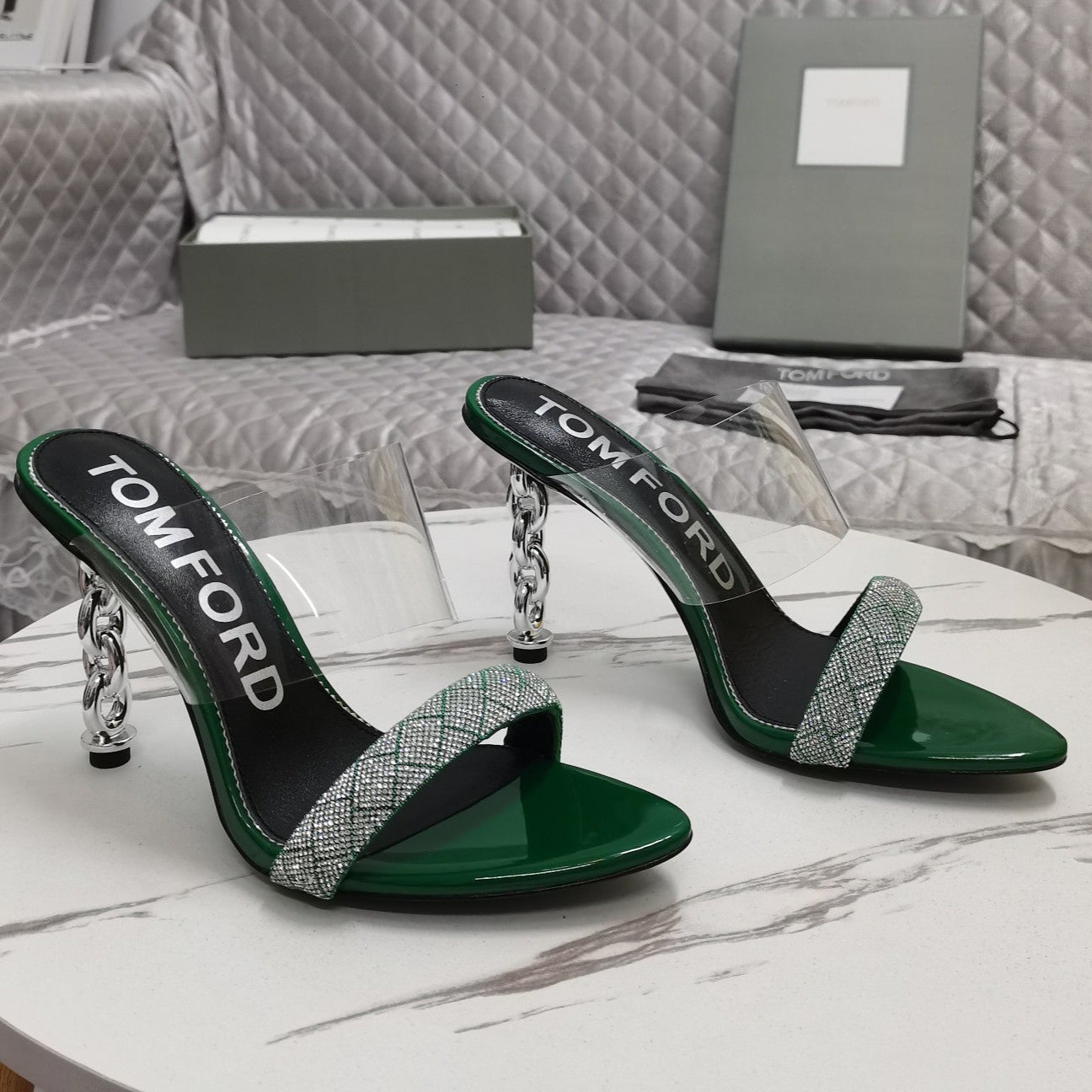 CRYSTAL HIGH HEEL MULE 10 CM IN GREEN FOREST LAMBSKIN