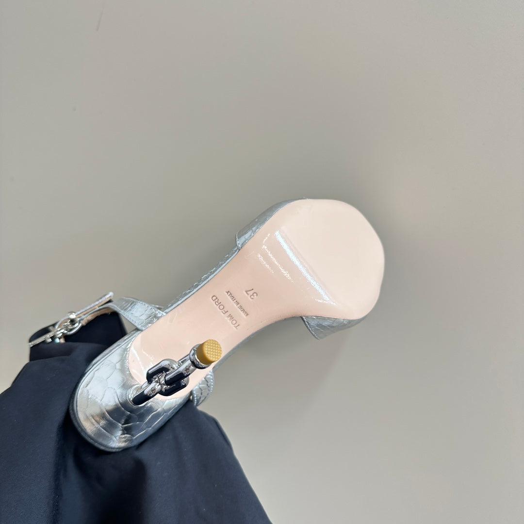 PADLOCK HIGH-HEELED SANDAL 10 CM IN SILVER SNAKESKIN