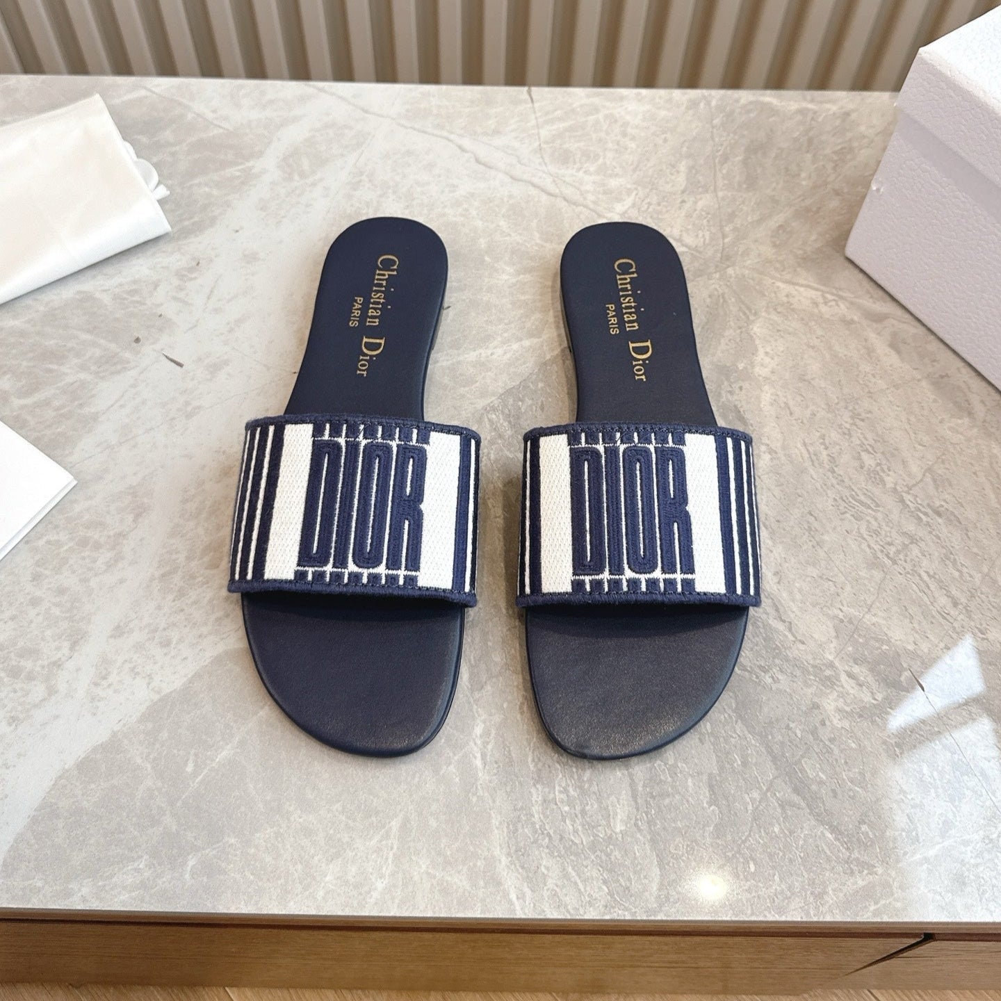 DIOR FLAT SLIDES 25S IN MIDNIGHT BLUE CALFSKIN AND FABRIC BRAND NAME EMBROIDERY
